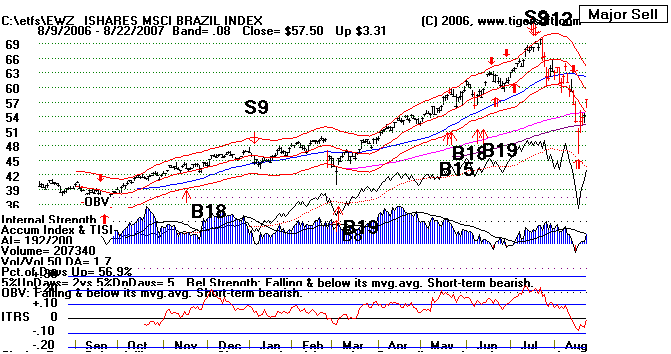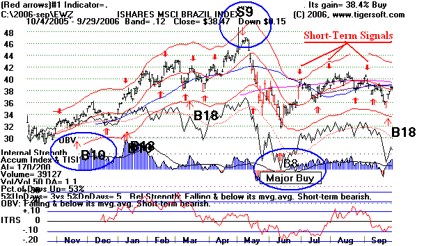 ![]() Call or write us today. (C) 2009 www.tigersoft.com 858-273-5900 william,_schmidt@hotmail.com PO Box 9491, San Diego, CA 92169 USE Tiger's PEERLESS TO TRADE FOREIGN ETFS Example: Peerless Signals Super-Imposed on 2008 Chart of EWZ - ETF for Brazil ![]() |
