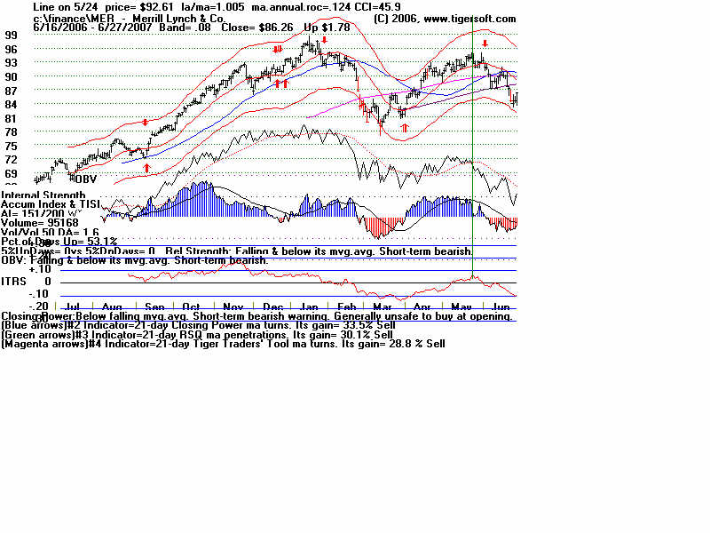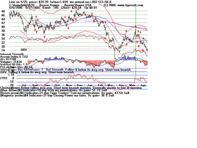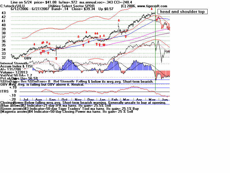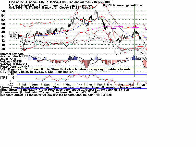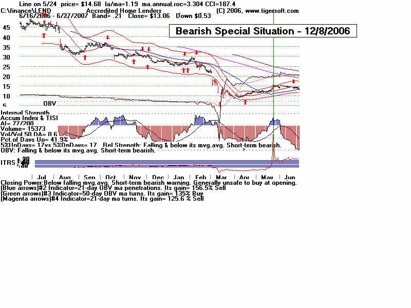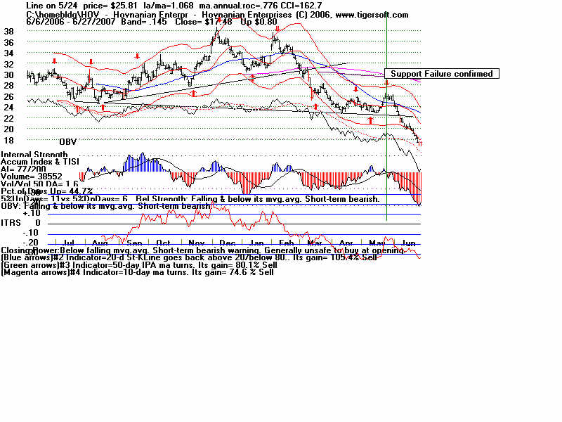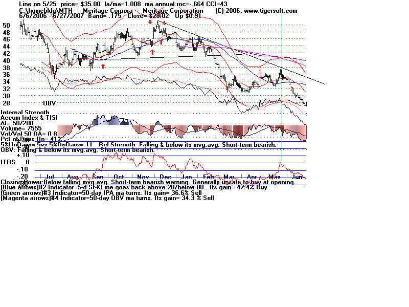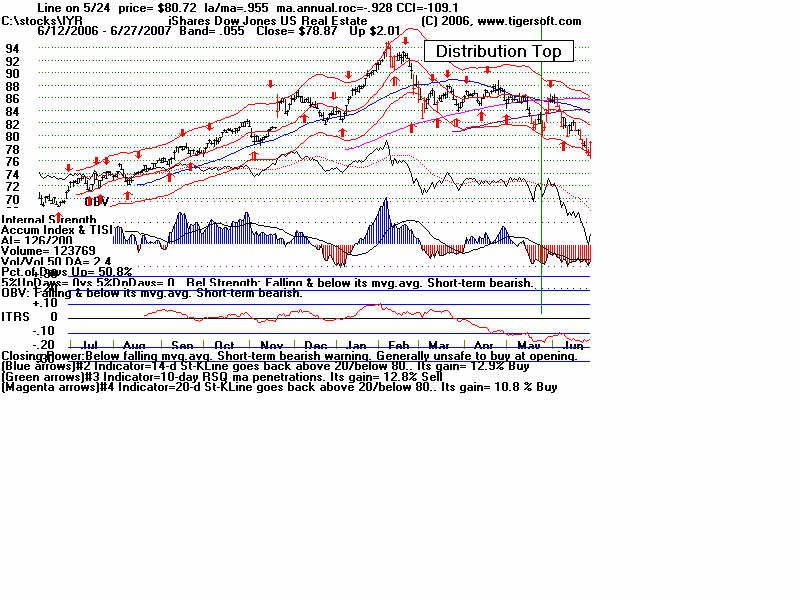 Wednesday - June 27, 2007 Watch the 2-year Treasury Notes (TU1620): Two-Year Notes Call The Tune for Housing and Finance Stocks. Traders should watch the 2-year Treasury notes. Many stock groups rise and fall in synch with short-term interest rates rates. I present data here to show how substantial the declines in just a month are for home-building and finance stocks when the Treasury Notes turn significantly weak Below is the chart for the year note's perpetual contract for 2-year Treasury Notes, as created by Dial Data. Keep in mind that as the 2-Year Treasury Notes rise in price interest rates are falling. In the chart below, you can see that there had been a rising channel of prices until mid-May, That is when the chart broke out of the bullish uptrend. And that is when Utility Stocks, Housing Stocks, Finance Stocks, Real Estate Investment Trusts, The Dollar, Gold and Bond Funds have started to weaken. As they weakened, the US markets turned soft. And the NYSE Advance-Decline Line turned down and the number of new lows start to rise sharply. Tiger Software users can watch this chart and allied charts closely. The dip of the Tiger Accumulation index in on April 10th to a new 12 month low was an early warning that this instrument, and all the investment vehicles tethered to it, would weaken. Note the trend-break of this vehicle's uptrend was on 5/24. Here are the charts of some of the investment vehicles ompacted by the change in trend of short-term interest rates. Recall from above that the trend-break of the Two-Year Notes was on 5/24. Housing stocks are, by far, the quickest to react. Utility Stocks: XLU (Utilities' ETF) fell from 41.08 to low of 39. Now 39.34 Housing Stocks Tiger Index of 31 Housing Stocks fell from 355 to 302 with today's close 5/24 6/26 HOV 25.81 17.48 32.3% decline MTH 35.00 28.02 19.9% decline BZH 35.35 28.54 19.3% decline LEN 45.87 37.86 17.5% decline Finance Stocks 5/24 6/26 CLAY 15.96 11.20 29.8% decline PVTB 33.03 27.01 18.2% decline MTG 65.20 57.90 11.2% decline LEND 14.68 13.06 11.0% decline MER 92.61 86.26 6.5% decline Real Estate IYR (Real Estate ETF) fell from 80.72 to a low of 76.5 and rallied to 78.87 today. Real Estate Investment Trusts VNQ (REIT ETF) had already formed bearish head and shoulders pattern. It fell from 74.12 on 5/24 to 70 before reversing today. 5/24 6/26 Euro 134.60 134.80 This topped out on 5/1 at its upper Tiger Regression channel. Br. Pound 198.57 199.57 (It will take more than talk by Fed of raising interest rates to strengthen the dollar versus the British Pound. Gold 64.75 63.76 Silver Stocks PAAS 26.34 25.66 SSRI 36.10 34.11 NEM 39.45 38.71 Bond Funds. LQD 106.22 104.08 Shares GS $ InvesTop Bond Fund - Biggest Bond Fund. - Our Nightly Hotline ($295/year) examines these charts and points out the inter-market relations. HOV, show below, was picked as a short sale on our Hotline. TigerSoft makes the business of profitable trading very easy. ![]() |