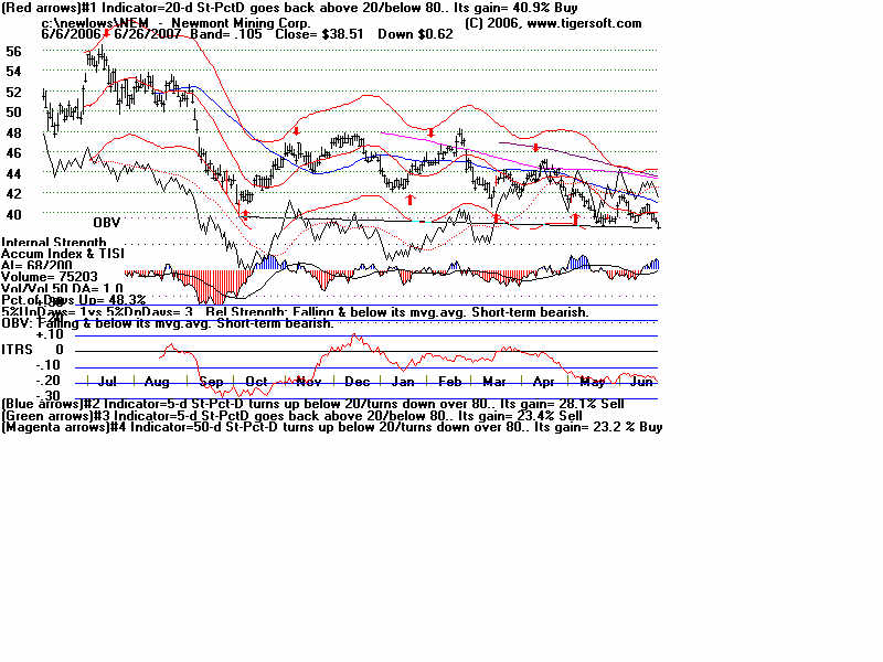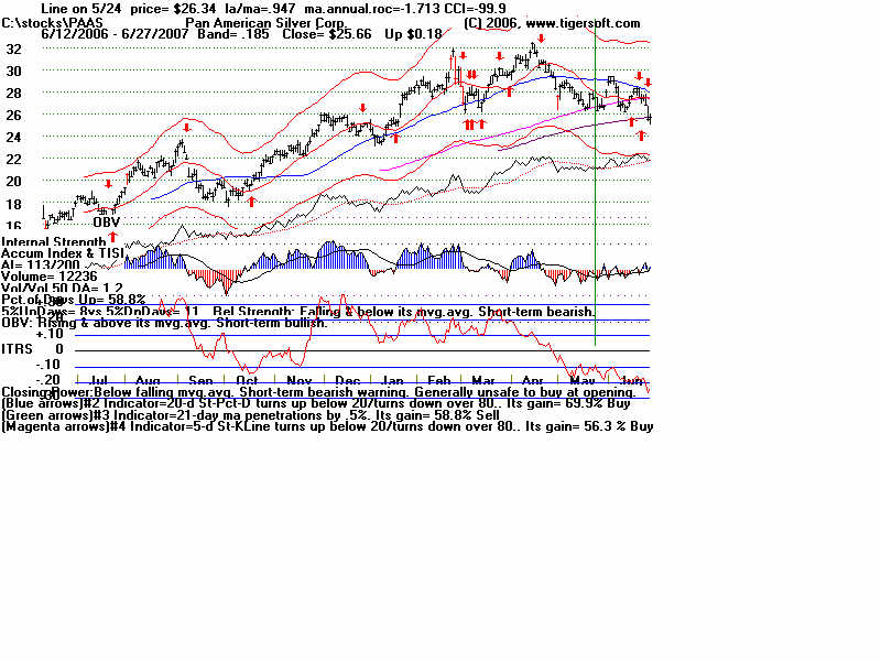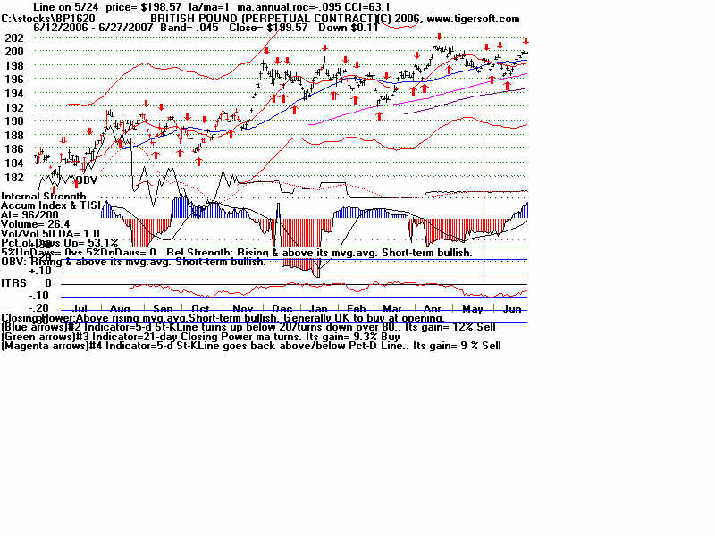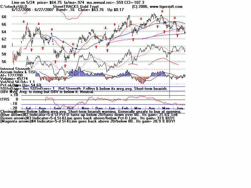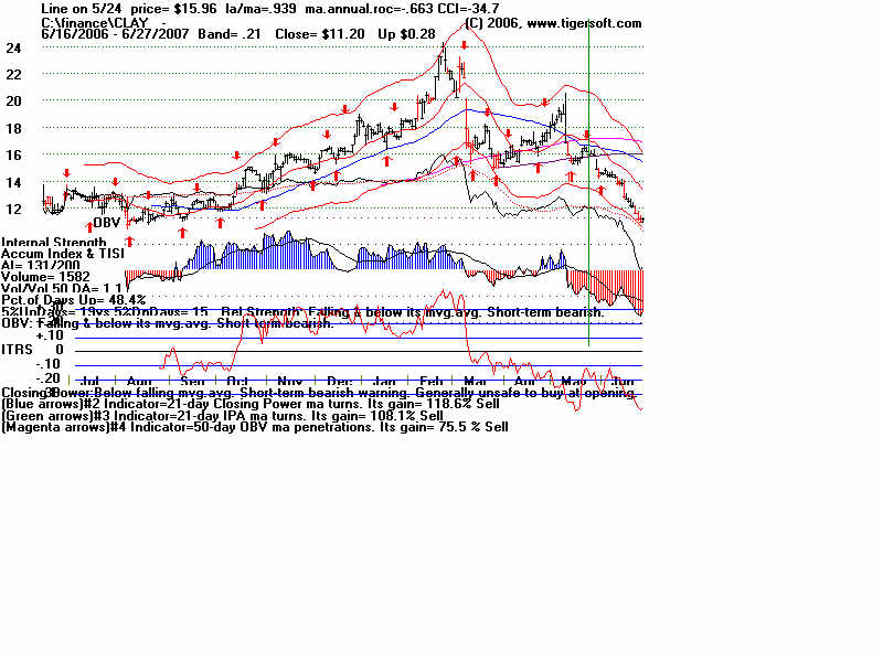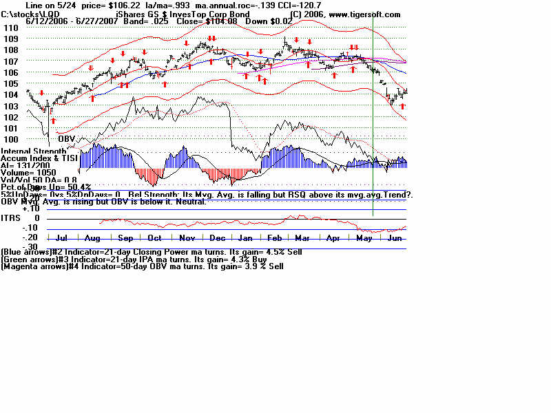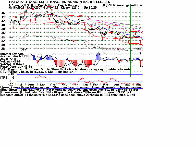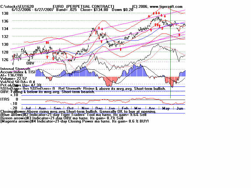 Wednesday - June 27, 2007 Watch the 2-year Treasury Notes (TU1620): Two-Year Notes Call The Tune for Housing and Finance Stocks. Traders should watch the 2-year Treasury notes. Many stock groups rise and fall in synch with short-term interest rates rates. I present data here to show how substantial the declines in just a month are for home-building and finance stocks when the Treasury Notes turn significantly weak Below is the chart for the year note's perpetual contract for 2-year Treasury Notes, as created by Dial Data. Keep in mind that as the 2-Year Treasury Notes rise in price interest rates are falling. In the chart below, you can see that there had been a rising channel of prices until mid-May, That is when the chart broke out of the bullish uptrend. And that is when Utility Stocks, Housing Stocks, Finance Stocks, Real Estate Investment Trusts, The Dollar, Gold and Bond Funds have started to weaken. As they weakened, the US markets turned soft. And the NYSE Advance-Decline Line turned down and the number of new lows start to rise sharply. Tiger Software users can watch this chart and allied charts closely. The dip of the Tiger Accumulation index in on April 10th to a new 12 month low was an early warning that this instrument, and all the investment vehicles tethered to it, would weaken. Note the trend-break of this vehicle's uptrend was on 5/24. Here are the charts of some of the investment vehicles ompacted by the change in trend of short-term interest rates. Recall from above that the trend-break of the Two-Year Notes was on 5/24. Housing stocks are, by far, the quickest to react. Utility Stocks: XLU (Utilities' ETF) fell from 41.08 to low of 39. Now 39.34 Housing Stocks Tiger Index of 31 Housing Stocks fell from 355 to 302 with today's close 5/24 6/26 HOV 25.81 17.48 32.3% decline MTH 35.00 28.02 19.9% decline BZH 35.35 28.54 19.3% decline LEN 45.87 37.86 17.5% decline Finance Stocks 5/24 6/26 CLAY 15.96 11.20 29.8% decline PVTB 33.03 27.01 18.2% decline MTG 65.20 57.90 11.2% decline LEND 14.68 13.06 11.0% decline MER 92.61 86.26 6.5% decline Real Estate IYR (Real Estate ETF) fell from 80.72 to a low of 76.5 and rallied to 78.87 today. Real Estate Investment Trusts VNQ (REIT ETF) had already formed bearish head and shoulders pattern. It fell from 74.12 on 5/24 to 70 before reversing today. 5/24 6/26 Euro 134.60 134.80 This topped out on 5/1 at its upper Tiger Regression channel. Br. Pound 198.57 199.57 (It will take more than talk by Fed of raising interest rates to strengthen the dollar versus the British Pound. Gold 64.75 63.76 Silver Stocks PAAS 26.34 25.66 SSRI 36.10 34.11 NEM 39.45 38.71 Bond Funds. LQD 106.22 104.08 Shares GS $ InvesTop Bond Fund - Biggest Bond Fund. - Our Nightly Hotline ($295/year) examines these charts and points out the inter-market relations. HOV, show below, was picked as a short sale on our Hotline. TigerSoft makes the business of profitable trading very easy. ![]() |
