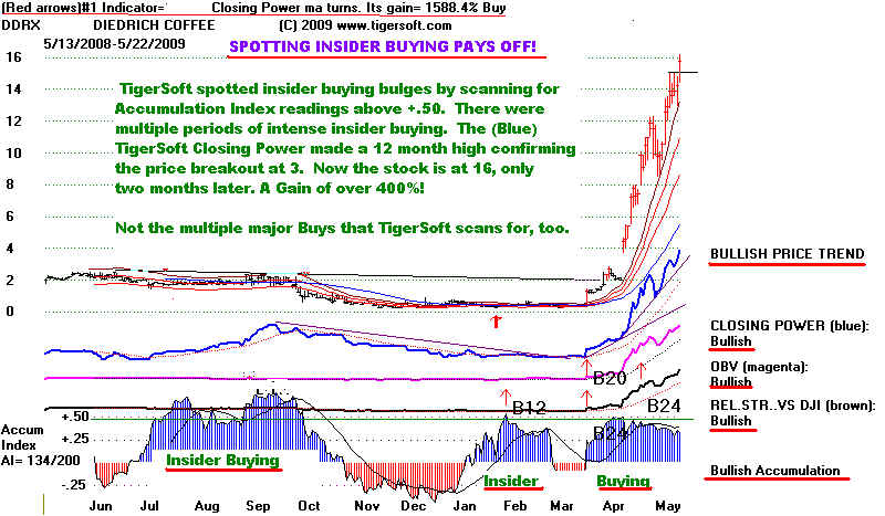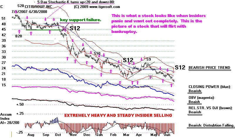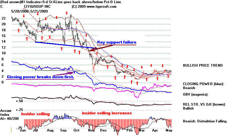 Tiger Software Since 1981, we have been helping Professionals and the Public around the World to Maximize Stock Profits and Avoid Devastating Declines. Tiger Software Charts Make Analysis of Stocks Simple, Easy and Profitable! 5/31/2009 (C) 2009 www.tigersoft.com 858-273-5900 william_schmidt@hotmail.com Welcome. Please read what we have here and then go to: TigerSoft's Three Keys.. and then Even with good stocks, check out the overall market's safety? ![]() This is title of the book we are working on about market timing... Our Question to You. HOW WOULD YOU LIKE LEGALLY TO TRADE LIKE AN INSIDER? How To Detect Important Insider Buying. Why not buy what and when they buy? These trades are almost always very profitable. Some make extraordinary trades, as was the stock shown below. The secret is first to scan stocks for significant bulges of Accumulation, as measured by TigerSoft's Accumulation Index and Closing Power. No other software does this. You will see why professional traders call our tools, "game changers". ![]() An Insider's Last Tip ![]() Wall Street's Dirty Little Secret: TigerSoft's documents that INSIDER BUYING/SELLING IS RAMPANT Insider Selling Should Not Be Ignored Insider selling is detected the same way as insider buying, except in reverse. You will see steady and deeply red "Distribution" in stocks being sigificantly sold by insiders. Again, you will want to watch TigerSoft's Accumulation Index and Closing Power to detect what insiders are doing. Closing Power weakness shows that Wall Street insiders are heeding the selling being done by corporate insiders. Why lose one hundred thousand dollars, or more unnecessarily? That's exactly what can happen when you buy and hold and they sell out at the top. Sell when they do. After look through the many TigerSoft charts on these pages, that conclusion is inescapable. TigerSoft is your best LEGAL way to buy what and when insiders are buying or selling. "Use it or lose it!", we would say. ALWAYS BE ALERT. YOUR STOCK COULD BE SUBJECTED TO THE SAME INSIDER SELLING CITIGROUP WAS. See below. What's very clear is that bankers at CitiGroup knew full well that they were building a house of cards between 2004 and 2007. This is shown by their insider selling at the top two years ago and all the way down... Read the Blog we offered last year on CitiGroup.. RECKLESS CITIGROUP INSIDERS SOLD 1,000,000 SHARES IN 2007 CitiGroup's chart 2006-2007 - So many signs of insider selling. Don't believe bankers when they say no one could see the Crash coming. A declining "Closing Power" (invented and trademarked by TigerSoft) shows institutions are selling. Coupled with deeply negative readings from TigerSoft's Accumulation Index, it means that there is serious insider selling taking place. This started in March 2007 and got very serious after May 2007. It is on record that Robert Rubin, Clinton's Treasury Secretary and a top advisor to CitiGroup, sold $3 million worth of CitiGroup in January 2007. That started an avalanche of inside selling by members of CitiGroup's Board of Directors.