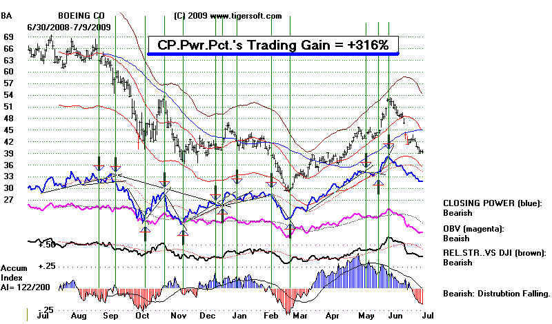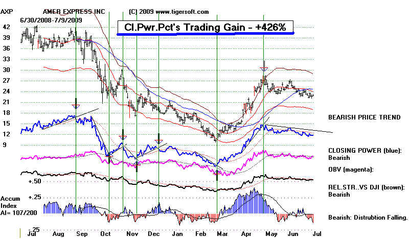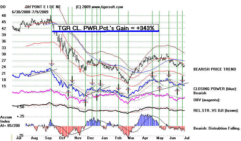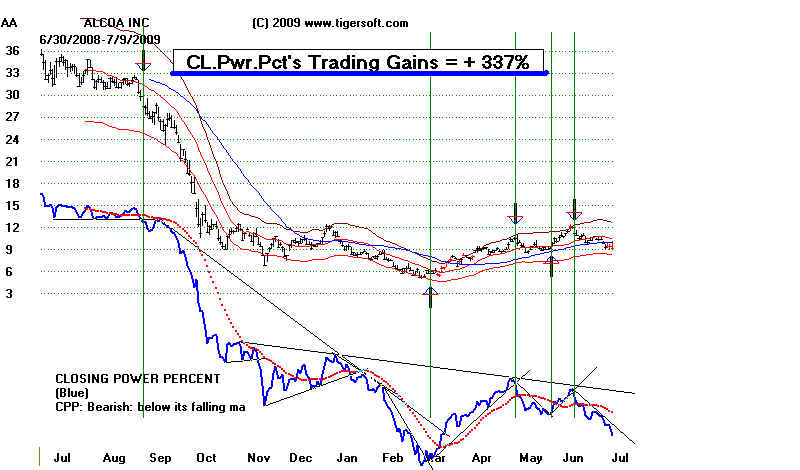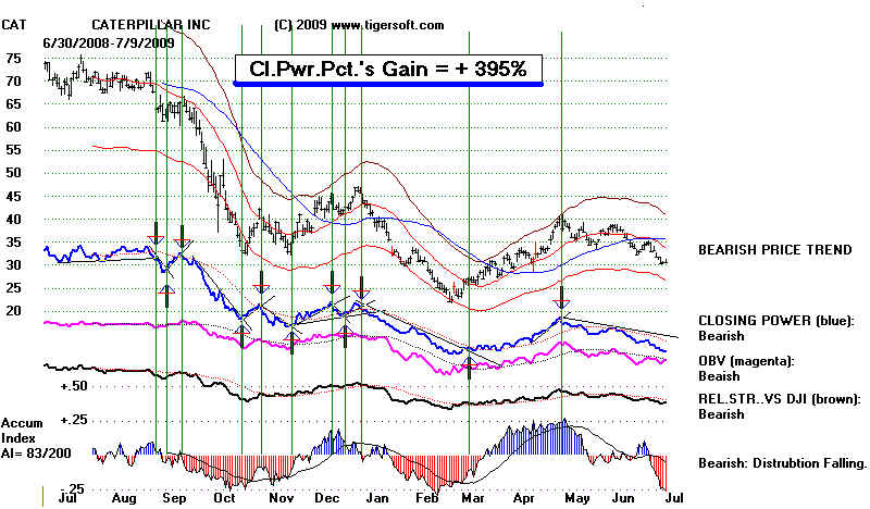 TigerSoft's Game Changer TigerSoft's Closing Power Percent (C) 2009 William Schmidt, Ph.D. March 12, 2009 from MW, Phoenix - a Professional Money Manager. "Bill, your work is solid and that's why I took the trade. I know you deeply care about what the accuracy of the information you print. What I respect most about you Bill is your hard work, your a very good market technician-at times brillant, and most importantly your a man of conscience...Tiger Software has some great strengths: your work on closing power was a game changer for me. Also, the 4 combinations: Accumulation, OBV, Closing Power, and Relative Strength work was most helpful ![]() Simply trade the trend-changes. The rules are simple. A break in a rising Closing Power trend is a Sell. A break in a falling Closing Power trend is a Buy. This simple approach catches nearly all significant moves in whatever you trade. Here are some examples: Crude Oil, Gold, Silver.... The gains even with DJIA-30 stocks are amazing. Below are charts of the five stocks DJIA-30, taken randomly.... The simple rules keep you in position to ride each significant trend. Of course, you will want to pick the best stocks to Buy using TigerSoft's Accumulation Index and Power Ranker. The returns here are based on the assumption that one starts with $10,000 and fully invests all proceeds with each Buy and Sell. Short positions are taken on Sells. It is further assumed that the cost of each closed out position is $40 and that positions are taken at the opening on the day after the Buy or Sell. |