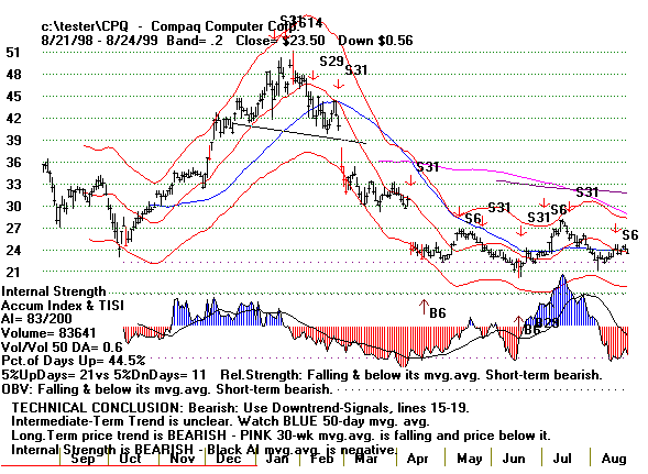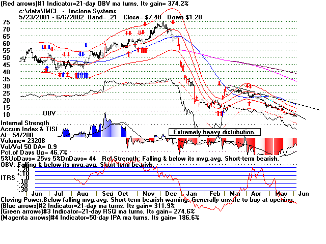 a passage from Explosive Super Stocks "Most investors only rosily look for stocks about to go up. But there's a another world out there that they are missing. It is is the world of "over-hyped", "over-recommended", "bloated", "inefficient" companies run by the greediest of white collar crooks that have sold their shares just before the news gets out that their products or drugs don't work or that their "books have been cooked" and just before their company's earnings come crashing down. This is the world where brokers with glaring conflicts of interest, are over-paid to recommend shares in companies they know nothing about, and could care less about. This is the world of rampant insider buying and insider selling, where the SEC serves mainly to give the appearance of propriety and regulation of Wall Street. This is the world where the Accountant gives the CEO whatever bottom line fabrication he is told to come up with because the Accounting firm does not want to lose the client. This is the world where trend-following lemmings bid a stock up and up, always believing there is a bigger fool, until, at least, the uptrend-line is broken and the stock comes gapping down, supported only by the bids of a few short-sellers who are taking mercy on the those who are have just lost 50%, 75% or 90% of their investment. This is the world of ENRON and IMCLONE and countless other companies who have been taken over by crooks, and whose shares are for a time little more than a criminals' tool for fleecing millions of dollars each day from innocent, unsuspecting, gullible investors who see the world of Wll Street through rose-tinted glasses right to the bitter end. We are here to tell you that you don't have to sit back and take it! You can fight back! You can now profiitably sell short in most any market, because with our TigerSoft technical analysis tools, you can see what corporate insiders and their well-heeled friends and cronies are actually doing with their own shares of a company's stock. "Watch their feet", my old basket ball coach used to say. "Forget about their eyes or their arms. They aren't going anywhere without their feet!!" Well, it's the same way in the stock market. +Use TigerSoft's "Accumulation/Distribution" Indicator to see what's really going on with your company's stock. The Stock Market is a JUNGLE! It is always survival of the fitest. You have to be prepared. That is why we named our company Tiger Software. Without TigerSoft you are at a distinct disadvantage. Let us show you how we can help you turn Wall Street's self-serving manipulation of news and stock prices to your lasting advantage." Learn from Tiger Software How To Profit from: (1) Bear Markets, which are predictable using our "Peerless" Automatic Sells. (2) Steep Market Corrections, which are predictable using our "Peerless" Automatic Sells. (3) and Those Stocks, which are Mortally Wounded by Heavy Insider-Selling and Massive Big-Money Selling even in Bull Markets. Such Bearish Special Situation Stocks can be spotted early-on in almost any market. Our Elite Report on the internet finds them for you. But our book will teach you how to find them yourself. All the necessary formulae are in the book. 1000's Have Learned from us How to Profit from Timely Short Sales. Let us show you, too. TigerSoft's 160 Page Book "SHORT SELLING: Killer Profts in Any Market Using Tiger's Accumulation Index." by William Schmidt, Ph.D. - only $55.... The book integrates our Peerless major Sell S9 signals on the DJI with TigerSoft's proprietary creation, the TIGER Accumulation Index, and classic technical analysis tools and concepts. The premise of the book is that someone always knows in advance when troubles are about to hit a company's stock or the market as a whole. Instead of being caught like a deer in the head-lights, we teach you how to spot the unmistakable, tell-tale signs of Insider Distribution that nearly always preceed significant declines. Exactly - what a Bearish Heavy Distribution Stock looks like. Chart of IMCLONE in 2002. IMCLONE's CEO was later convicted on insider trading. Without telling the public, he sold his shares in the stock when he learned the FDA was going to reject the company's anti-cancer drug Erbitux in late 2001. Shareholder lawsuits prolifferated. Other insiders like Martha Stuart were convicted of insider selling and have received jail sentences. A TigerSoft user looking at this chart would have readily spotted this Insider-Selling. Note the very negative RED distribution using TigerSoft's Accumulation Index and then the institutional dumping as the bad news spreads. A typical bearish-looking stock: CPQ - 1997 Sample charts and More Infomration: Link 1. >>> ORDER TIGER's "Short Selling: Killer Profits in Any Market" Book by Wm.Schmidt, Ph.D. ![]()