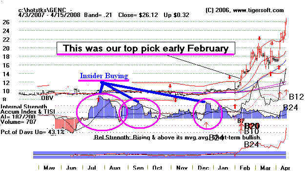 TIGERSOFT'SPOWER-STOCK-RANKER GIVES YOU EVERY ADVANTAGE! TIGERSOFT's POWER-STOCK-RANKER Screens, Ranks and Flags 7500 stocks with one command. Example. At our monthly TigerSoft meeting in San Diego, we quickly ran through the best of 7000 stocks. GENC was the pick. Note clustered major Buys and earlier bulges of insider buying. These conditions are reliably very bullish. for a year-long advance. ![]() Find The Most Bullish and Bearish Situations in Seconds. Get a list showing the new stocks with New Buys and Sells. Click the stock in the list and see the TigerSoft graph. This is a huge time-saver. In seconds, you can see a ranking of stocks for long-term Accumulation. The Tiger Accumulation Index is the most powerful predictive indicator out there, bar none! Buy High Accumulation Stocks. Sell Short the Most Distributed. Use the automatic Buys and Sells on these to take and exit positions.. Year after year, this simple and time-proven approach makes our users money. Our Power-Ranker Software lets you rank all your stocks for this Accumulation or Distribution. Instead of examining charts, one by one, let TIGER's POWER-STOCK-RANKER screen and rank thousands of stocks for the very best and the very worst lomger term investments. .