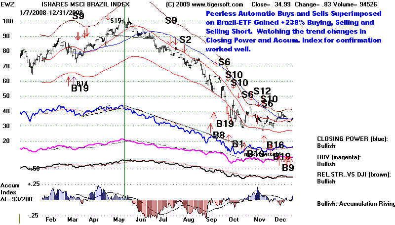 ![]() Call or write us today. (C) 2009 www.tigersoft.com 858-273-5900 william,_schmidt@hotmail.com PO Box 9491, San Diego, CA 92169 USE Tiger's PEERLESS TO TRADE FOREIGN ETFS Example: Peerless Signals Super-Imposed on 2008 Chart of EWZ - ETF for Brazil ![]() |