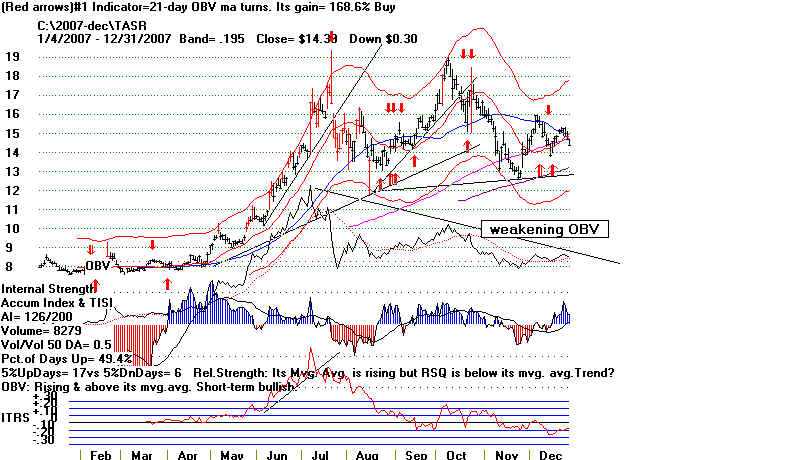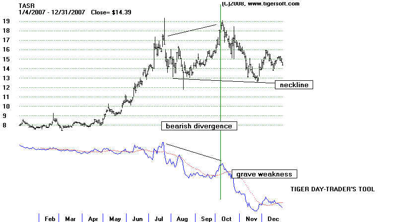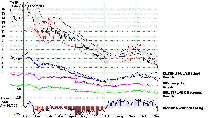 | A Stock's 4 Typical Phases: TASR from 2003-2008 Updated 11/21/2008 (C) www.tigersoft.com TASR is a smaller speculative stock. Its rise and fall were more exaggerated. We call stocks like these "piffle stocks". They bubble up under promotion and speculation. Then the bubble breaks and they come back down, often back to very low prices, where they stay for years and years. Tiger's Major Buy and Sell