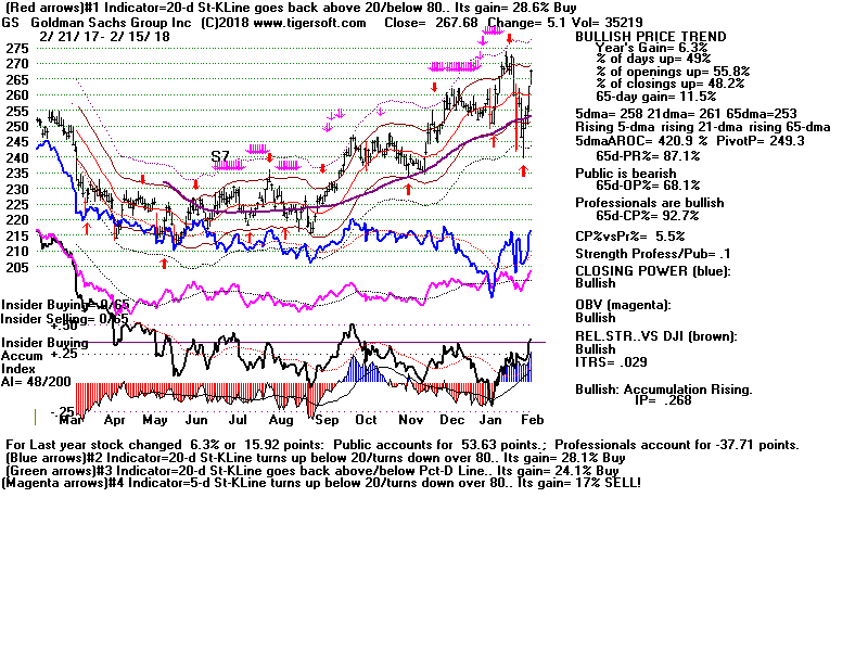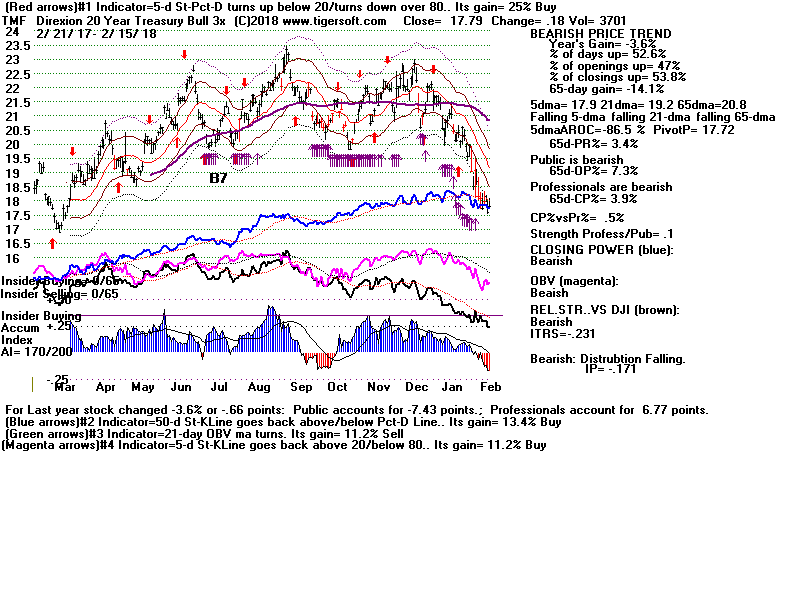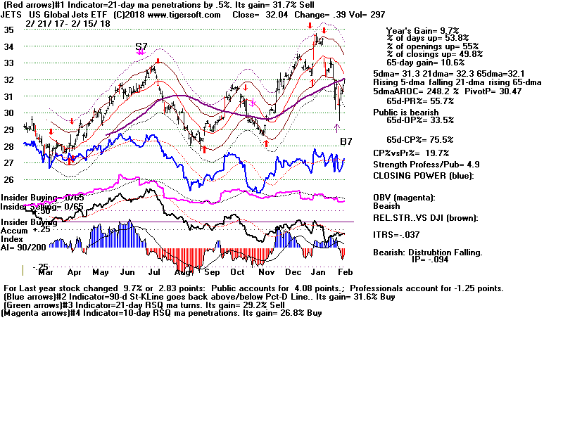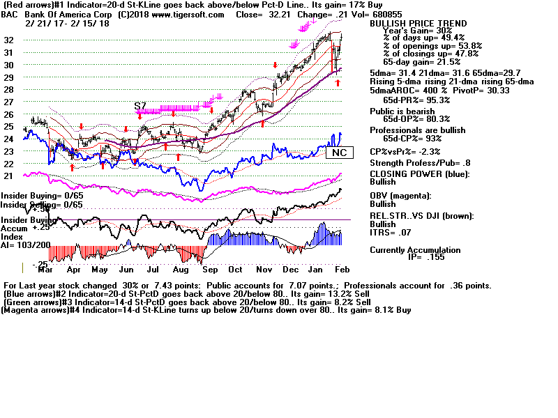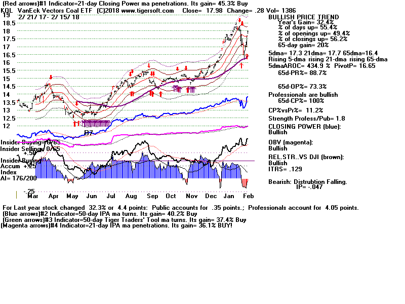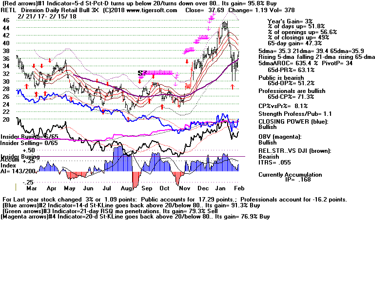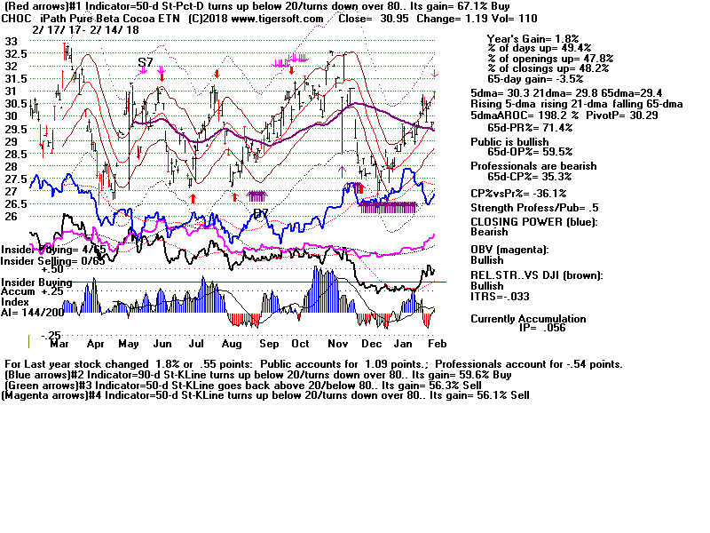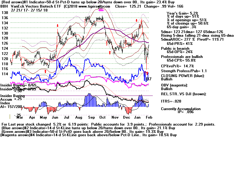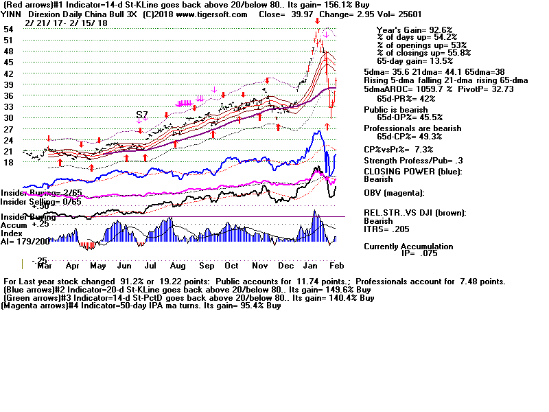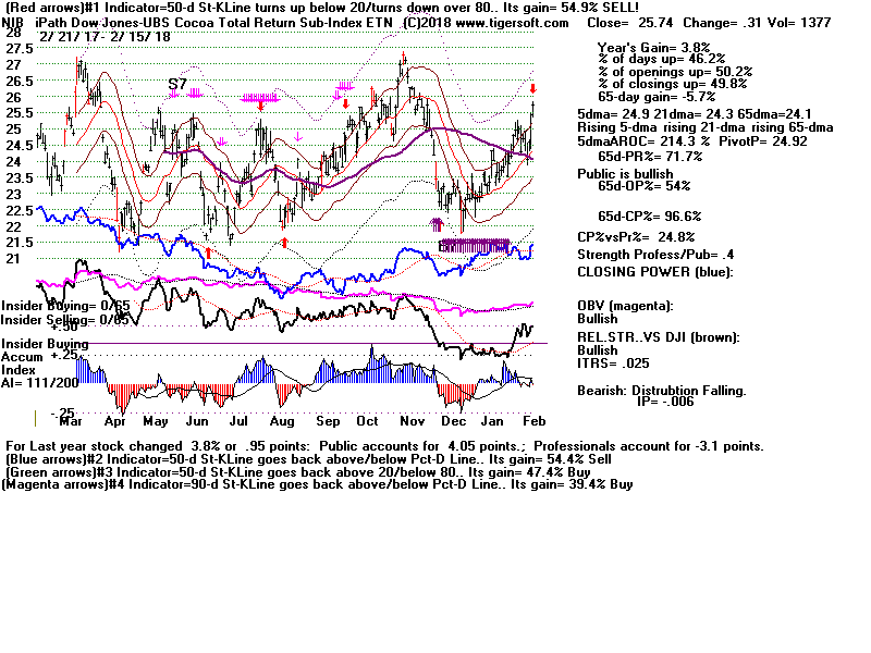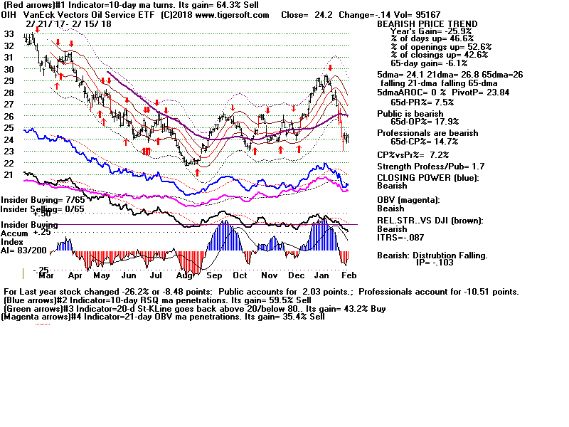 BIGVODN 31 There is big rush for the exits here!Table 3 Count of Stocks and New Highs in Key Tiger Directories Date = 180129 ------------------------------------------------------------------- BIGMIL 6 3 50 % JETS 9 3 33 % BIGBANKS 7 2 29 % MILITARY 38 9 24 % GAMING 28 6 21 % NASD-100 100 16 16 % TRANSP 20 3 15 % RETAIL 53 8 15 % ====================================================== EDU 7 1 14 % DOWJONES 30 4 13 % NIFTY 30 4 13 % HOSPITAL 8 1 13 % SP-100 96 11 11 % BIOTECH 386 44 11 % INFRA 35 4 11 % SP500 485 52 11 % INDEXES 194 19 10 % FINANCE 93 8 9 % MORNSTAR 238 22 9 % DJI-13 13 1 8 % RUS-1000 837 68 8 % COMODITY 70 5 7 % HOMEBLDG 17 1 6 % SOFTWARE 66 4 6 % INSURANC 32 2 6 % BEVERAGE 20 1 5 % COMPUTER 23 1 4 % REGBANKS 33 1 3 % AUTO 39 1 3 % OILGAS 141 4 3 % CHINA 64 2 3 % CHEM 64 1 2 % ELECTRON 178 3 2 % SEMI 130 2 2 % INDMATER 90 1 1 % ==================================================== None: GREEN ETFS HACKERS SOLAR COAL GOLD REIT UTILITY PIPELINE FOOD BONDFUNDTable 4
