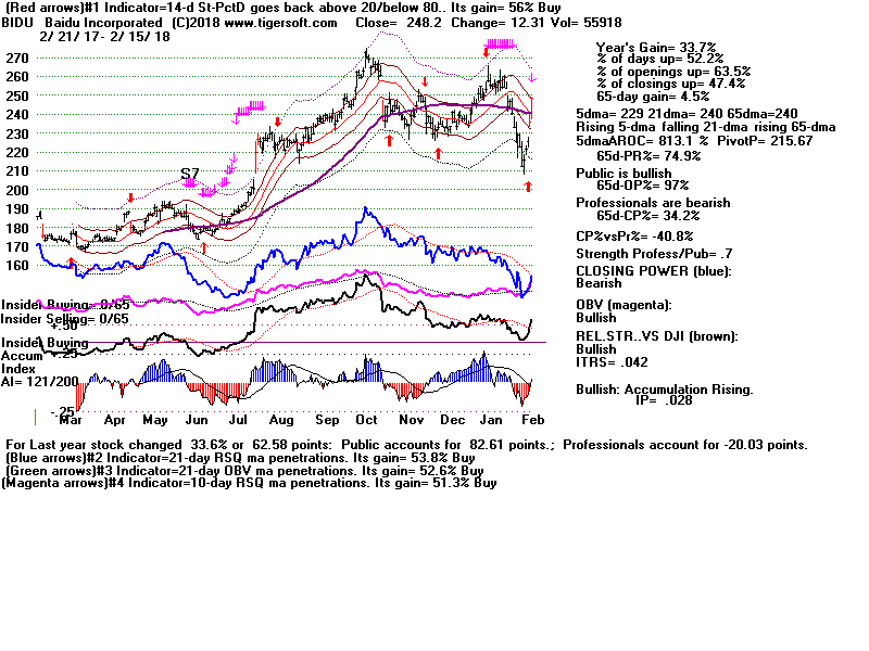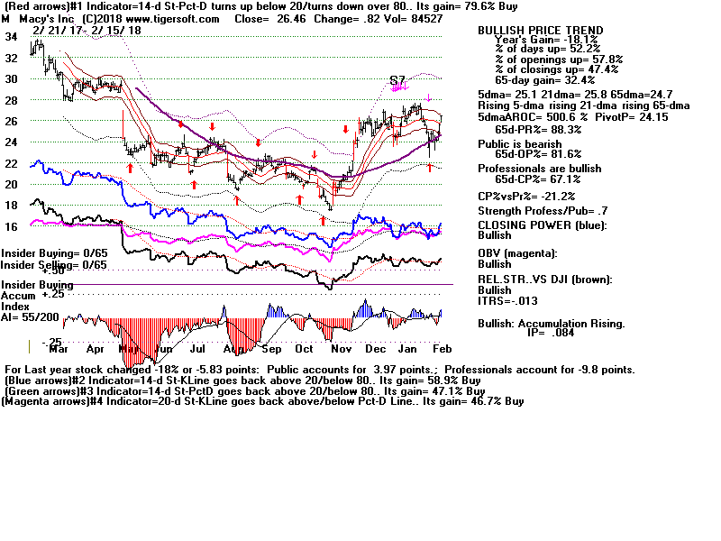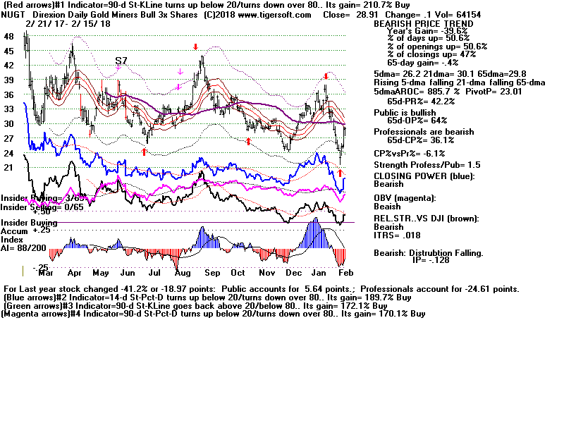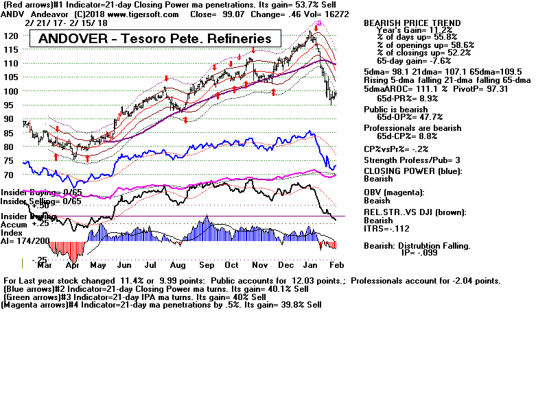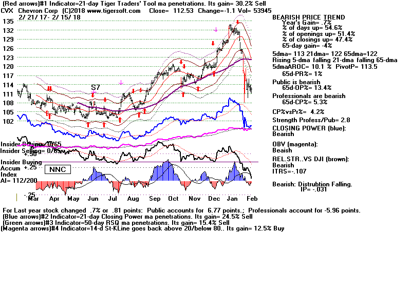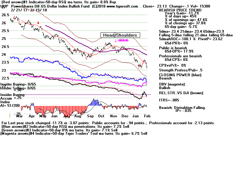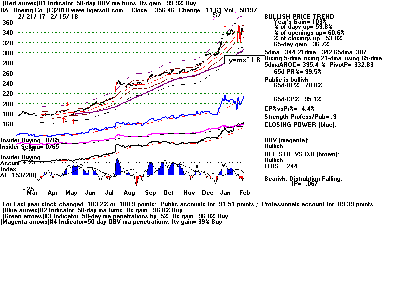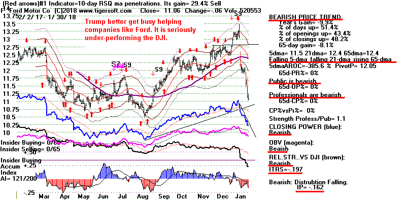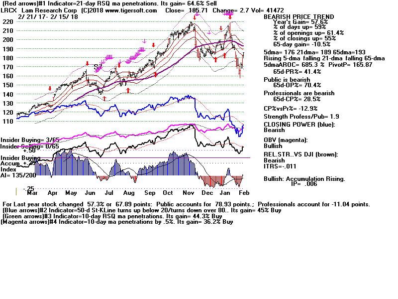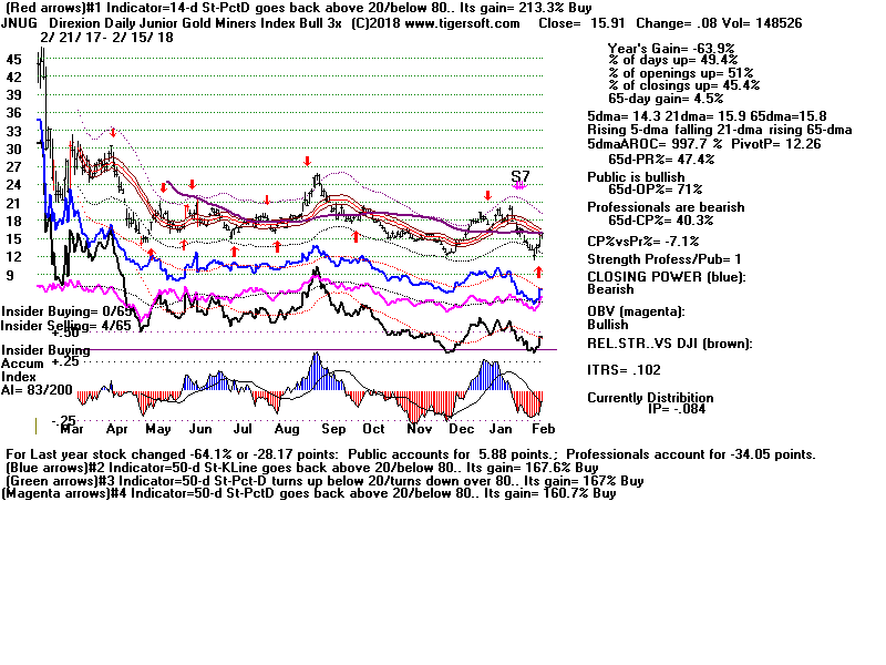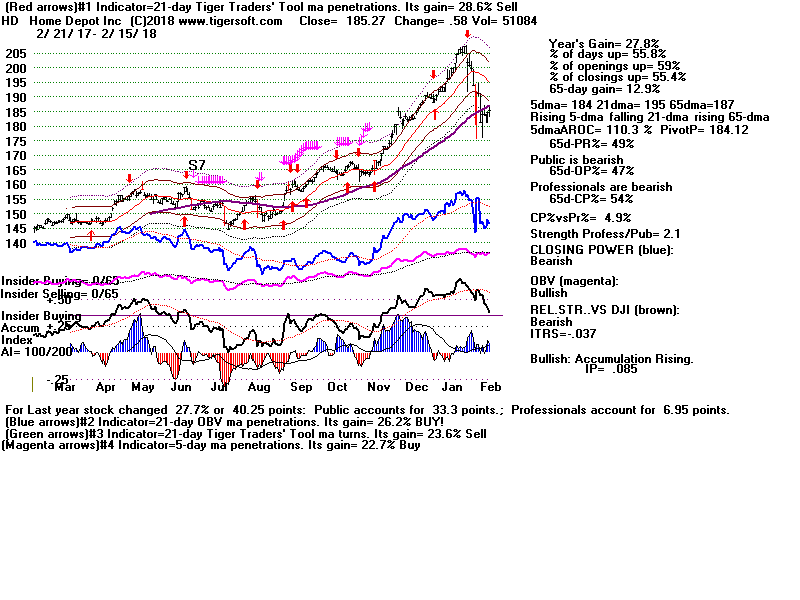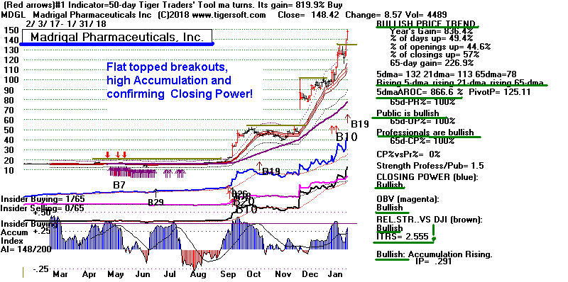BIGVODN 31 There is big rush for the exits here!Table 3 Count of Stocks and New Highs in Key Tiger Directories Date = 180129 ------------------------------------------------------------------- BIGMIL 6 3 50 % JETS 9 3 33 % BIGBANKS 7 2 29 % MILITARY 38 9 24 % GAMING 28 6 21 % NASD-100 100 16 16 % TRANSP 20 3 15 % RETAIL 53 8 15 % ====================================================== EDU 7 1 14 % DOWJONES 30 4 13 % NIFTY 30 4 13 % HOSPITAL 8 1 13 % SP-100 96 11 11 % BIOTECH 386 44 11 % INFRA 35 4 11 % SP500 485 52 11 % INDEXES 194 19 10 % FINANCE 93 8 9 % MORNSTAR 238 22 9 % DJI-13 13 1 8 % RUS-1000 837 68 8 % COMODITY 70 5 7 % HOMEBLDG 17 1 6 % SOFTWARE 66 4 6 % INSURANC 32 2 6 % BEVERAGE 20 1 5 % COMPUTER 23 1 4 % REGBANKS 33 1 3 % AUTO 39 1 3 % OILGAS 141 4 3 % CHINA 64 2 3 % CHEM 64 1 2 % ELECTRON 178 3 2 % SEMI 130 2 2 % INDMATER 90 1 1 % ==================================================== None: GREEN ETFS HACKERS SOLAR COAL GOLD REIT UTILITY PIPELINE FOOD BONDFUNDTable 4