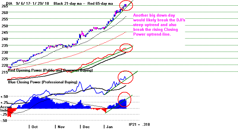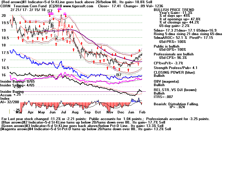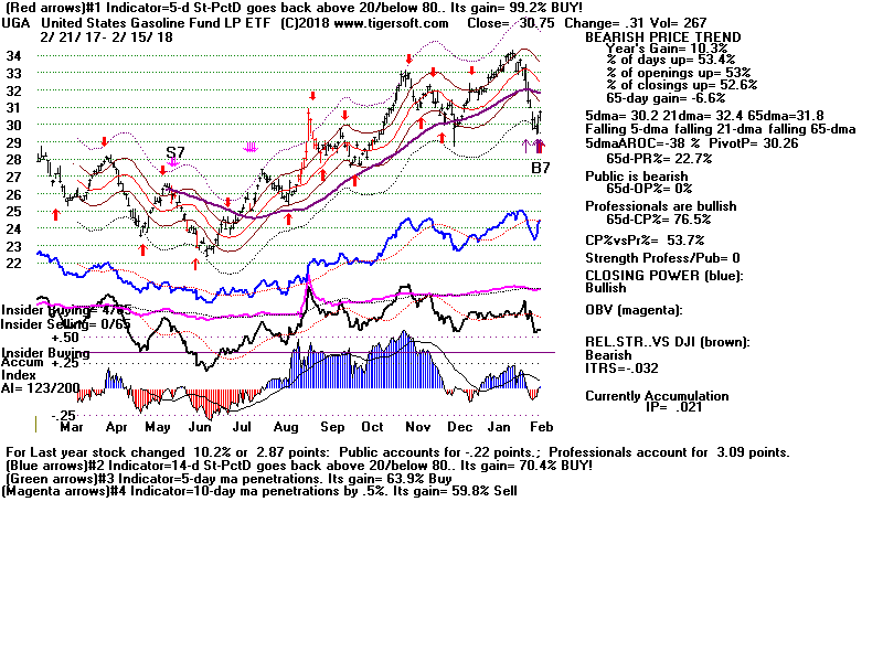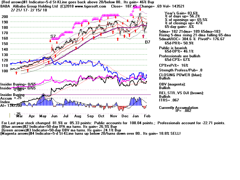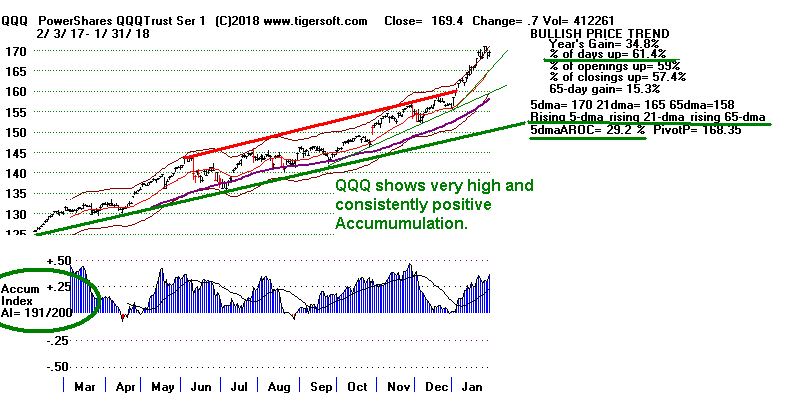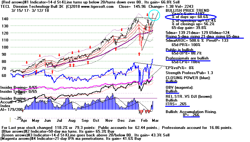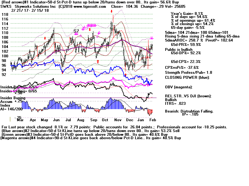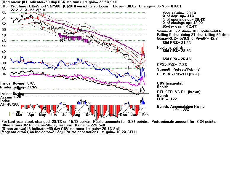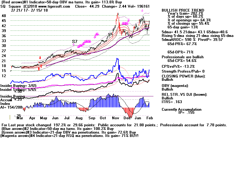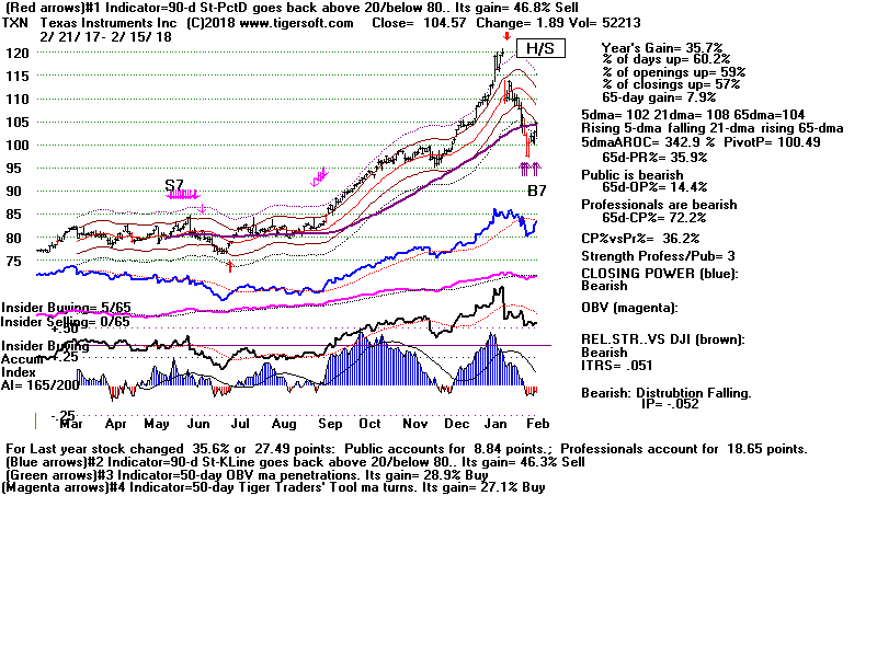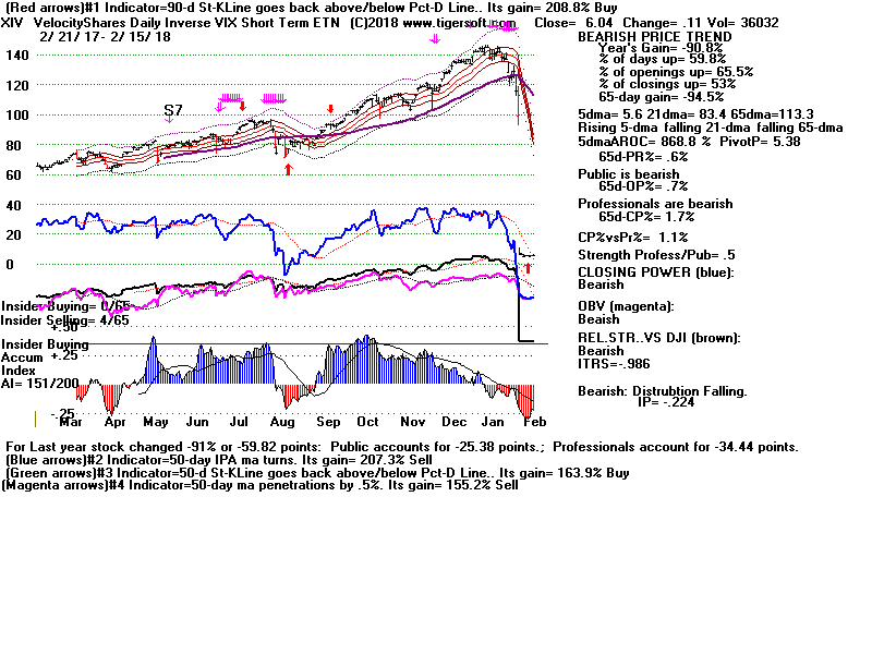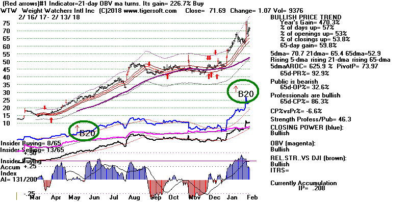 BIGVODN 31 There is big rush for the exits here!Table 3 Count of Stocks and New Highs in Key Tiger Directories Date = 180129 ------------------------------------------------------------------- BIGMIL 6 3 50 % JETS 9 3 33 % BIGBANKS 7 2 29 % MILITARY 38 9 24 % GAMING 28 6 21 % NASD-100 100 16 16 % TRANSP 20 3 15 % RETAIL 53 8 15 % ====================================================== EDU 7 1 14 % DOWJONES 30 4 13 % NIFTY 30 4 13 % HOSPITAL 8 1 13 % SP-100 96 11 11 % BIOTECH 386 44 11 % INFRA 35 4 11 % SP500 485 52 11 % INDEXES 194 19 10 % FINANCE 93 8 9 % MORNSTAR 238 22 9 % DJI-13 13 1 8 % RUS-1000 837 68 8 % COMODITY 70 5 7 % HOMEBLDG 17 1 6 % SOFTWARE 66 4 6 % INSURANC 32 2 6 % BEVERAGE 20 1 5 % COMPUTER 23 1 4 % REGBANKS 33 1 3 % AUTO 39 1 3 % OILGAS 141 4 3 % CHINA 64 2 3 % CHEM 64 1 2 % ELECTRON 178 3 2 % SEMI 130 2 2 % INDMATER 90 1 1 % ==================================================== None: GREEN ETFS HACKERS SOLAR COAL GOLD REIT UTILITY PIPELINE FOOD BONDFUNDTable 4