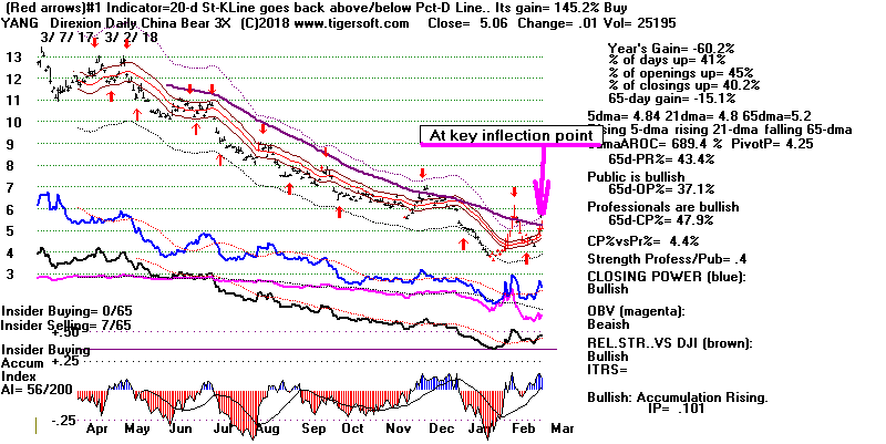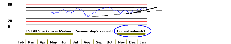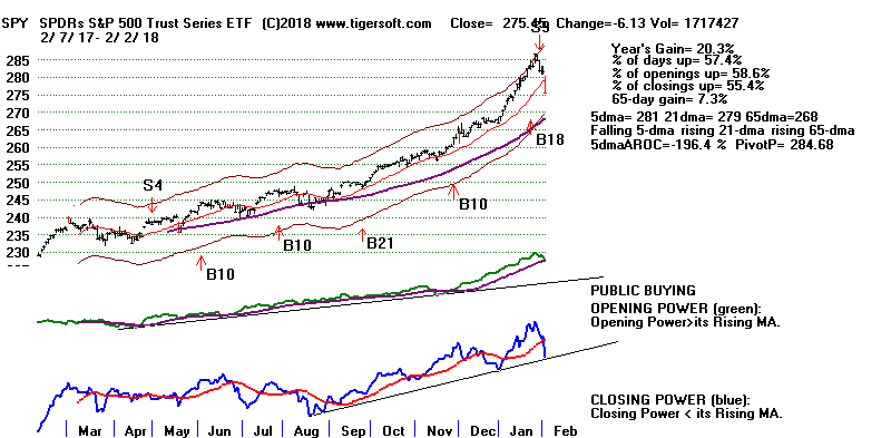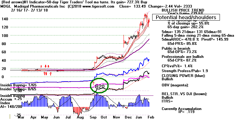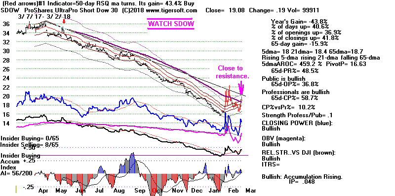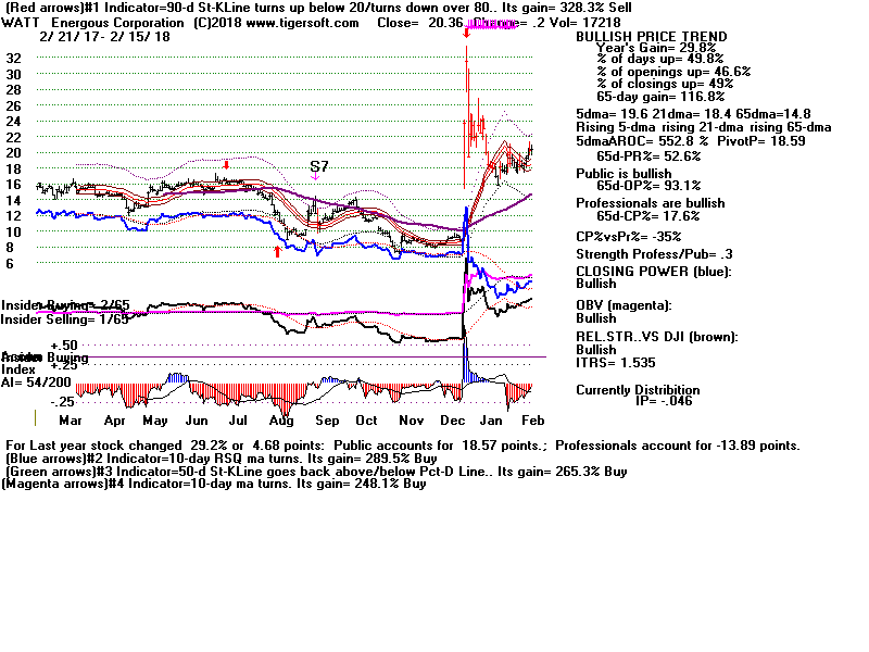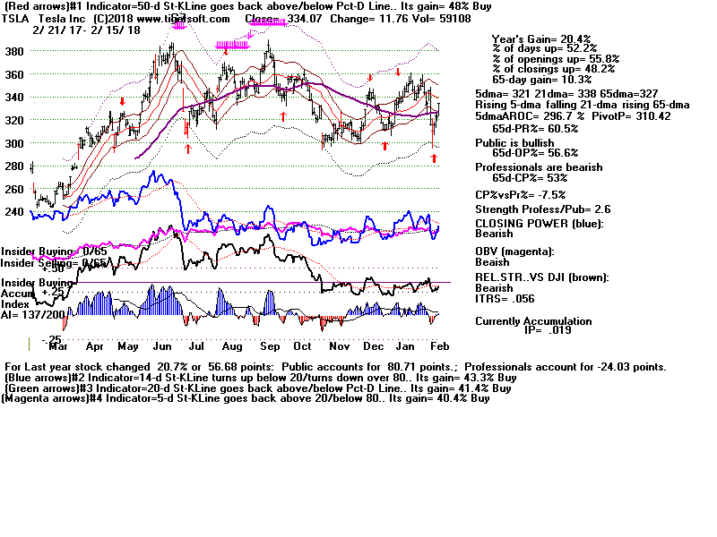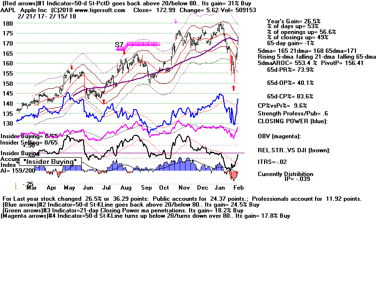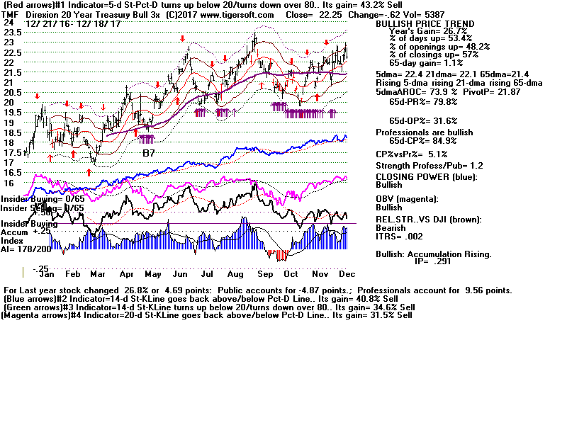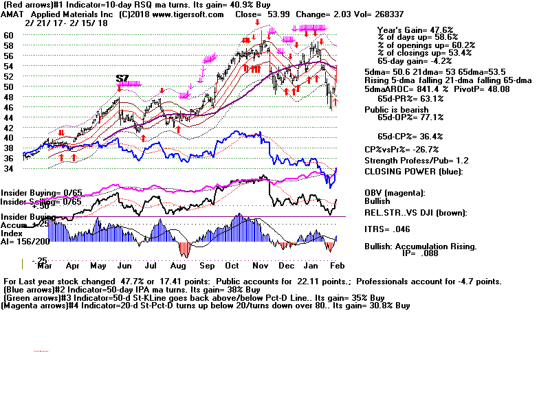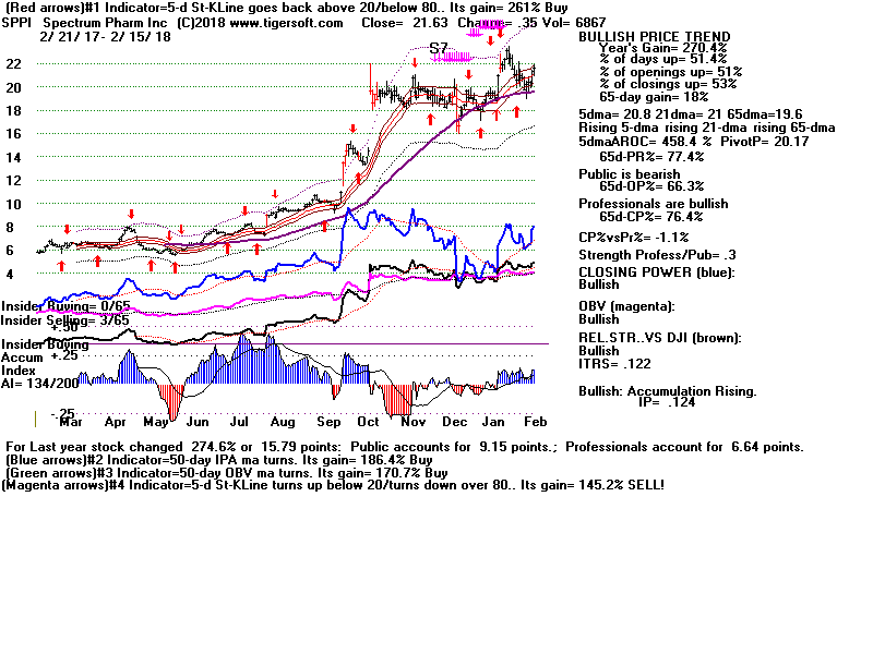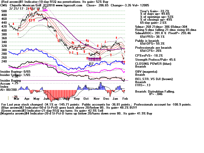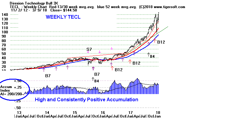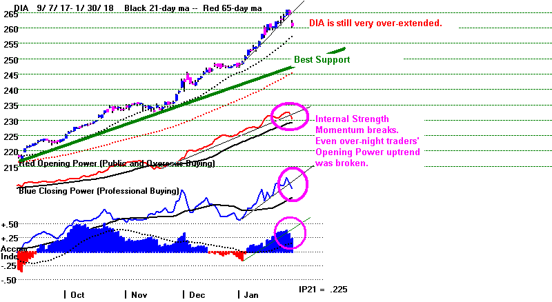 BIGVODN 31 There is big rush for the exits here!Table 3 Count of Stocks and New Highs in Key Tiger Directories Date = 180129 ------------------------------------------------------------------- BIGMIL 6 3 50 % JETS 9 3 33 % BIGBANKS 7 2 29 % MILITARY 38 9 24 % GAMING 28 6 21 % NASD-100 100 16 16 % TRANSP 20 3 15 % RETAIL 53 8 15 % ====================================================== EDU 7 1 14 % DOWJONES 30 4 13 % NIFTY 30 4 13 % HOSPITAL 8 1 13 % SP-100 96 11 11 % BIOTECH 386 44 11 % INFRA 35 4 11 % SP500 485 52 11 % INDEXES 194 19 10 % FINANCE 93 8 9 % MORNSTAR 238 22 9 % DJI-13 13 1 8 % RUS-1000 837 68 8 % COMODITY 70 5 7 % HOMEBLDG 17 1 6 % SOFTWARE 66 4 6 % INSURANC 32 2 6 % BEVERAGE 20 1 5 % COMPUTER 23 1 4 % REGBANKS 33 1 3 % AUTO 39 1 3 % OILGAS 141 4 3 % CHINA 64 2 3 % CHEM 64 1 2 % ELECTRON 178 3 2 % SEMI 130 2 2 % INDMATER 90 1 1 % ==================================================== None: GREEN ETFS HACKERS SOLAR COAL GOLD REIT UTILITY PIPELINE FOOD BONDFUNDTable 4