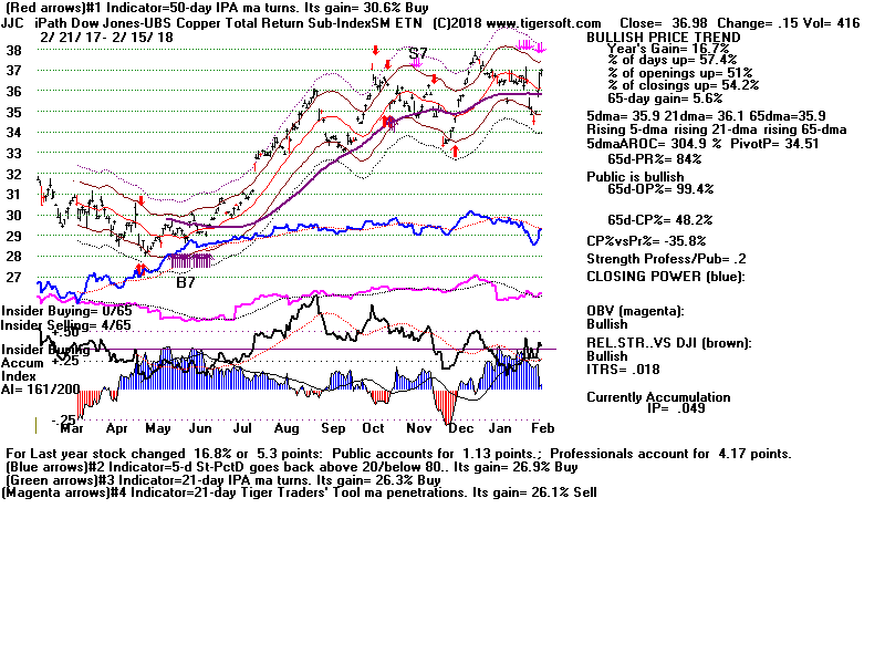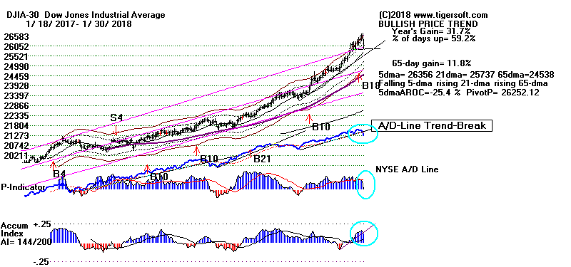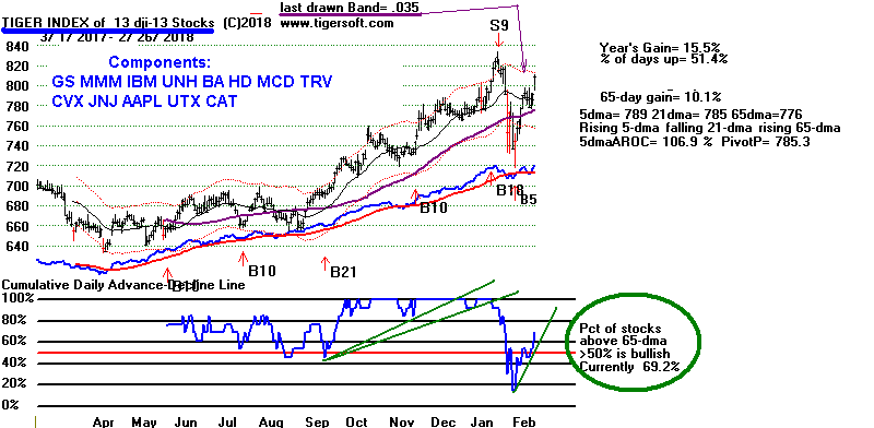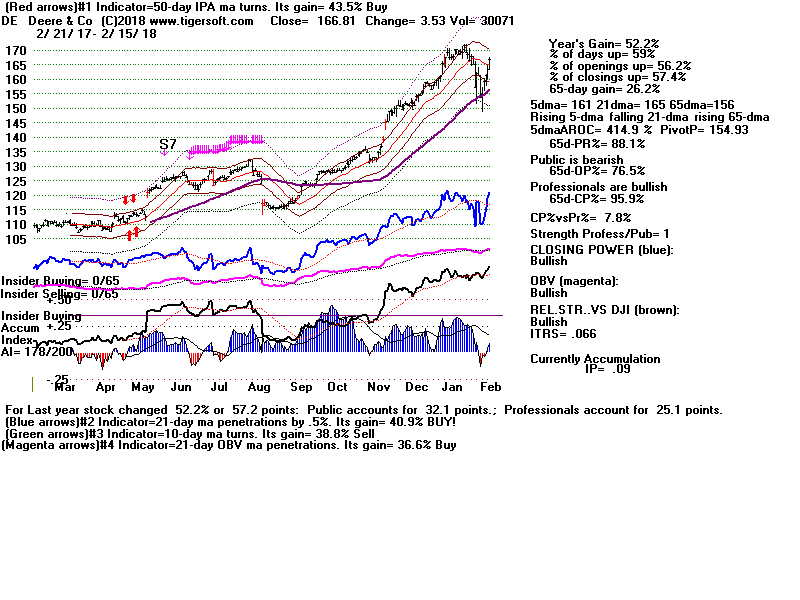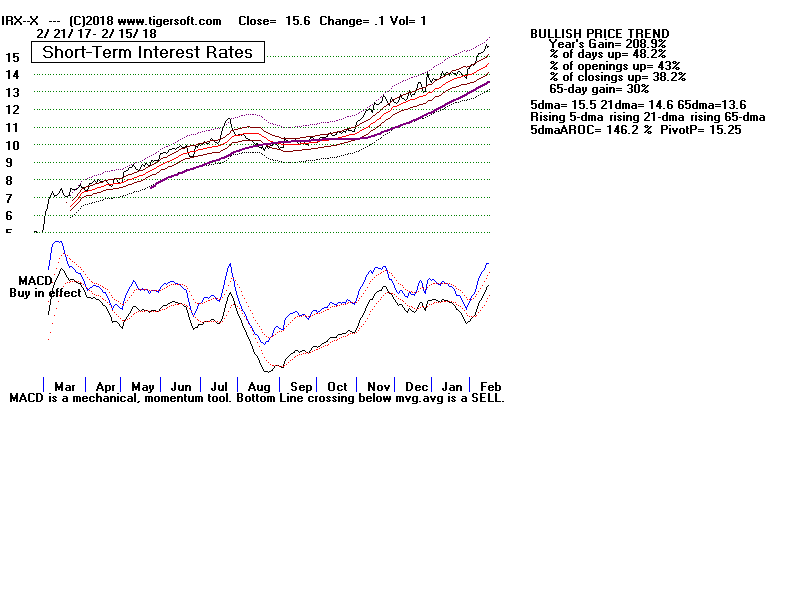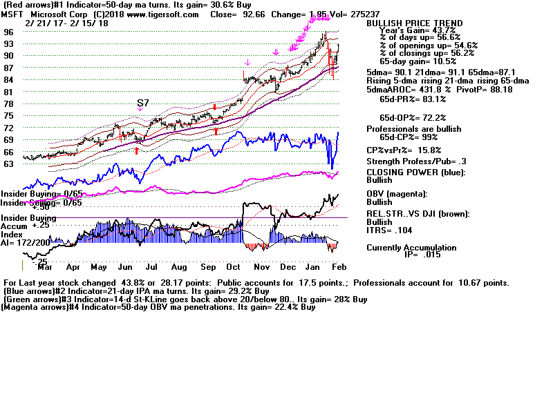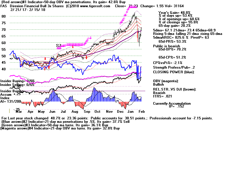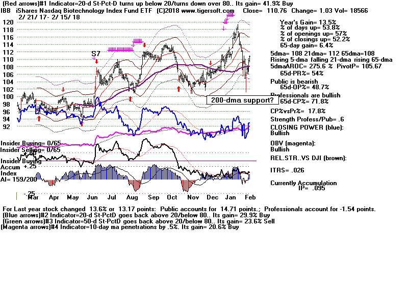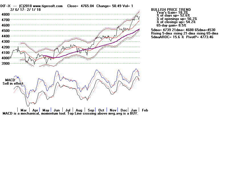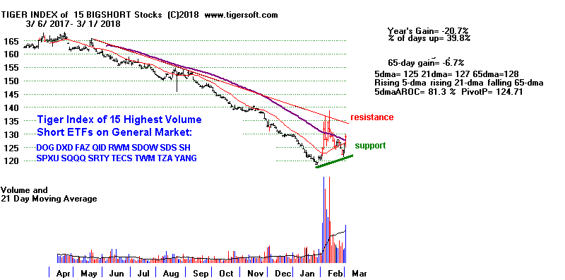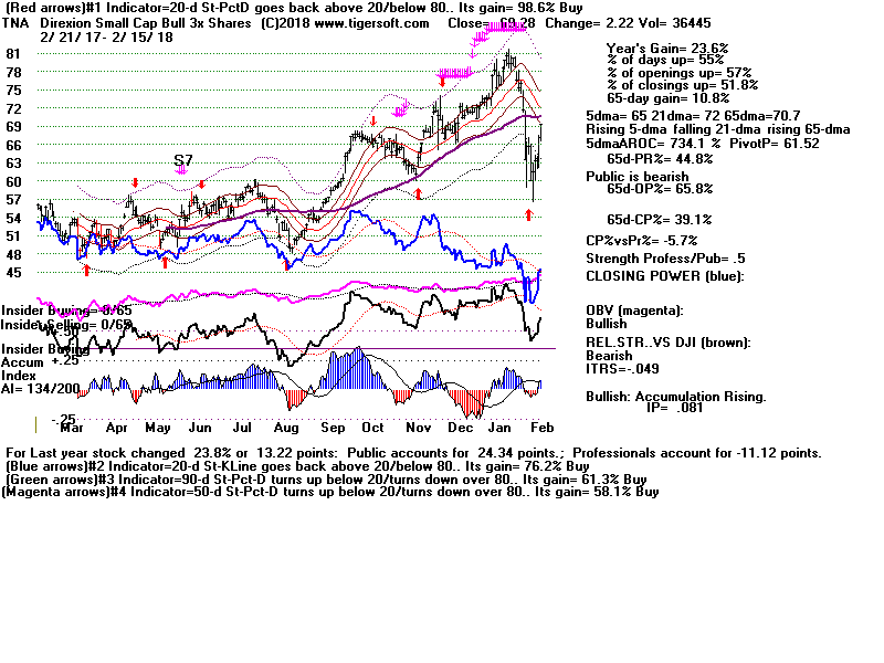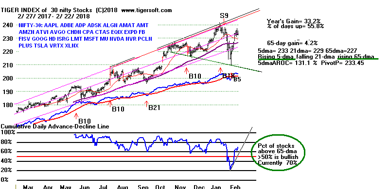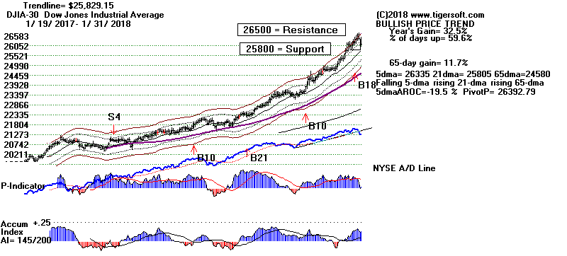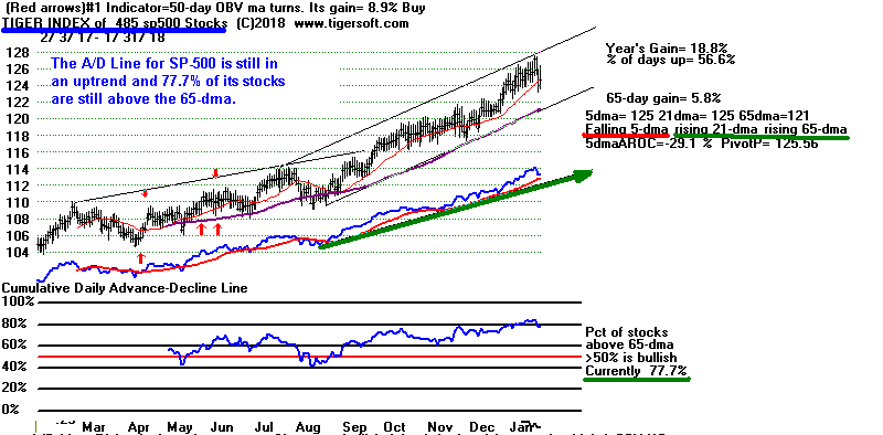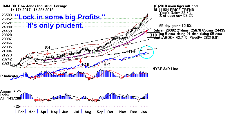 BIGVODN 40 Table 3 Count of Stocks and New Highs in Key Tiger Directories Date = 180130 ------------------------------------------------------------------- BIGMIL 6 1 17 % ===================================================== HOSPITAL 8 1 13 % MILITARY 38 2 5 % BEVERAGE 20 1 5 % GAMING 28 1 4 % INDEXES 194 7 4 % AUTO 39 1 3 % FINANCE 93 3 3 % NIFTY 30 1 3 % MORNSTAR 238 6 3 % CHEM 64 1 2 % BIOTECH 387 9 2 % SP500 485 12 2 % RUS-1000 837 15 2 % NASD-100 100 2 2 % RETAIL 53 1 2 % UTILITY 43 1 2 % SP-100 96 1 1 % INDMATER 90 1 1 % SEMI 130 1 1 % =====================================================Table 4 RANKING OF KEY DIRECTORIES BASED PCT.OF STOCKS ABOVE 65-DMA 1/30/18 Bullish = 38 Bearish = 8 --------------------------------------------------------------------------------------- Directory Current day-1 day-2 day-3 day-4 day-5 ---------------------------------------------------------------------------------------- BIGMIL 1 1 1 1 1 1 HOSPITAL 1 .875 .875 .875 .875 .875 ETFS .939 .969 .969 .969 .954 .954 INDEXES .932 .938 .927 .927 .932 .907 DJI-13 .923 .923 .923 .923 1 1 DOWJONES .9 .9 .9 .9 .933 .933 SP-100 .885 .895 .916 .927 .927 .937 MORNSTAR .873 .894 .92 .911 .92 .924 AUTO .871 .871 .897 .871 .871 .871 BIGBANKS .857 1 1 1 1 1 INFRA .857 .885 .942 .914 .885 .942 TRANSP .85 .8 .85 .8 .9 1 RETAIL .83 .867 .867 .867 .867 .849 NASD-100 .82 .85 .89 .86 .86 .89 FINANCE .817 .827 .827 .849 .849 .903 MILITARY .815 .789 .763 .789 .736 .736 BEVERAGE .8 .8 .85 .8 .8 .8 COMODITY .8 .8 .8 .742 .757 .7 N=18 -------------------------------------------------------------------------------------------- SP500 .787 .812 .851 .841 .83 .839 GAMING .785 .785 .821 .857 .821 .821 JETS .777 .666 .666 .666 .777 1 INDMATER .766 .8 .855 .855 .855 .844 CHINA .75 .75 .796 .781 .781 .796 RUS-1000 .75 .774 .805 .802 .799 .808 NIFTY .733 .8 .8 .766 .833 .866 REGBANKS .727 .757 .787 .757 .787 .848 SOFTWARE .727 .772 .818 .742 .757 .818 GOLD .725 .725 .862 .803 .901 .862 PIPELINE .714 .714 .714 .714 .714 .714 OILGAS .702 .773 .794 .794 .808 .815 COAL .7 .8 .8 .9 .9 .8 COMPUTER .652 .739 .739 .739 .782 .826 BIOTECH .633 .687 .695 .682 .653 .702 INSURANC .625 .625 .687 .75 .687 .718 FOOD .6 .666 .6 .4 .466 .333 HACKERS .6 .68 .72 .72 .72 .68 CHEM .578 .64 .671 .671 .687 .687 GREEN .516 .58 .548 .58 .645 .677 N= 20 ---------------------------------------------------------------------------------------------- ELECTRON .488 .533 .573 .505 .595 .646 SEMI .446 .5 .553 .461 .569 .6 HOMEBLDG .411 .47 .647 .647 .882 .882 EDU .285 .428 .714 .714 .714 .714 UTILITY .255 .232 .232 .209 .162 .139 SOLAR .238 .38 .333 .333 .38 .38 REIT .118 .124 .175 .231 .225 .248 BONDFUND .018 .036 .081 .081 .081 .099 N= 8