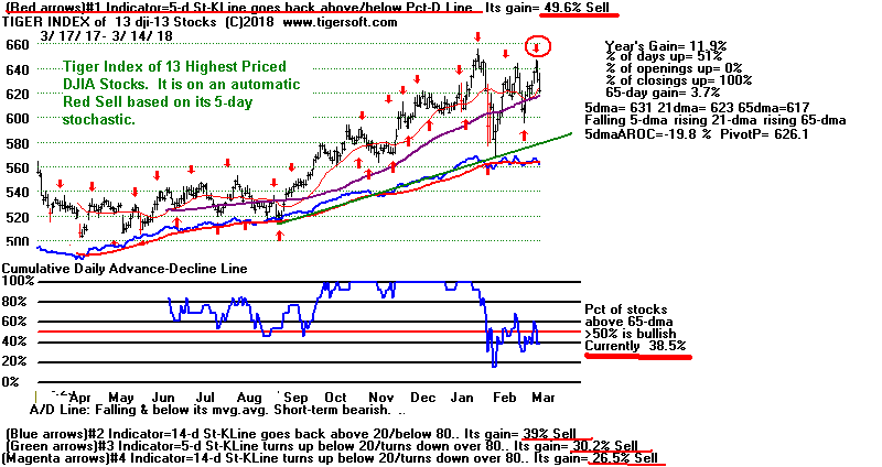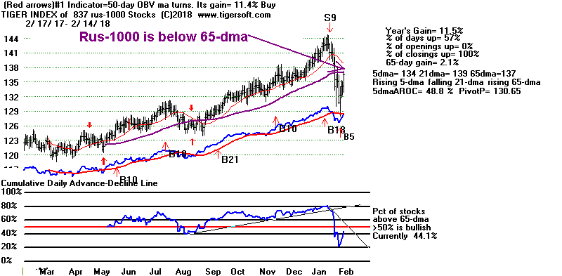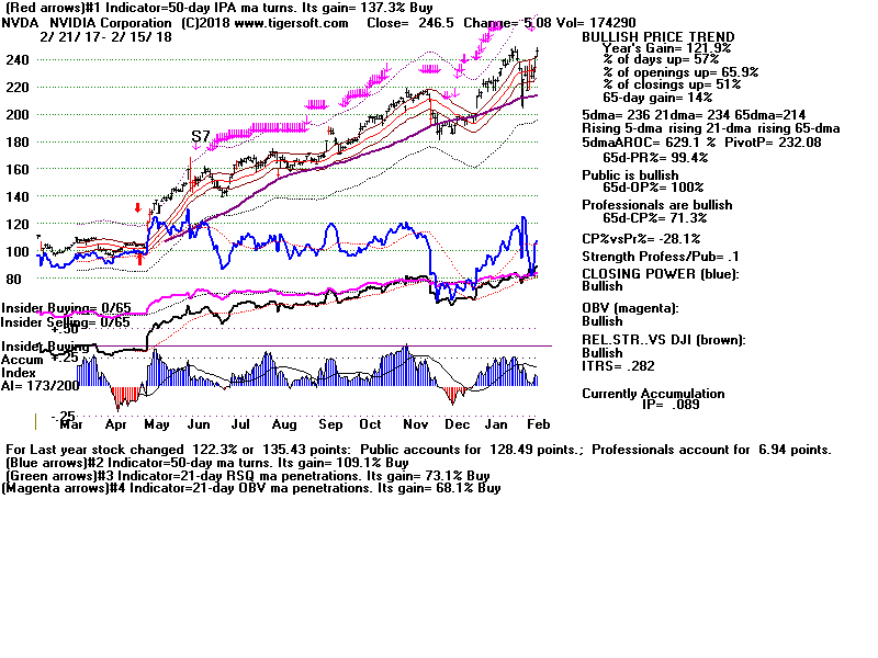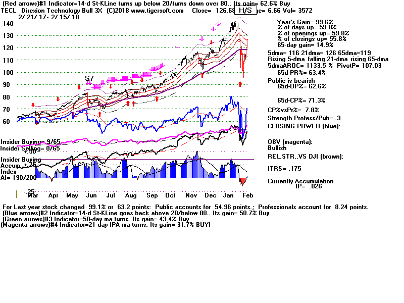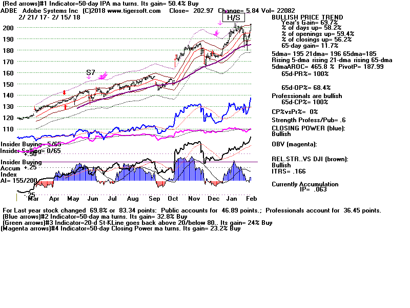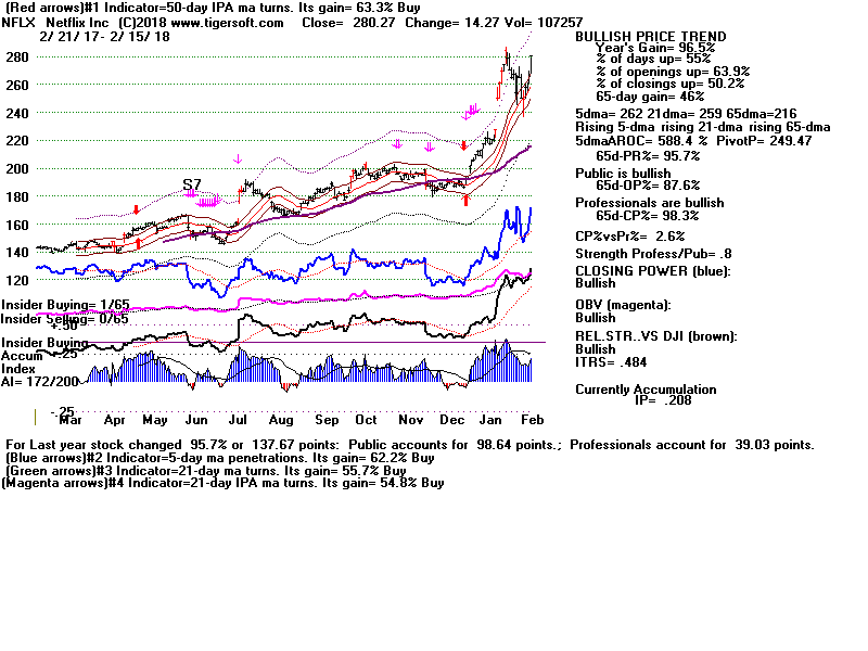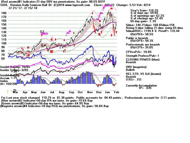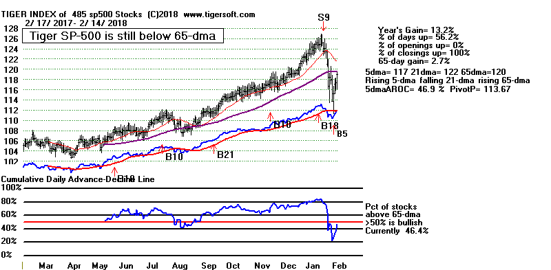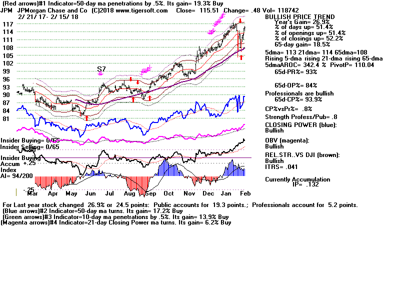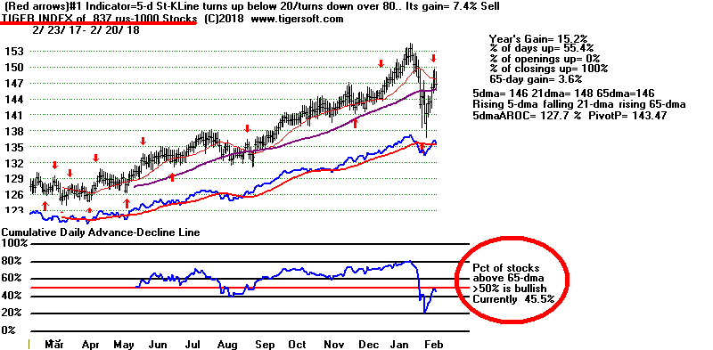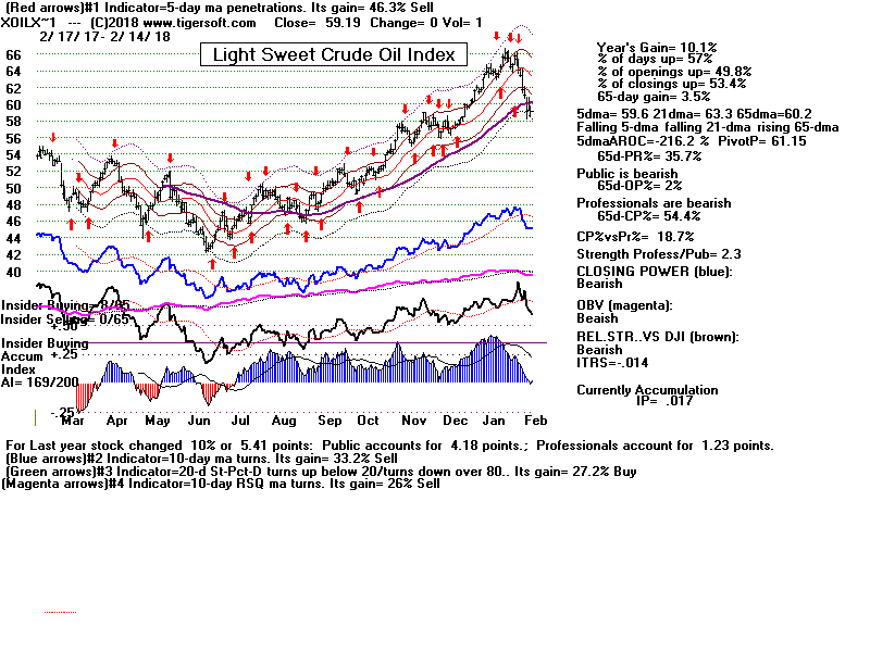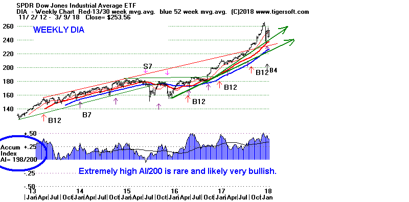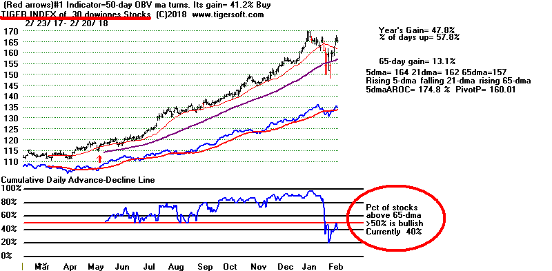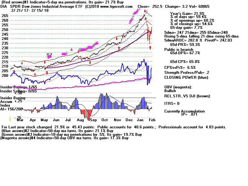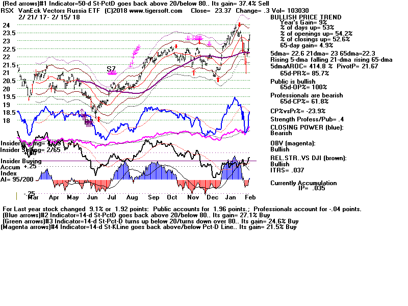 BIGVODN 40 Table 3 Count of Stocks and New Highs in Key Tiger Directories Date = 180130 ------------------------------------------------------------------- BIGMIL 6 1 17 % ===================================================== HOSPITAL 8 1 13 % MILITARY 38 2 5 % BEVERAGE 20 1 5 % GAMING 28 1 4 % INDEXES 194 7 4 % AUTO 39 1 3 % FINANCE 93 3 3 % NIFTY 30 1 3 % MORNSTAR 238 6 3 % CHEM 64 1 2 % BIOTECH 387 9 2 % SP500 485 12 2 % RUS-1000 837 15 2 % NASD-100 100 2 2 % RETAIL 53 1 2 % UTILITY 43 1 2 % SP-100 96 1 1 % INDMATER 90 1 1 % SEMI 130 1 1 % =====================================================Table 4 RANKING OF KEY DIRECTORIES BASED PCT.OF STOCKS ABOVE 65-DMA 1/30/18 Bullish = 38 Bearish = 8 --------------------------------------------------------------------------------------- Directory Current day-1 day-2 day-3 day-4 day-5 ---------------------------------------------------------------------------------------- BIGMIL 1 1 1 1 1 1 HOSPITAL 1 .875 .875 .875 .875 .875 ETFS .939 .969 .969 .969 .954 .954 INDEXES .932 .938 .927 .927 .932 .907 DJI-13 .923 .923 .923 .923 1 1 DOWJONES .9 .9 .9 .9 .933 .933 SP-100 .885 .895 .916 .927 .927 .937 MORNSTAR .873 .894 .92 .911 .92 .924 AUTO .871 .871 .897 .871 .871 .871 BIGBANKS .857 1 1 1 1 1 INFRA .857 .885 .942 .914 .885 .942 TRANSP .85 .8 .85 .8 .9 1 RETAIL .83 .867 .867 .867 .867 .849 NASD-100 .82 .85 .89 .86 .86 .89 FINANCE .817 .827 .827 .849 .849 .903 MILITARY .815 .789 .763 .789 .736 .736 BEVERAGE .8 .8 .85 .8 .8 .8 COMODITY .8 .8 .8 .742 .757 .7 N=18 -------------------------------------------------------------------------------------------- SP500 .787 .812 .851 .841 .83 .839 GAMING .785 .785 .821 .857 .821 .821 JETS .777 .666 .666 .666 .777 1 INDMATER .766 .8 .855 .855 .855 .844 CHINA .75 .75 .796 .781 .781 .796 RUS-1000 .75 .774 .805 .802 .799 .808 NIFTY .733 .8 .8 .766 .833 .866 REGBANKS .727 .757 .787 .757 .787 .848 SOFTWARE .727 .772 .818 .742 .757 .818 GOLD .725 .725 .862 .803 .901 .862 PIPELINE .714 .714 .714 .714 .714 .714 OILGAS .702 .773 .794 .794 .808 .815 COAL .7 .8 .8 .9 .9 .8 COMPUTER .652 .739 .739 .739 .782 .826 BIOTECH .633 .687 .695 .682 .653 .702 INSURANC .625 .625 .687 .75 .687 .718 FOOD .6 .666 .6 .4 .466 .333 HACKERS .6 .68 .72 .72 .72 .68 CHEM .578 .64 .671 .671 .687 .687 GREEN .516 .58 .548 .58 .645 .677 N= 20 ---------------------------------------------------------------------------------------------- ELECTRON .488 .533 .573 .505 .595 .646 SEMI .446 .5 .553 .461 .569 .6 HOMEBLDG .411 .47 .647 .647 .882 .882 EDU .285 .428 .714 .714 .714 .714 UTILITY .255 .232 .232 .209 .162 .139 SOLAR .238 .38 .333 .333 .38 .38 REIT .118 .124 .175 .231 .225 .248 BONDFUND .018 .036 .081 .081 .081 .099 N= 8
