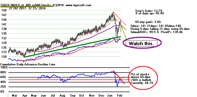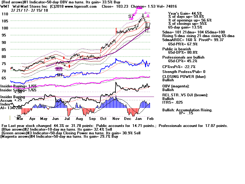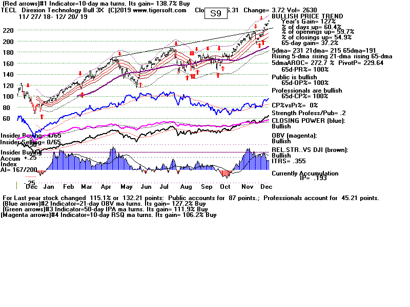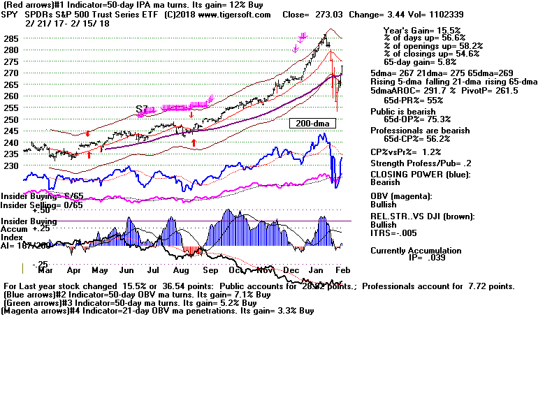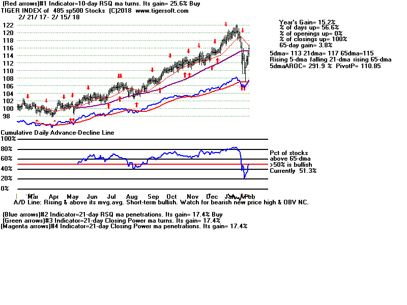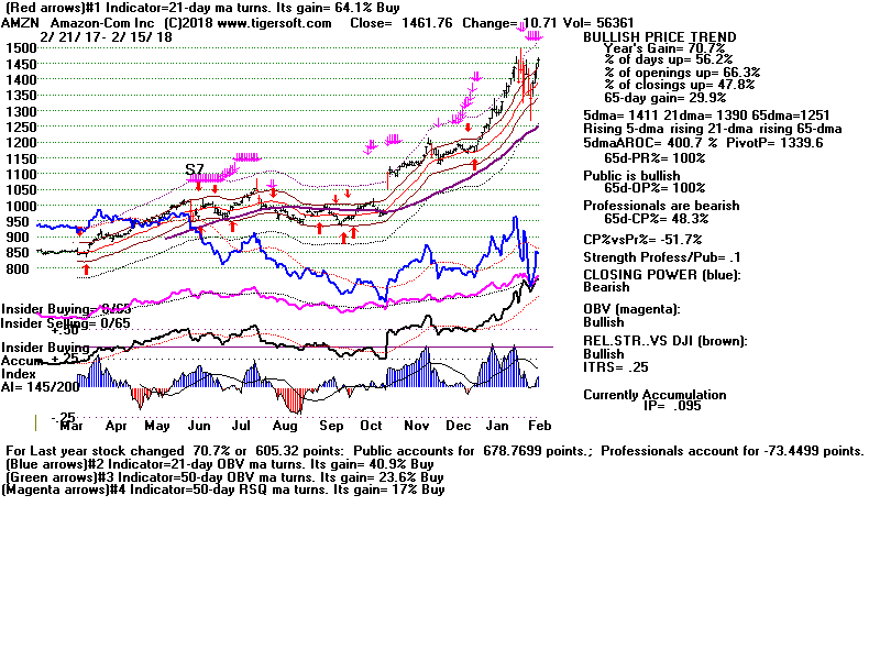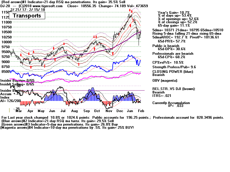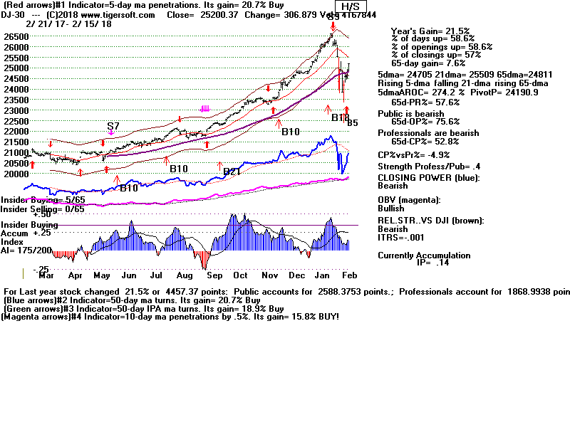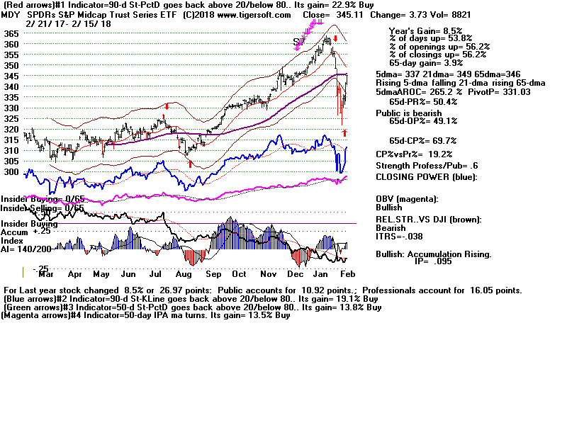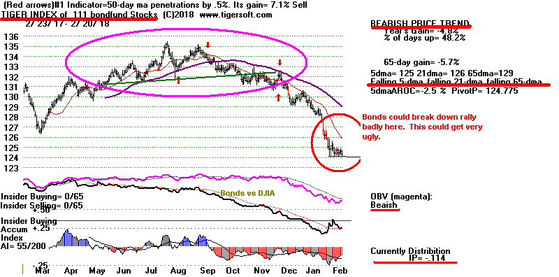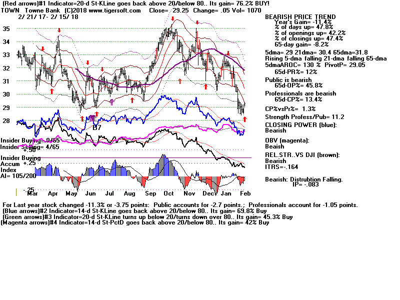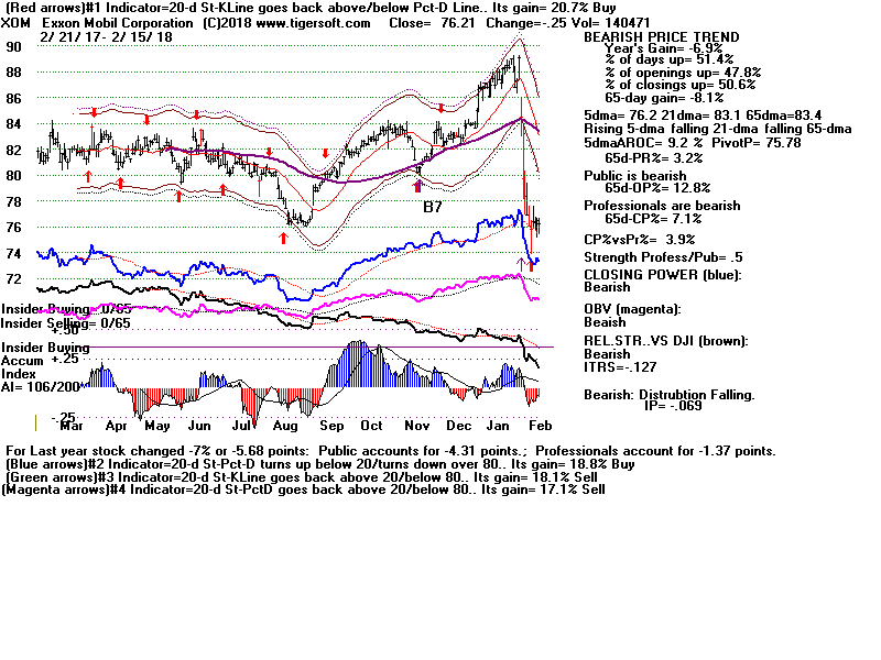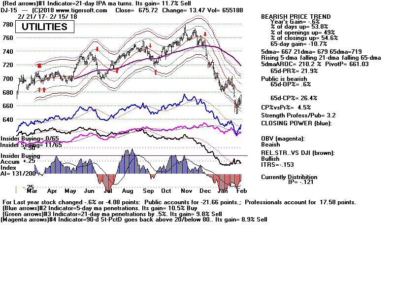 BIGVODN 40 Table 3 Count of Stocks and New Highs in Key Tiger Directories Date = 180130 ------------------------------------------------------------------- BIGMIL 6 1 17 % ===================================================== HOSPITAL 8 1 13 % MILITARY 38 2 5 % BEVERAGE 20 1 5 % GAMING 28 1 4 % INDEXES 194 7 4 % AUTO 39 1 3 % FINANCE 93 3 3 % NIFTY 30 1 3 % MORNSTAR 238 6 3 % CHEM 64 1 2 % BIOTECH 387 9 2 % SP500 485 12 2 % RUS-1000 837 15 2 % NASD-100 100 2 2 % RETAIL 53 1 2 % UTILITY 43 1 2 % SP-100 96 1 1 % INDMATER 90 1 1 % SEMI 130 1 1 % =====================================================Table 4 RANKING OF KEY DIRECTORIES BASED PCT.OF STOCKS ABOVE 65-DMA 1/30/18 Bullish = 38 Bearish = 8 --------------------------------------------------------------------------------------- Directory Current day-1 day-2 day-3 day-4 day-5 ---------------------------------------------------------------------------------------- BIGMIL 1 1 1 1 1 1 HOSPITAL 1 .875 .875 .875 .875 .875 ETFS .939 .969 .969 .969 .954 .954 INDEXES .932 .938 .927 .927 .932 .907 DJI-13 .923 .923 .923 .923 1 1 DOWJONES .9 .9 .9 .9 .933 .933 SP-100 .885 .895 .916 .927 .927 .937 MORNSTAR .873 .894 .92 .911 .92 .924 AUTO .871 .871 .897 .871 .871 .871 BIGBANKS .857 1 1 1 1 1 INFRA .857 .885 .942 .914 .885 .942 TRANSP .85 .8 .85 .8 .9 1 RETAIL .83 .867 .867 .867 .867 .849 NASD-100 .82 .85 .89 .86 .86 .89 FINANCE .817 .827 .827 .849 .849 .903 MILITARY .815 .789 .763 .789 .736 .736 BEVERAGE .8 .8 .85 .8 .8 .8 COMODITY .8 .8 .8 .742 .757 .7 N=18 -------------------------------------------------------------------------------------------- SP500 .787 .812 .851 .841 .83 .839 GAMING .785 .785 .821 .857 .821 .821 JETS .777 .666 .666 .666 .777 1 INDMATER .766 .8 .855 .855 .855 .844 CHINA .75 .75 .796 .781 .781 .796 RUS-1000 .75 .774 .805 .802 .799 .808 NIFTY .733 .8 .8 .766 .833 .866 REGBANKS .727 .757 .787 .757 .787 .848 SOFTWARE .727 .772 .818 .742 .757 .818 GOLD .725 .725 .862 .803 .901 .862 PIPELINE .714 .714 .714 .714 .714 .714 OILGAS .702 .773 .794 .794 .808 .815 COAL .7 .8 .8 .9 .9 .8 COMPUTER .652 .739 .739 .739 .782 .826 BIOTECH .633 .687 .695 .682 .653 .702 INSURANC .625 .625 .687 .75 .687 .718 FOOD .6 .666 .6 .4 .466 .333 HACKERS .6 .68 .72 .72 .72 .68 CHEM .578 .64 .671 .671 .687 .687 GREEN .516 .58 .548 .58 .645 .677 N= 20 ---------------------------------------------------------------------------------------------- ELECTRON .488 .533 .573 .505 .595 .646 SEMI .446 .5 .553 .461 .569 .6 HOMEBLDG .411 .47 .647 .647 .882 .882 EDU .285 .428 .714 .714 .714 .714 UTILITY .255 .232 .232 .209 .162 .139 SOLAR .238 .38 .333 .333 .38 .38 REIT .118 .124 .175 .231 .225 .248 BONDFUND .018 .036 .081 .081 .081 .099 N= 8