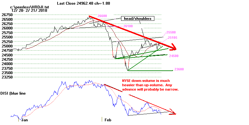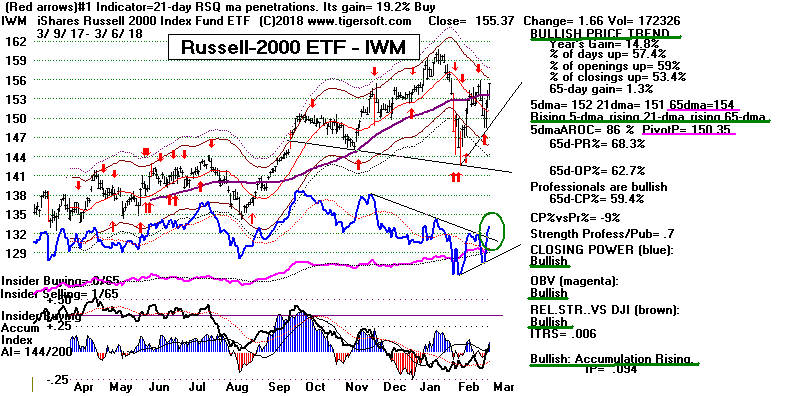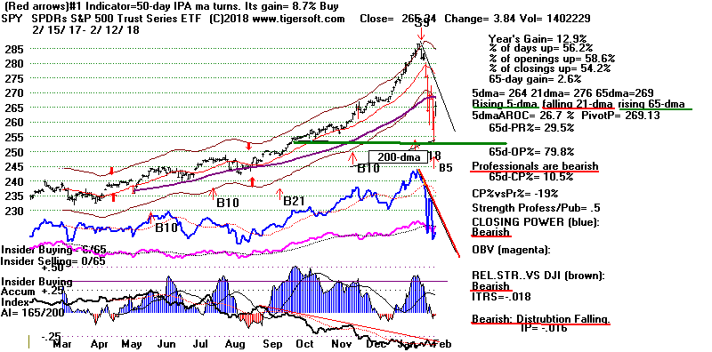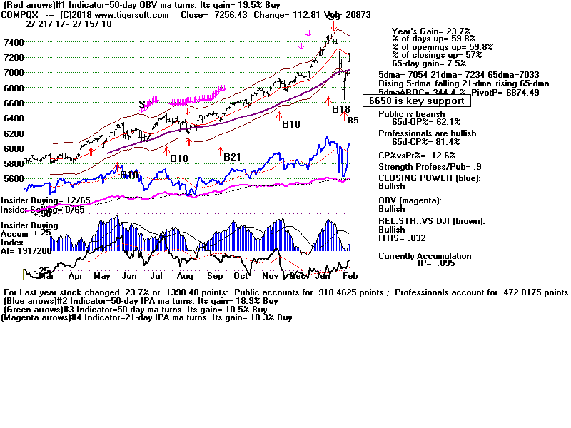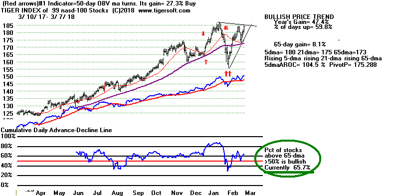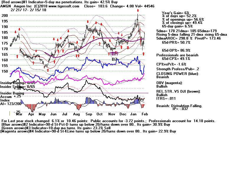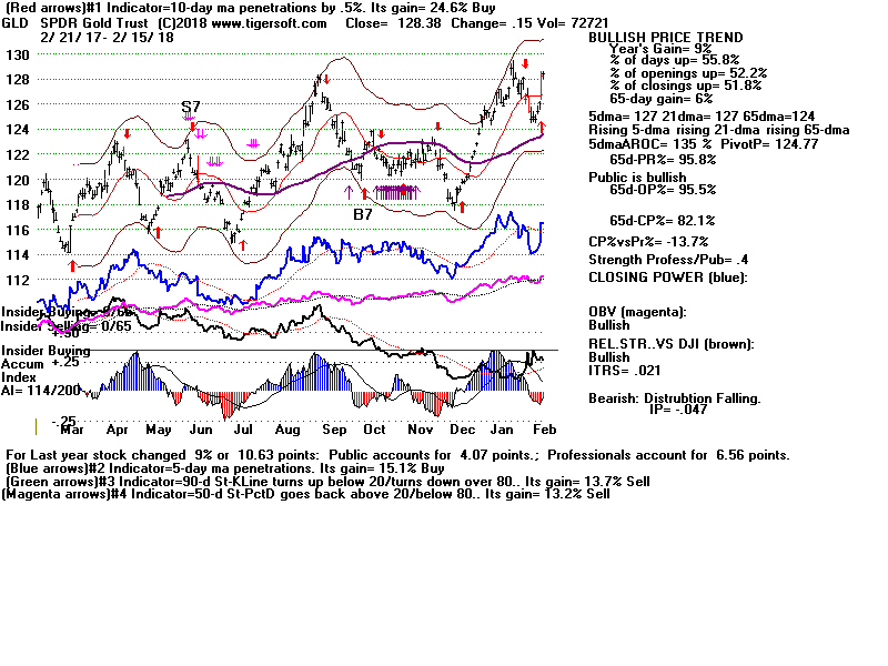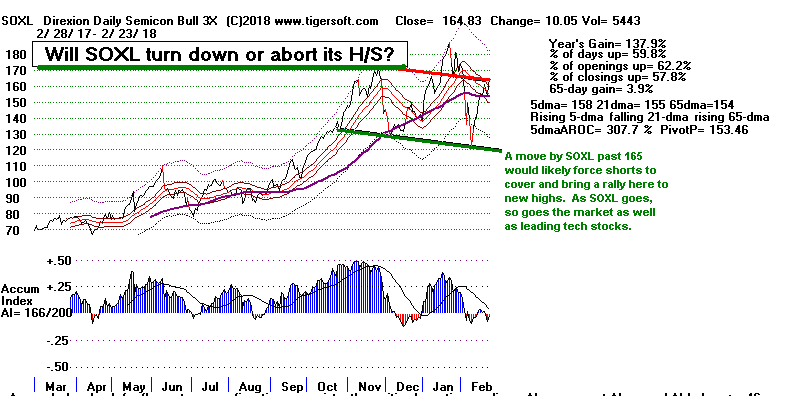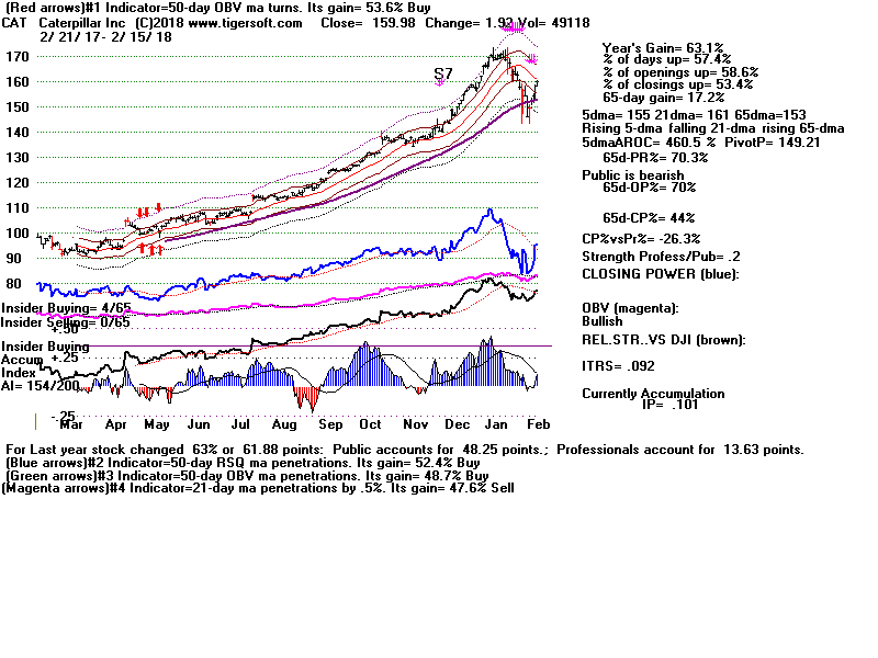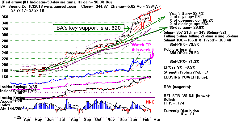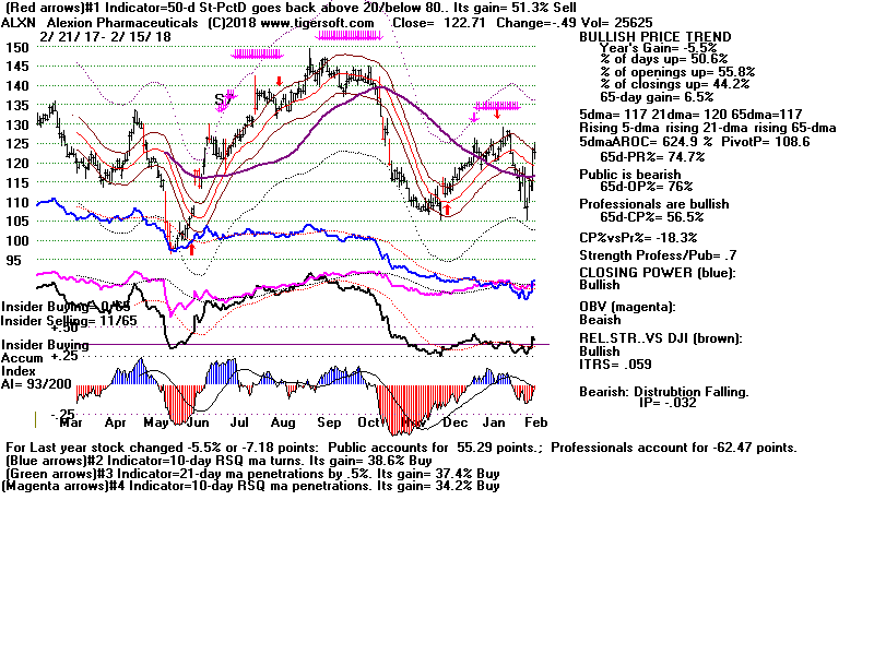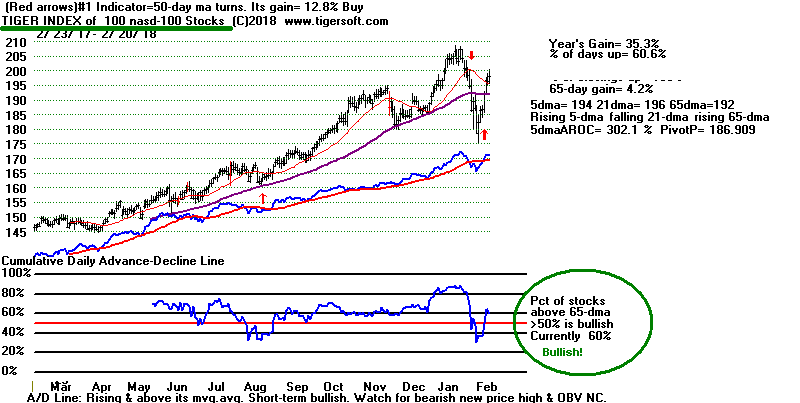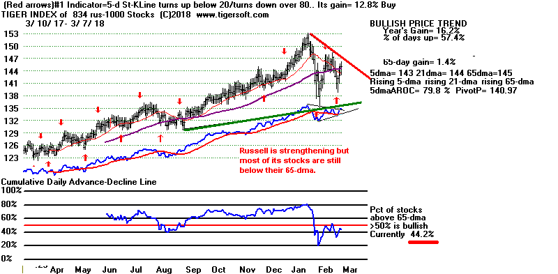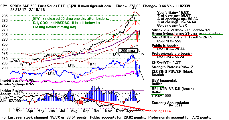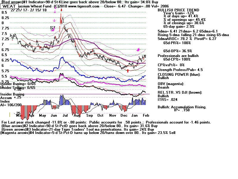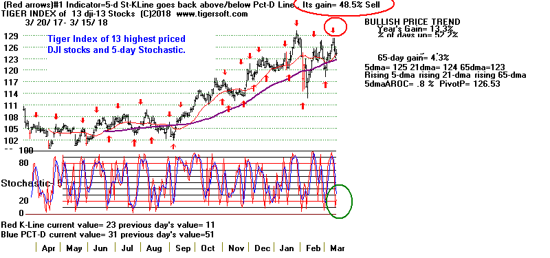 BIGVODN 40 Table 3 Count of Stocks and New Highs in Key Tiger Directories Date = 180130 ------------------------------------------------------------------- BIGMIL 6 1 17 % ===================================================== HOSPITAL 8 1 13 % MILITARY 38 2 5 % BEVERAGE 20 1 5 % GAMING 28 1 4 % INDEXES 194 7 4 % AUTO 39 1 3 % FINANCE 93 3 3 % NIFTY 30 1 3 % MORNSTAR 238 6 3 % CHEM 64 1 2 % BIOTECH 387 9 2 % SP500 485 12 2 % RUS-1000 837 15 2 % NASD-100 100 2 2 % RETAIL 53 1 2 % UTILITY 43 1 2 % SP-100 96 1 1 % INDMATER 90 1 1 % SEMI 130 1 1 % =====================================================Table 4 RANKING OF KEY DIRECTORIES BASED PCT.OF STOCKS ABOVE 65-DMA 1/30/18 Bullish = 38 Bearish = 8 --------------------------------------------------------------------------------------- Directory Current day-1 day-2 day-3 day-4 day-5 ---------------------------------------------------------------------------------------- BIGMIL 1 1 1 1 1 1 HOSPITAL 1 .875 .875 .875 .875 .875 ETFS .939 .969 .969 .969 .954 .954 INDEXES .932 .938 .927 .927 .932 .907 DJI-13 .923 .923 .923 .923 1 1 DOWJONES .9 .9 .9 .9 .933 .933 SP-100 .885 .895 .916 .927 .927 .937 MORNSTAR .873 .894 .92 .911 .92 .924 AUTO .871 .871 .897 .871 .871 .871 BIGBANKS .857 1 1 1 1 1 INFRA .857 .885 .942 .914 .885 .942 TRANSP .85 .8 .85 .8 .9 1 RETAIL .83 .867 .867 .867 .867 .849 NASD-100 .82 .85 .89 .86 .86 .89 FINANCE .817 .827 .827 .849 .849 .903 MILITARY .815 .789 .763 .789 .736 .736 BEVERAGE .8 .8 .85 .8 .8 .8 COMODITY .8 .8 .8 .742 .757 .7 N=18 -------------------------------------------------------------------------------------------- SP500 .787 .812 .851 .841 .83 .839 GAMING .785 .785 .821 .857 .821 .821 JETS .777 .666 .666 .666 .777 1 INDMATER .766 .8 .855 .855 .855 .844 CHINA .75 .75 .796 .781 .781 .796 RUS-1000 .75 .774 .805 .802 .799 .808 NIFTY .733 .8 .8 .766 .833 .866 REGBANKS .727 .757 .787 .757 .787 .848 SOFTWARE .727 .772 .818 .742 .757 .818 GOLD .725 .725 .862 .803 .901 .862 PIPELINE .714 .714 .714 .714 .714 .714 OILGAS .702 .773 .794 .794 .808 .815 COAL .7 .8 .8 .9 .9 .8 COMPUTER .652 .739 .739 .739 .782 .826 BIOTECH .633 .687 .695 .682 .653 .702 INSURANC .625 .625 .687 .75 .687 .718 FOOD .6 .666 .6 .4 .466 .333 HACKERS .6 .68 .72 .72 .72 .68 CHEM .578 .64 .671 .671 .687 .687 GREEN .516 .58 .548 .58 .645 .677 N= 20 ---------------------------------------------------------------------------------------------- ELECTRON .488 .533 .573 .505 .595 .646 SEMI .446 .5 .553 .461 .569 .6 HOMEBLDG .411 .47 .647 .647 .882 .882 EDU .285 .428 .714 .714 .714 .714 UTILITY .255 .232 .232 .209 .162 .139 SOLAR .238 .38 .333 .333 .38 .38 REIT .118 .124 .175 .231 .225 .248 BONDFUND .018 .036 .081 .081 .081 .099 N= 8