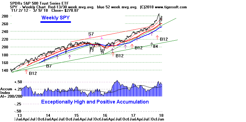 SPY Charts since 1994: Advisory Closing Power S7s, Accum. Index, 65-dma, Optimized Signals.