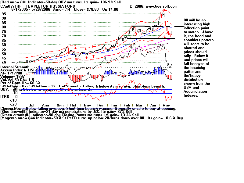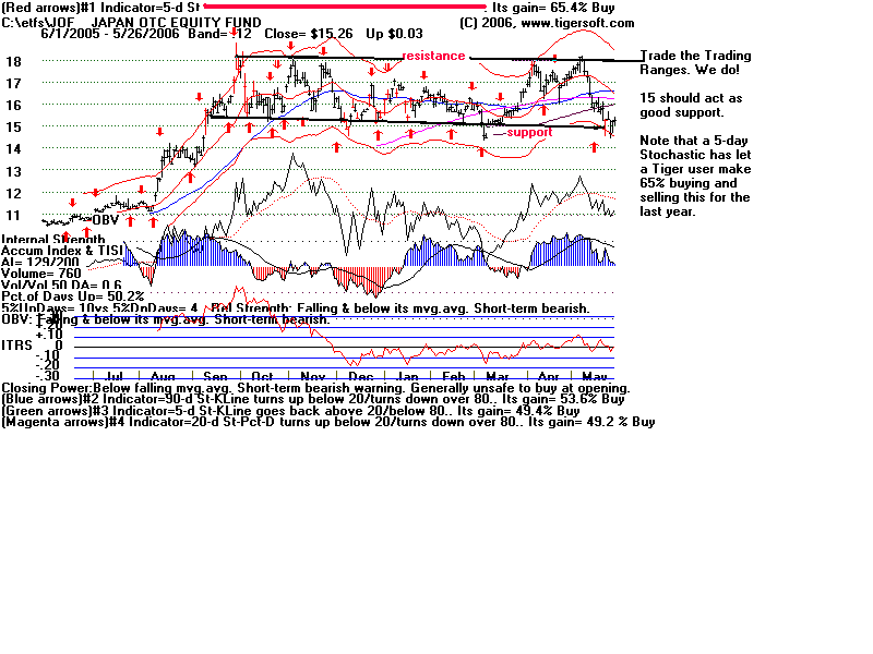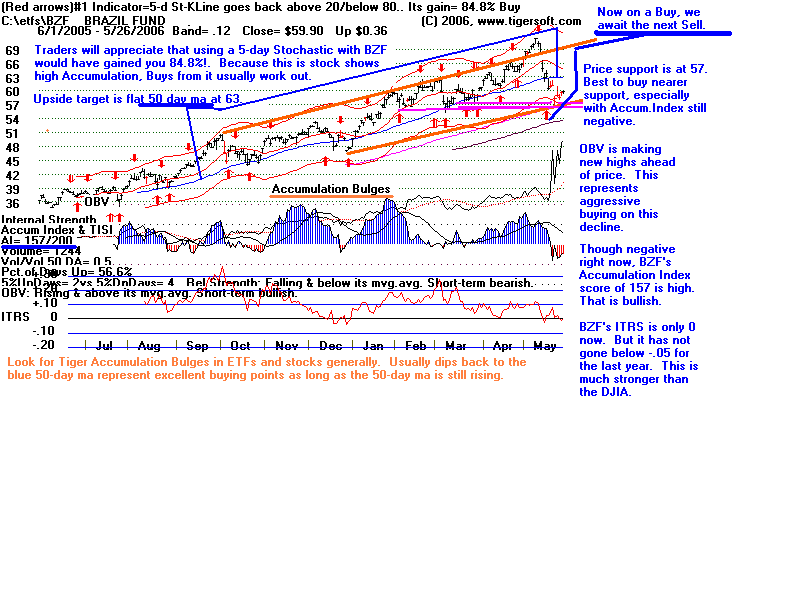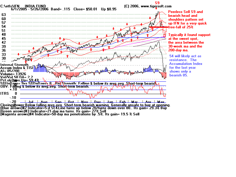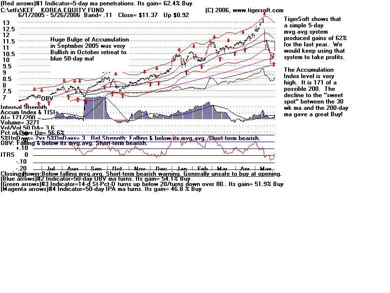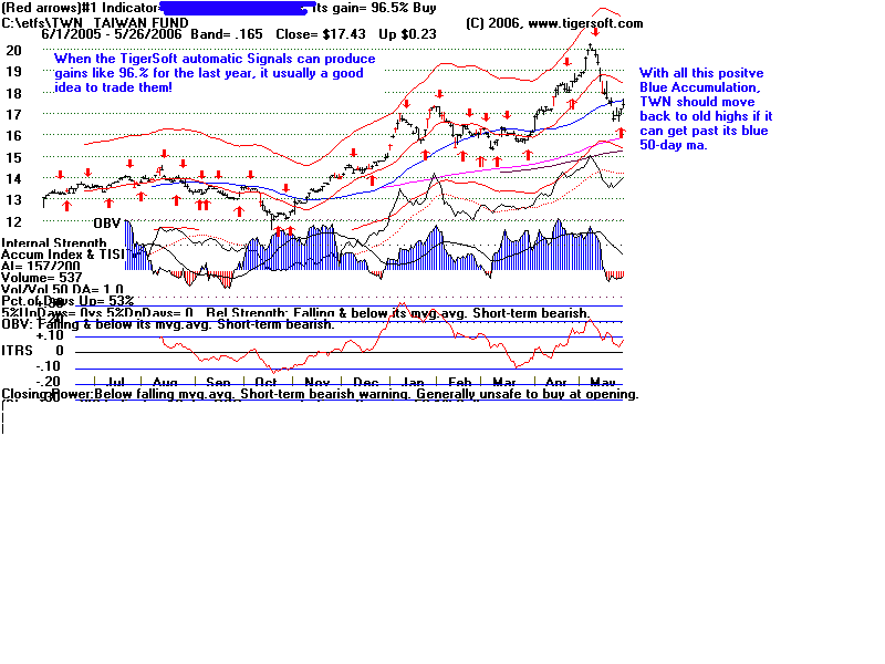2006 The Peerless Sell S9 hit foreign ETFs very hard. On average, they have volatility about twice that of the DJI-30. We used the S9 to sell out of these ETFs. Get Peerless and be prepared for the next big drop! ETFs like IFN, JOF and IXN looked particularly vulnerable at their recent tops. Each fell 20%. A rebound has started from he support of longer term moving averages. Here is our current analysis of a number of them. Not shown in most of the charts is what is the basis for our Top trading systems. TigerSoft users will see this at the top of the page. Right now our ranking programs show that the top performing ETFs in the last 3 days, since the bottom, are : KEF and TRF, each up 10%. The chart of TRF will give traders some ideas. It is at a "high inflection" point. Whichever way it swings, it will likely make a worthwhile trade. 34 ETFs are on TigerSoft Buys. 21 are on Sells. The highest Accumulation ETFs are JOF, EWG, EWA and EZA (South Africa). EZA also has the highest current Accumulation index value. Its chart is not shown. But it have a great buy at about 100. And a target of 113 seems reasonable if it can start to close its downside gap over 110. Look also at: BZF (Brazil) - on a BUY from system which has gained 84.8% for last year. CHN (China) - on a BUY from system which has gained 87.9% for last year. EPP (Pacific, ex-Japan) - on a Sell from system which has gained 27.1% for last year. EWK (Belgium) - on a BUY from system which has gained 30.3% for last year. EZU (MSCI EMU Index) -on a BUY from system which has gained 18.5% for last year. IFN (India) - on a BUY from system which has gained 99% for last year. IXN (Global Technology) - on a BUY from system which has gained 55.5% for last year. Heavy Distribution, JOF (Japan OTC) - on a BUY from system which has gained 65.4% for last year. KEF (Korea Fund) - on a BUY from system which has gained 62.4% for last year. MXF (Mexico Fund) - on a BUY from system which has gained 89.2% for last year. TRF (Templeton Russia Fund) - on a BUY from system which has gained 106.9% for last year. TWN (Taiwan) - on a BUY from system which has gained 96.5% for last year.