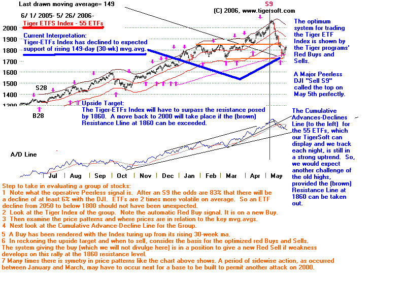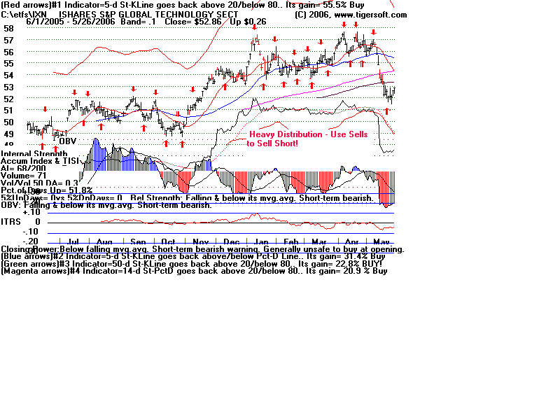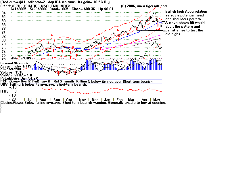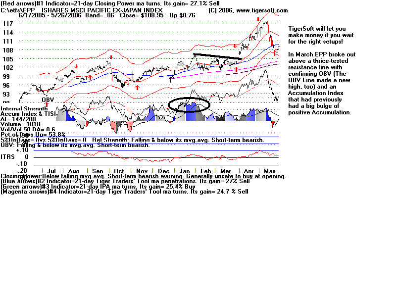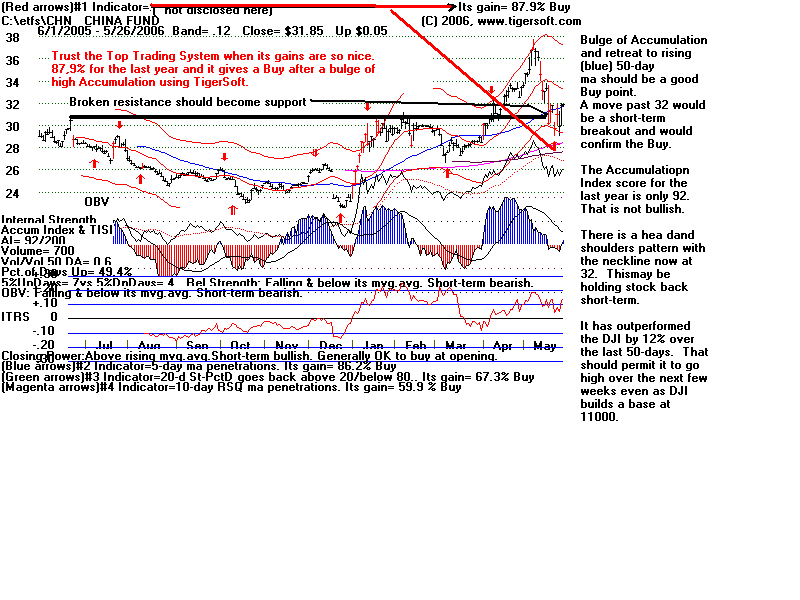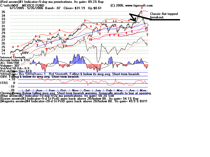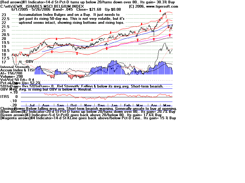 2006 The Peerless Sell S9 hit foreign ETFs very hard. On average, they have volatility about twice that of the DJI-30. We used the S9 to sell out of these ETFs. Get Peerless and be prepared for the next big drop! ETFs like IFN, JOF and IXN looked particularly vulnerable at their recent tops. Each fell 20%. A rebound has started from he support of longer term moving averages. Here is our current analysis of a number of them. Not shown in most of the charts is what is the basis for our Top trading systems. TigerSoft users will see this at the top of the page. Right now our ranking programs show that the top performing ETFs in the last 3 days, since the bottom, are : KEF and TRF, each up 10%. The chart of TRF will give traders some ideas. It is at a "high inflection" point. Whichever way it swings, it will likely make a worthwhile trade. 34 ETFs are on TigerSoft Buys. 21 are on Sells. The highest Accumulation ETFs are JOF, EWG, EWA and EZA (South Africa). EZA also has the highest current Accumulation index value. Its chart is not shown. But it have a great buy at about 100. And a target of 113 seems reasonable if it can start to close its downside gap over 110. Look also at: BZF (Brazil) - on a BUY from system which has gained 84.8% for last year. CHN (China) - on a BUY from system which has gained 87.9% for last year. EPP (Pacific, ex-Japan) - on a Sell from system which has gained 27.1% for last year. EWK (Belgium) - on a BUY from system which has gained 30.3% for last year. EZU (MSCI EMU Index) -on a BUY from system which has gained 18.5% for last year. IFN (India) - on a BUY from system which has gained 99% for last year. IXN (Global Technology) - on a BUY from system which has gained 55.5% for last year. Heavy Distribution, JOF (Japan OTC) - on a BUY from system which has gained 65.4% for last year. KEF (Korea Fund) - on a BUY from system which has gained 62.4% for last year. MXF (Mexico Fund) - on a BUY from system which has gained 89.2% for last year. TRF (Templeton Russia Fund) - on a BUY from system which has gained 106.9% for last year. TWN (Taiwan) - on a BUY from system which has gained 96.5% for last year.