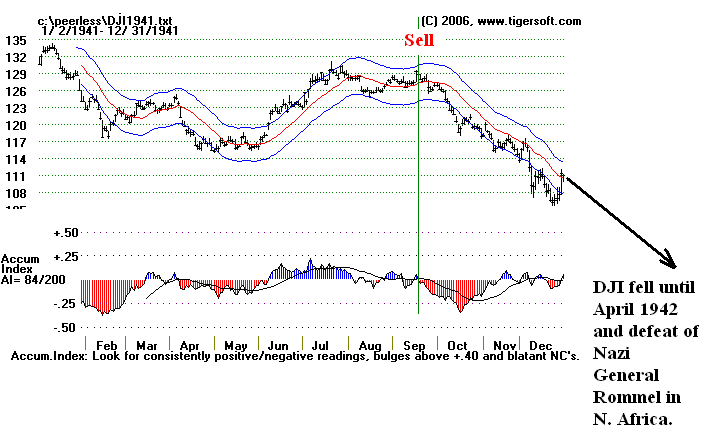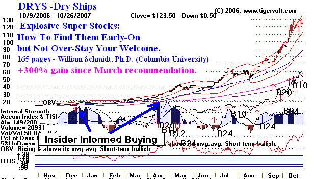 Investing with Tiger Soft Longer term - 6 months to two year or more Volatility may vary, but risk must be limited. Using Stocks, Murual Funds or Exchange Traded Funds. Things you should know. 1. Bull Markets don't last forever. Bear markets can wipe out 20% to 90% of your invesments, depending on their length and severity. Our website lets you see year after year of the Dow Jones Inustrial Average with the automatic Peerless Buy and Sell signals.. Peerless Major Signals on DJI-30: 1965-2007 1965 1966 1967 1968 1969 1969-1970 1970 1971 1972 1973 1974 1975 1976 1977 1978 1979 1980 1981 Written in 1981, Peerless called the October 1987 Top and Crash perfectly. Recently Peerless called the May-June 2006 decline and the July DJI-30 peak at 14,000 perfectly. 1982 1983 1984 1985 1986 1987 1988 1989 1990 1991 1992 1993 1994 1994-5 1995 1996 1997 1998 1999 2000 2001 2002 2002-3 2003 2004 2005 2006 2007 The present bull market started in March 2003. We have now gone a record 55 months without even a correction of more than 10% on the DJI. Instead of just buying and holding your investments until you need the money or your emotions get the better of you, we want you to use our Peerless Stock Market Timing. Peerless shows you how to avoid the bad times and come back in when it's safe. Peerless can make your investing much safer and much more profitable. 2. Using the Peerless automatic Buy and Sell signals on the general market using the DJIA can put a lot more money in your pockets no matter what you trade. http://www.tigersoft.com/--1--/index.html 3. Peerless keeps on working. We have even back-tested it to 1915, though some of the data is incomplete. Get out before there is a sharp sell-off. 1929 top .... http://www.tigersoft.com/1929-1965/DJI1929.gif Nazi attack on Western Europe ... 1940 ... http://tigersoft.com/charts/adji3940.gif Japanese attack on Pearl Harbor ... 1941 ... http://www.tigersoft.com/1929-1965/DJI1941.gif Cuban Missle Crisis - 1962 ... http://www.tigersoft.com/1929-1965/DJI1962.GIF October 1987 Crash ... http://www.tigersoft.com/Peerless-Signals/dji87.gif Peerless Stock Market Timing: 1965-2007 Track Record +17.5% to +28%/Year on DJI-30 2002-2007 Buys and Sells Date Signal DJI Gain -------------- --------- ---------- -------------- 5/15/2002 Sell 10244 +20.0% 7/24/2002 Buy 8191 +7.1% 1/6/2003 Sell 8774 +14.2% 3/11/2003 Buy 7524 + 41.1% 2/20/2004 Sell 10619 +3.7% 3/12/2004 Buy 10240 +3.2% 4/6/2004 Sell 10571 +5.7% 5/10/2004 Buy 9990 +2.9% 1/3/2005 Sell 10729 +4.8% 4/21/2005 Buy 10219 +13.3% 5/5/2006 Sell 11577 +6.8% 6/12/2006 Buy 10793 +14.9% 1/5/2007 Sell 12398 +2.8% 3/5/2007 Buy 12050 +15.9% 7/17/2007 Sell 13972 +4.9% 8/29/07 Minor Buy 13289 +3.7% 10/3/07 Minor Sell 13968 +3.2% 10/19/07 Minor Buy 13522 Open List of All Peerless Buys/Sells: 1965-200 return of +21.9%, as Peerless has since 1965, would turn your $200,000 into $538,329. Over 12 years, 6.7% will grow $100,000 into $217,757. On the other hand, getting a return of +21.9%, as Peerless has since 1965, would turn your $100,000 into $1,076,575. Over 20 years, 6.7% will grow $40,000 into $146,335. On the other hand, getting a return of +21.9%, as Peerless has since 1965, would turn your $100,000 into $2,099,588. Go to http://www.tigersoft.com/Returns/index.html 5.. Regardless of the sector you invest in, the Peerless Buy and Sell signals let you improve upon buying and holding. Think of the market as a tide that lifts and then lowers all boats. The only exceptions are oil, precious metals and real estate. Our study of Fidelity Sector funds proves this. Here are our studies: http://www.tigersoft.com/mutuals/Peerless%20signals%20-%20Fidelity.html http://www.tigersoft.com/mutuals/index.htm 6. When you become more confident that you can avoid a bear market, you can become more aggressive in your investments. This will increase your returns. In this, TigerSoft can show you how to find the best indidual stocks and mutual funds. Our nightly hotline reviews stocks and industry groups each night. See example. http://www.tigersoft.com/AAA/index.html 7. Use our Tiger Tahiti System, invest in the most accumulated DJI-30 stock as measured by our Tiger Power Ranker and make 24%/year. Back-tested to 1970, this system buys only the safest blue chips, one each quarter, which we hold for nearly 2 years unless our Peerless system flashes a multiple set of Sells in a six month period. This is extremely silmple to follow. And you add to positions over a 21 month period, so that market fluctuations are not reduced. See http://www.tigersoft.com/educate/tahiti.htm ![]() 8. Buy the stocks that are the most intensely accumulated, using the rules of the Tiger Insider Watch system. These are often more speculative stocks. We buy them because we have such clear evidence that insiders are buying.them Since 1990, when held automatically for a year, these stocks have produced an average annual gain of 36% per year. Book and System - http://www.tigersoft.com/--3--/index.html Recent examples - http://www.tigersoft.com/Tigersoft-Explosive/index.html 9. The biggest gainers usually show intense insider buying early in their advances. Learn to spot these tell tale signs using our books and software. Rank the best performing stocks of any period and you will see the same patterns we show you how to spot. For example: The best perfoming stocks of 2006-2007 http://www.tigersoft.com/Biggest%20Gainers/index.html The best and worst performing stocks of 2007 http://tigersoft.com/Tiger-Blogs/8-30-2007/index.htm 10. Don't be afraid to take a small loss. Our 36%/year gain jumps up to 55%/year if you apply a simple stop loss we will tell you about. Call 858-273-5900 or email william_schmidt@hotmail.com 11. Our "Explosive Super Stocks" book discusses when to sell these super stocks. They do not go up forever. You have to know when to take profits. 12. Finding the strongest sector and then using Tiger's Power Ranker to find the strongest stocks in that sector pays off ove