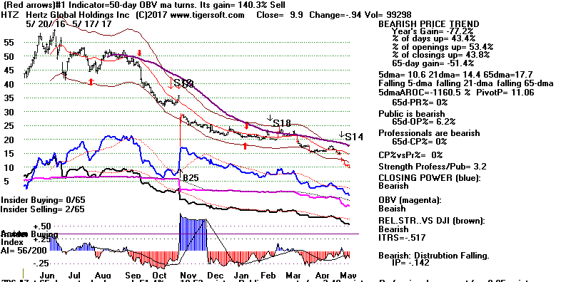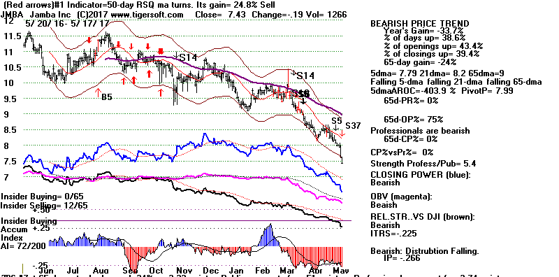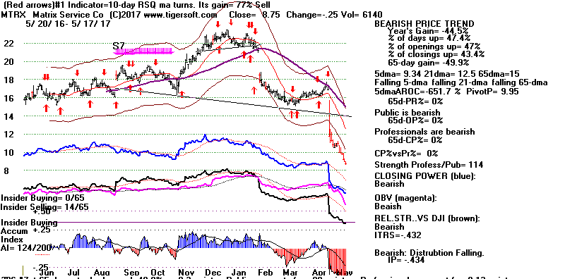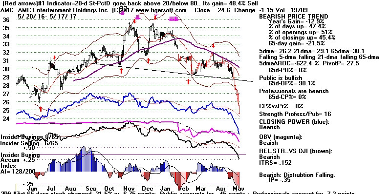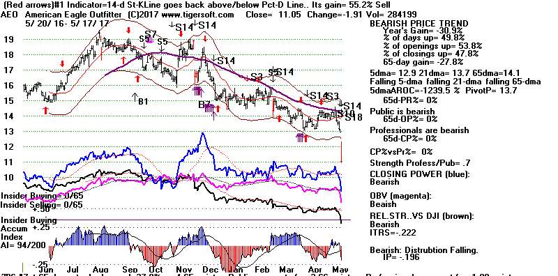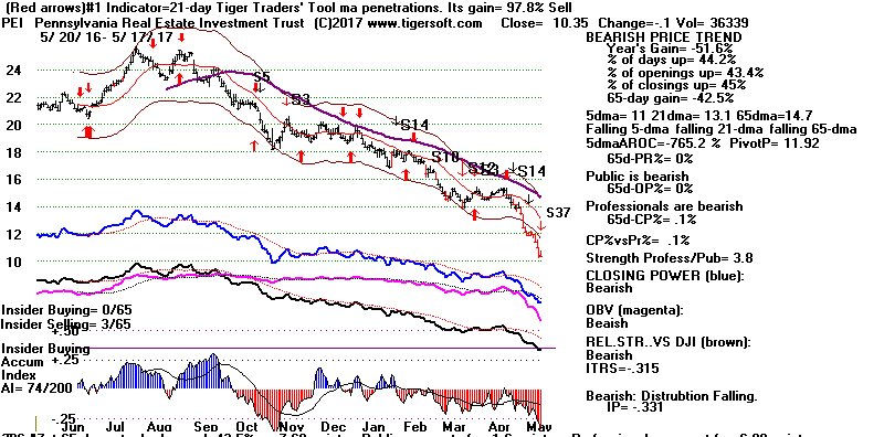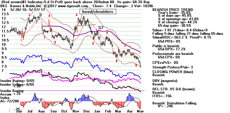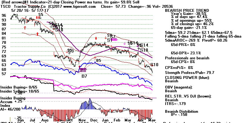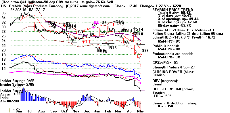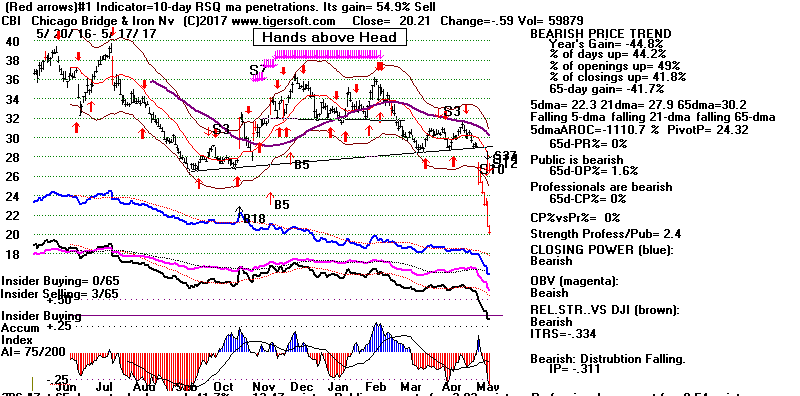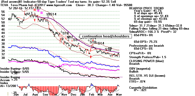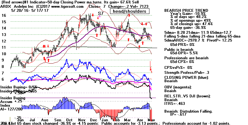 BEARISH MINCPS 5/17/2017 Note the five bearish signs: 1) head/shoulders, 2) Red Distribution with IP21 below its 21-dma 3) Falling Closing Power 4) S14 Heavy Volume Down Days 5) Price support failure.