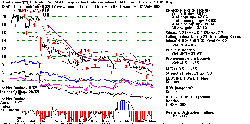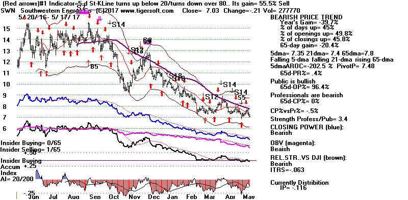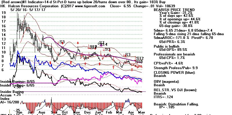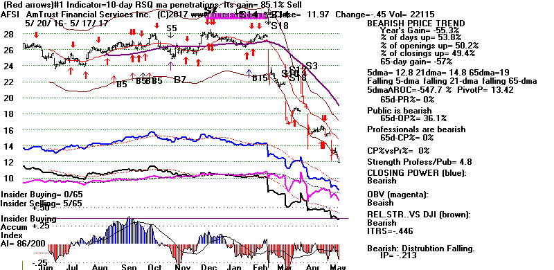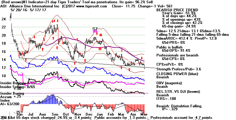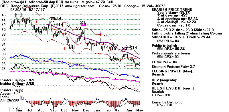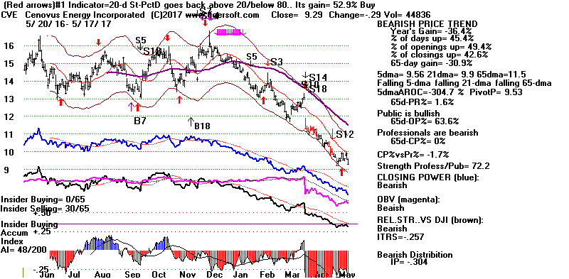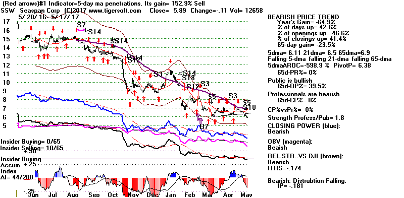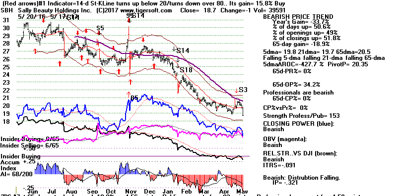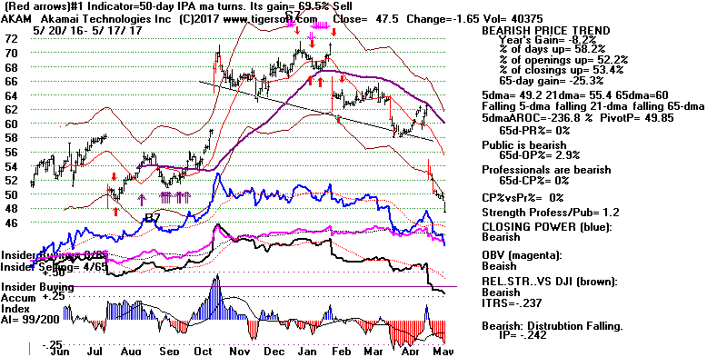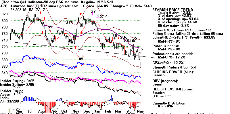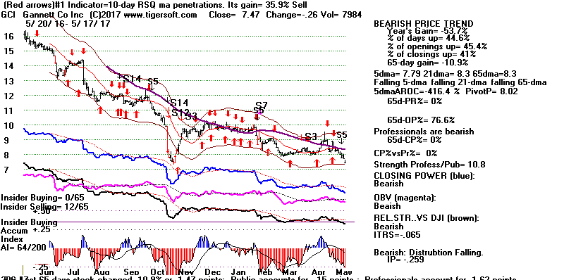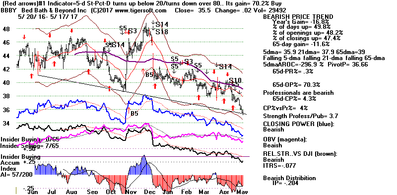 BEARISH MINCPS 5/17/2017 Note the five bearish signs: 1) head/shoulders, 2) Red Distribution with IP21 below its 21-dma 3) Falling Closing Power 4) S14 Heavy Volume Down Days 5) Price support failure.