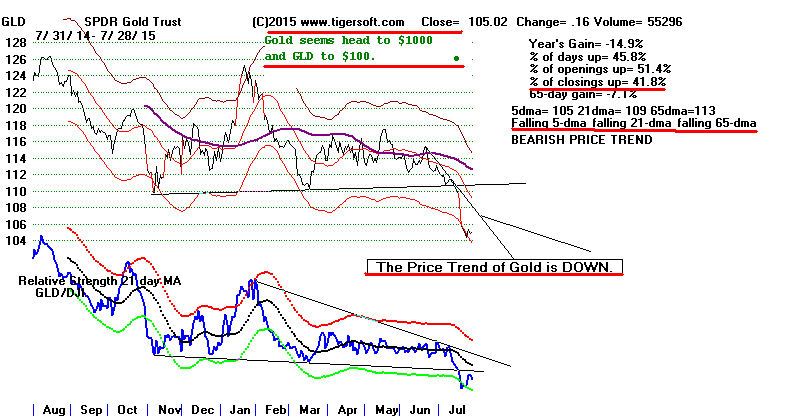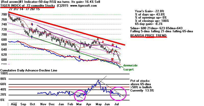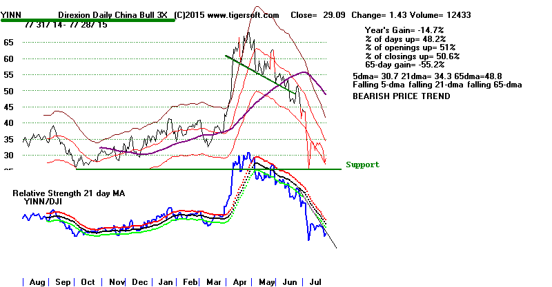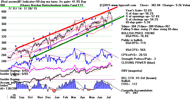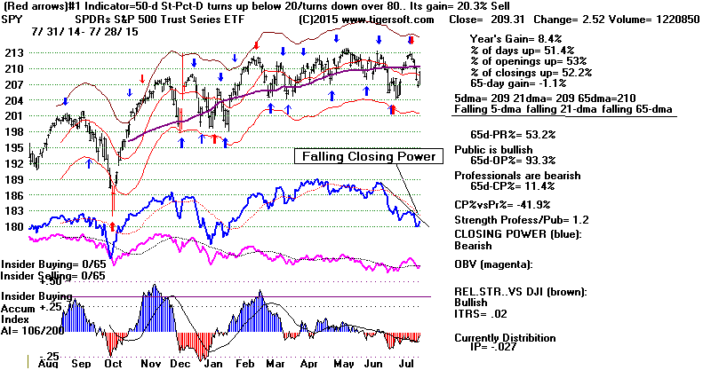 | Watch Biotechs and IBB. They are the leaders of what is left of the 2009-2015 bull market. Bulls will need to see them recover their strength to remain believers in the enduring power of this bull market. IBB's simple price-uptrendline has not been violated. Note the price channel is in. SPY is further above its green support than the DJI. It has more room to rally. But it is the DJIA, not SPY, that best predicts the overall market. In any case, no short-term Tiger Buy signal (blue or red) has appeared on the current decline. |