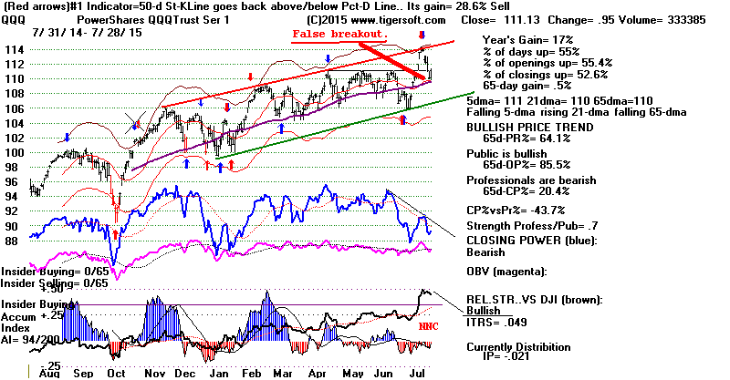 | The QQQ's false breakout above 111 has trapped many traders who chased the run-up in tech stocks. The false breakout is quite bearish. It also ran in many short sellers, so that there is less of a buying cushion on the next decline. |