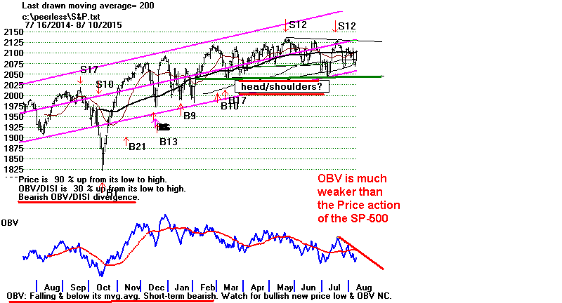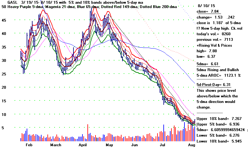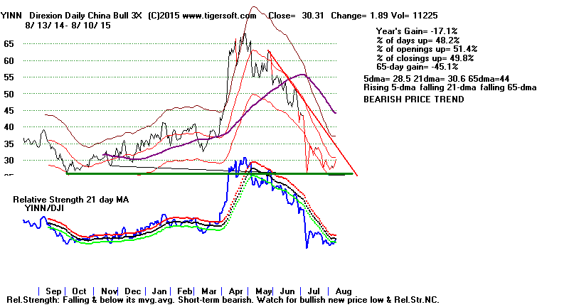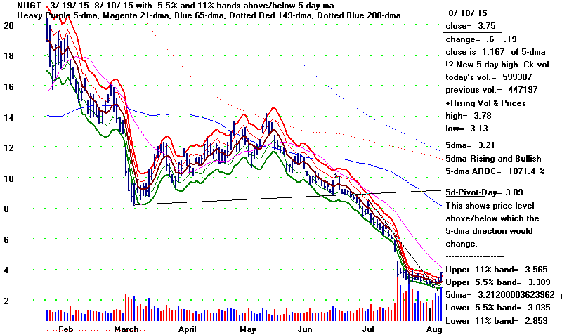 Key DJI-30 Stocks and General Market ETFs: ( C:\dji-30 ) 08/10/15 Rising 5-day ma 5DAROC% Symbol Last 5-dma Pivot Change .............................................................................................. IP21 AI/200 OP-PWR CP-PWR PCT-Up Daily Vol. notes ============================================================================================== 1123% GASL 7.84 6.61 6.31 1.53 -.3 53 Rising Falling .406 bullish --------------------------------------------------------------------------------------------- 1071.4% NUGT 3.75 3.21 3.09 .6 -.21 49 ? Falling .45 bullish --------------------------------------------------------------------------------------------- 273 OIH 32.2 31.1 30.42 1.43 -.14 83 Falling ? .434 vol.fell on up-day --------------------------------------------------------------------------------------------- 196.1 SOXL 27.36 25.95 25.47 1.91 .17 145 Rising Falling .55 bullish --------------------------------------------------------------------------------------------- 139.4 TECL 37.58 36.4 35.89 1.72 .16 119 Rising ? .558 bullish --------------------------------------------------------------------------------------------- 113.1 FAS 35.37 34.63 34.45 1 .23 148 Rising Rising .542 vol.fell on up-day --------------------------------------------------------------------------------------------- 90.3 KOL 9.64 9.44 9.43 .29 -.05 70 Falling Falling .406 vol.fell on up-day --------------------------------------------------------------------------------------------- 55.2 AAPL 119.72 116.08 114.64 4.2 .09 76 Falling Rising .506 bullish --------------------------------------------------------------------------------------------- 42.7 MDY 274.99 272.67 272.41 4.1 .01 137 Rising Falling .518 bullish --------------------------------------------------------------------------------------------- 31.2 GS 205.97 205.07 205.17 2.53 .02 128 Rising Falling .534 vol.fell on up-day --------------------------------------------------------------------------------------------- 30.2 HD 117.6 117.32 117.53 .67 .14 94 Rising ? .538 vol.fell on up-day --------------------------------------------------------------------------------------------- 22.9 NKE 115.36 115.5 115.77 .85 .06 118 Rising Falling .558 vol.fell on up-day --------------------------------------------------------------------------------------------- 18.6 SPY 210.57 209.26 209.38 2.62 .15 115 Rising Falling .51 vol.fell on up-day --------------------------------------------------------------------------------------------- 12.5 DIA 176.19 174.99 175.32 2.35 .09 119 Rising Falling .534 vol.fell on up-day --------------------------------------------------------------------------------------------- Falling 5-day ma -1.4 QQQ 111.57 111.19 111.39 1.26 .12 103 Rising ? .55 vol.fell on up-day --------------------------------------------------------------------------------------------- -6.1 OEX 927.47 923.15 925.22 11.15 .07 115 Rising ? .502 bullish --------------------------------------------------------------------------------------------- -44.9 IWM 121.26 121.25 122.06 1.38 -.02 144 Rising Falling .538 vol.fell on up-day --------------------------------------------------------------------------------------------- -91.6 OIL 8.67 8.7 8.91 .21 -.23 79 Falling Falling .43 bullish --------------------------------------------------------------------------------------------- -141.6 IBB 371.42 376.14 383.81 2.75 -.03 143 Rising Falling .562 vol.fell on up-day --------------------------------------------------------------------------------------------- -143.2 TNA 82.24 82.32 84 2.61 -.02 143 Rising Falling .538 vol.fell on up-day --------------------------------------------------------------------------------------------- -1068.2 DUST 29.64 35.98 37.62 -6.85 .28 147 ? Rising .53 bearish --------------------------------------------------------------------------------------------- |