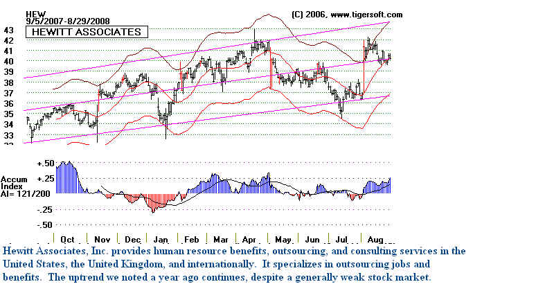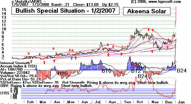 | 3) 1/4/2007 - "Green Companies" are now favored with crude oil up to $100. If you use TigerSoft you can find the very strongest industries and companies. ============================ AKEENA SOLAR ================================ ![]() News 1-2-2008 Akeena Solar (nasdaq: AKNS - news - people ) soared 43.8%, or $3.49, to close at $11.45 after the solar power systems designer announced it penned a licensing agreement with Suntech Power (nyse: STP - news - people ) to distribute its Andalay home solar panel system in Europe, Japan and Australia. Stocks Making New Highs: 12/12/2007 A good tip for job seekers and independent recruiters is to look at the published new highs and lows. Go to http://dynamic.nasdaq.com/asp/52weekshilow.asp?exchange=NYSE&status=HI Make a list of the symbols and check them at Yahoo Finance to see which companies are near you and do work in a field you may have skills in. Use http://finance.yahoo.com/ Look at the NYSE list and the NASDAQ list below to get an idea about how this works. Some days there are a lot more than on other days. Now the stock market has "narrowed". Only a small number of stocks are making new highs. The fact that they are making new highs means their prospects are considered very good by investors. That means that there is a good chance they may be hiring now, perhaps, in the near future. There is a problem, though. At this time most of the stocks are in energy rleated industries. This is more true for the stocks making new highs on the NYSE. If you are interested on high tech jobs, you may want to look at the stocks on the NASDAQ making new highs. A higher percentage of NASDAQ stocks are in high tech fields. NYSE New Highs Celanese Corp. 1601 West LBJ Freeway Dallas, TX 75234-6034 Phone: 972-443-4000 Web Site: http://www.celanese.com Celanese Corporation engages in the production and sale of industrial chemicals primarily in North America, Europe, and Asia. The company operates through four segments: Chemical Products, Technical Polymers Ticona, Acetate Products, and Performance Products. 8900 employees. Covance Inc. 210 Carnegie Center Princeton, NJ 08540 Phone: 609-452-4440 Fax: 609-452-4769 Web Site: http://www.covance.com Covance, Inc., a drug development services company, provides early-stage and late-stage product development services to the pharmaceutical, biotechnology, and medical device industries worldwide. Its early stage development services include preclinical services, such as toxicology services, and pharmaceutical chemistry and related services; and clinical pharmacology services, including first-in-human trials of new pharmaceuticals. 7300 employees DynCorp International Inc 3190 Fairview Park Drive Suite 350 Falls Church, VA 22042 Phone: 571-722-0210 Fax: 571-722-0252 Web Site: http://www.dyn-intl.com DynCorp International, Inc., through its subsidiaries, provides defense, technical, and government outsourced solutions worldwide. The company operates in two segments, Government Services (GS), and Maintenance and Technical Support Services (MTSS). 14,600 employees. EOG Resources, Inc. 1111 Bagby Sky Lobby 2 Houston, TX 77002 Phone: 713-651-7000 Fax: 713-651-6995 Web Site: http://www.eogresources.com EOG Resources, Inc., together with its subsidiaries, engages in the exploration, development, production, and marketing of natural gas and crude oil. 1,570 employees. Flowers Foods Inc. 1919 Flowers Circle Thomasville, GA 31757 Phone: 229-226-9110 Fax: 229-225-3816 Web Site: http://www.flowersfoods.com Flowers Foods, Inc. produces and markets bakery products in the United States. 7,800 employees. Foundation Coal Holdings Inc. 999 Corporate Boulevard Suite 300 Linthicum Heights, MD 21090-2227 United States - Map Phone: 410-689-7500 Web Site: http://www.foundationcoal.com Foundation Coal Holdings, Inc., through its subsidiaries, engages in the extraction, cleaning, and sale of coal from surface and deep mines to electric utilities, steel companies, coal brokers, and industrial users primarily in the United States. 3.150 employees. Plains Exploration & Production Company 700 Milam Street Suite 3100 Houston, TX 77002 Phone: 713-579-6000 Fax: 713-579-6500 Web Site: http://www.pxp.com Plains Exploration & Production Company engages in the acquisition, development, exploitation, exploration, and production of oil and gas properties in the United States. 610 employees. Triple-S Management Corp. 1441 FD Roosevelt Avenue San Juan, PR 00920 Phone: 787-749-4949 Web Site: http://www.ssspr.com Triple-S Management Corporation operates in the insurance industry in Puerto Rico. The company, through its subsidiaries, provides health benefits services to subscribers through contracts with hospitals, physicians, dentists, laboratories, and other organizations; and underwrites life and accident and health insurance policies, and the administration of annuity contracts. 2.250 employees. Ultra Petroleum Corp. 363 North Sam Houston Parkway East Suite 1200 Houston, TX 77060 Phone: 281-876-0120 Fax: 281-876-2831 Web Site: http://www.ultrapetroleum.com Ultra Petroleum Corp. engages in the development, production, operation, exploration, and acquisition of oil and natural gas properties primarily in the Green River Basin, southwest Wyoming and Bohai Bay, offshore China. 68 employees.