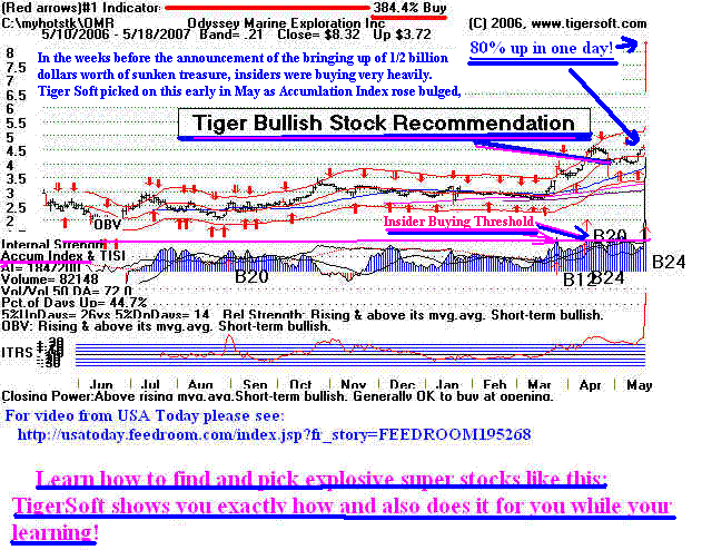 pick at $4.24 on May th. It had just pulled back from 4.70 and successfully tested its rising (red) 21-day ma and received a Tiger Red Buy. It had previously been flagged as a "Buy B12" stock. This is a rare, but very bullish condition. This signal coupled with other major automatic Buys made us recommend it. See how the Tiger Accumulation Index crossed the key threshold we use. This is shown above as a horizontal pink like.