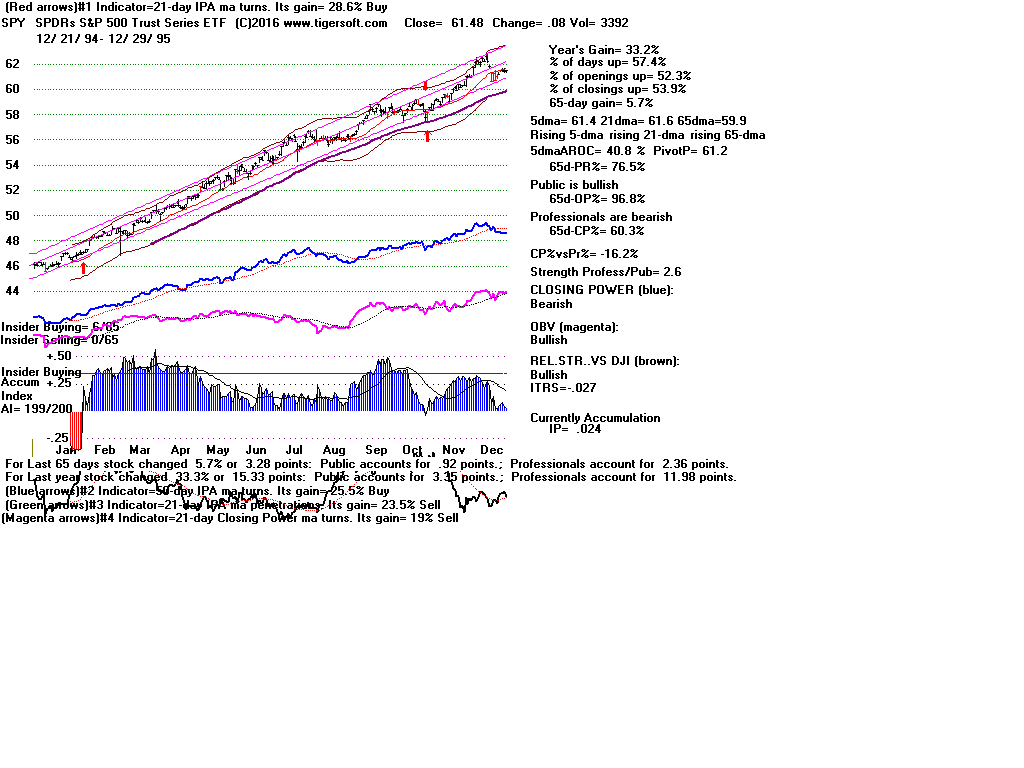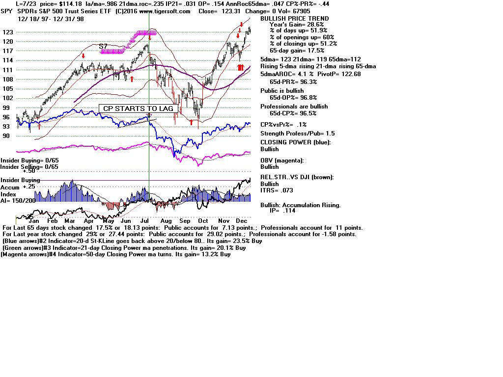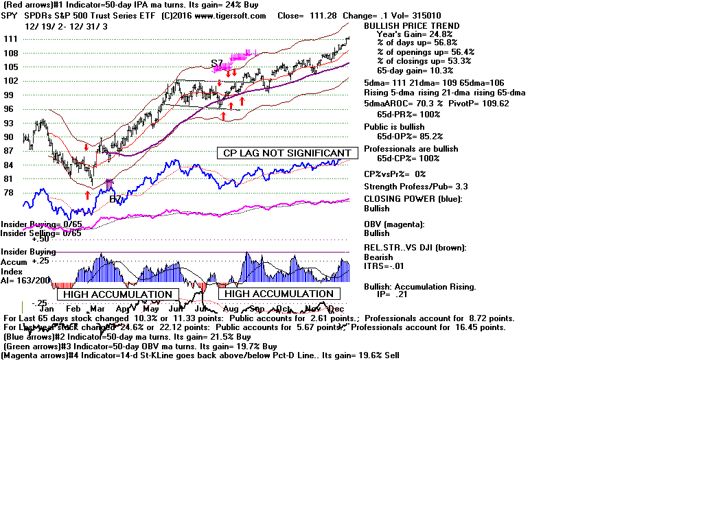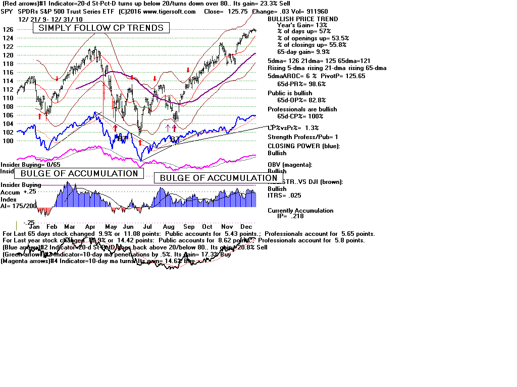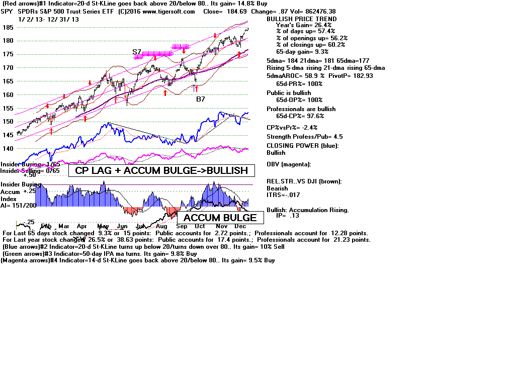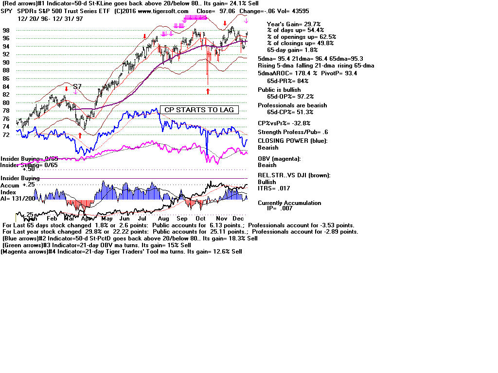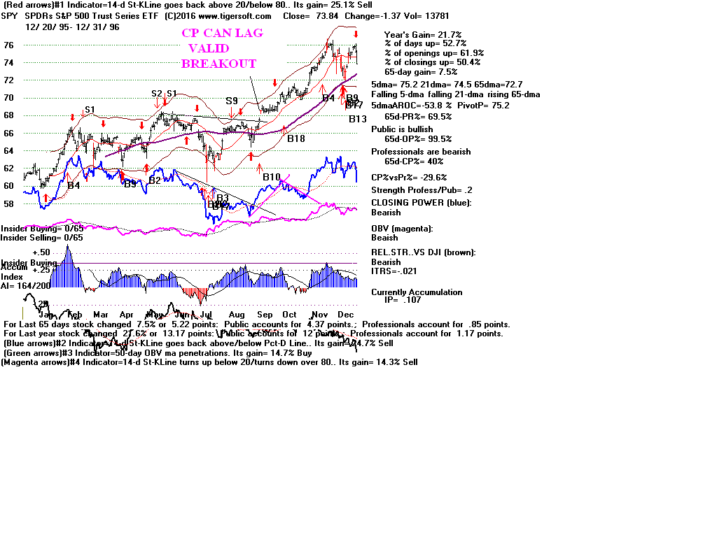 | CLOSING POWER TRENDS AND ACCUMULATION BULGES PREDICT SPY PRICES: 1995 - UNUSUALLY STEADY POSITIVE ACCUMULATION 1996 - CP TEMPORARILY LAGS PRICES AFTER VALID FLAT-TOPPED BREAKOUT. 1997-2002 SPY FALLS AFTER CP LAGS AND CP UPTREND BROKEN 2003 - BULGE OF HIGH ACCUMULATION STARTS BULL MARKET 2004-2005 CP TRENDS GOVERN PRICES TRENDS. 2006 - BULGE OF ACCUM OVERPOWERS LAGGING ACCUM. 2007 - MULTIPLE PEERLESS SELLS and CP S7S ARE DEADLY. 2008-2012 SIMPLY FOLLOW CP TRENDS, ZIGS/ZAGS TO MAKE MONEY 2013-2014 BULGE OF ACCUM OVERPOWERS LAGGING ACCUM. 2015 - CP LAGGED AT TOP. 2016 - SIMPLY FOLLOW CP TRENDS, ZIGS/ZAGS TO MAKE MONEY |