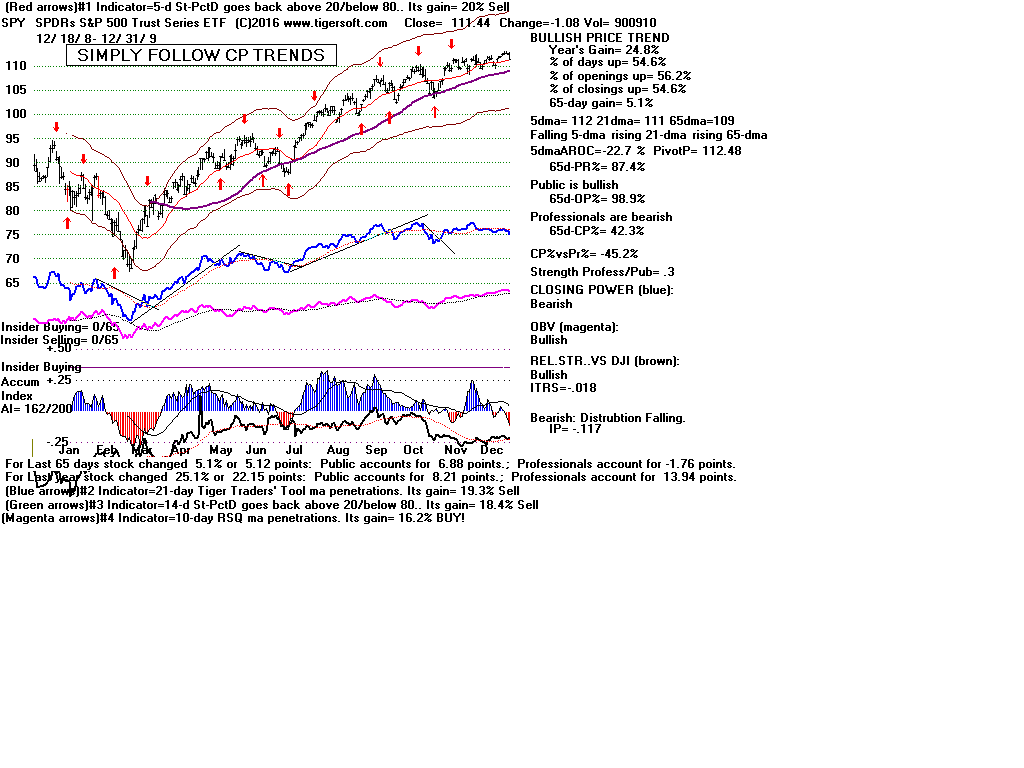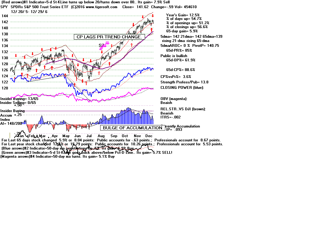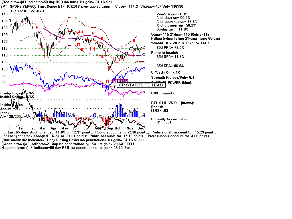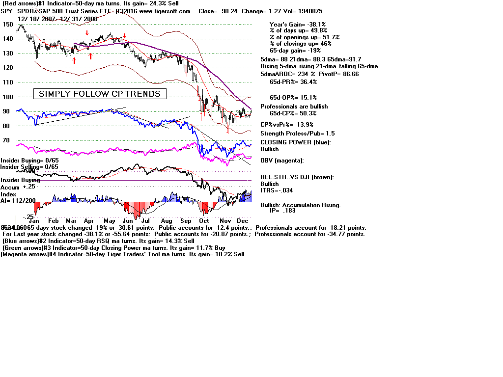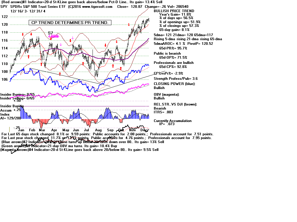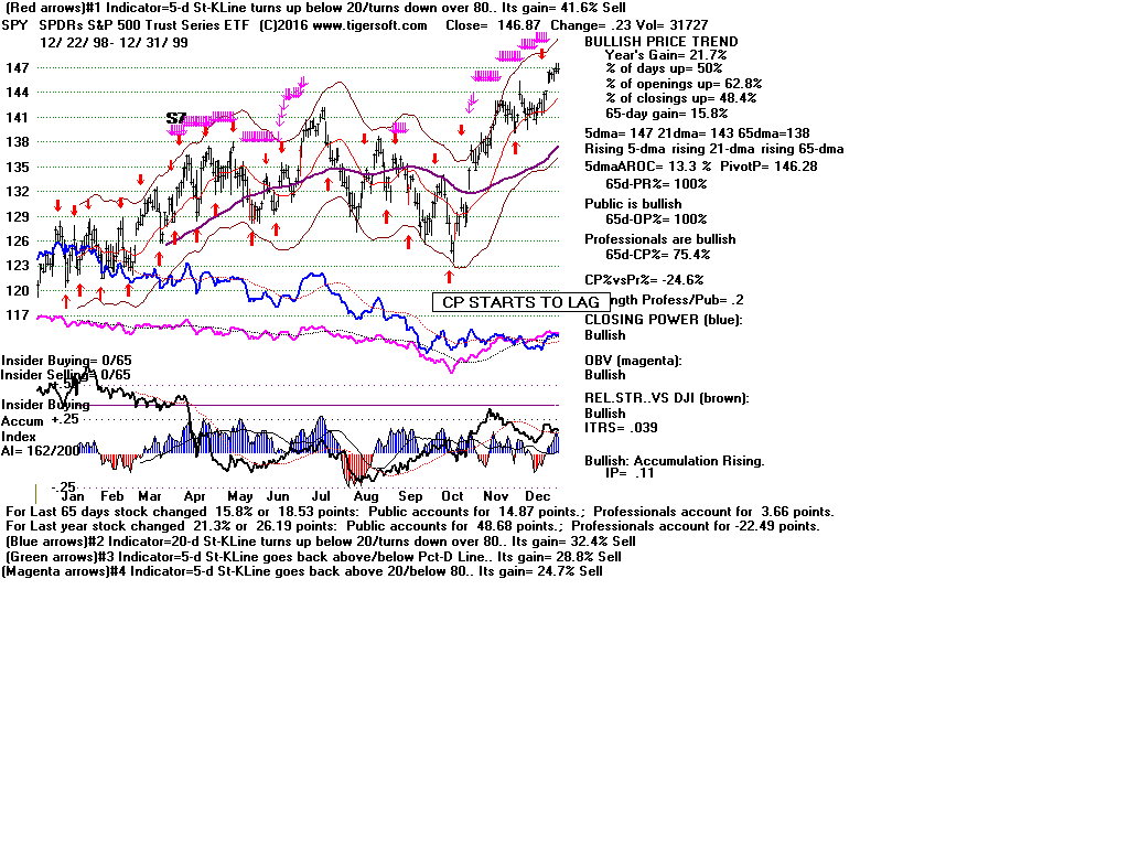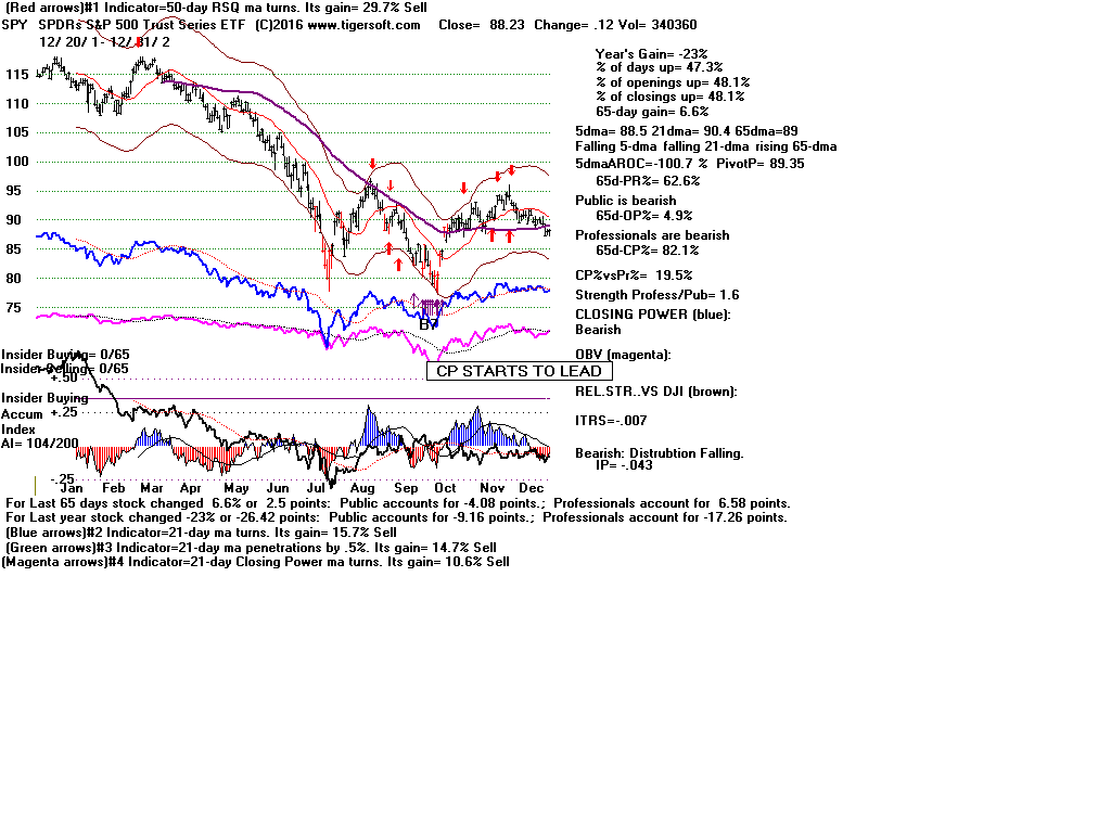 | CLOSING POWER TRENDS AND ACCUMULATION BULGES PREDICT SPY PRICES: 1995 - UNUSUALLY STEADY POSITIVE ACCUMULATION 1996 - CP TEMPORARILY LAGS PRICES AFTER VALID FLAT-TOPPED BREAKOUT. 1997-2002 SPY FALLS AFTER CP LAGS AND CP UPTREND BROKEN 2003 - BULGE OF HIGH ACCUMULATION STARTS BULL MARKET 2004-2005 CP TRENDS GOVERN PRICES TRENDS. 2006 - BULGE OF ACCUM OVERPOWERS LAGGING ACCUM. 2007 - MULTIPLE PEERLESS SELLS and CP S7S ARE DEADLY. 2008-2012 SIMPLY FOLLOW CP TRENDS, ZIGS/ZAGS TO MAKE MONEY 2013-2014 BULGE OF ACCUM OVERPOWERS LAGGING ACCUM. 2015 - CP LAGGED AT TOP. 2016 - SIMPLY FOLLOW CP TRENDS, ZIGS/ZAGS TO MAKE MONEY |