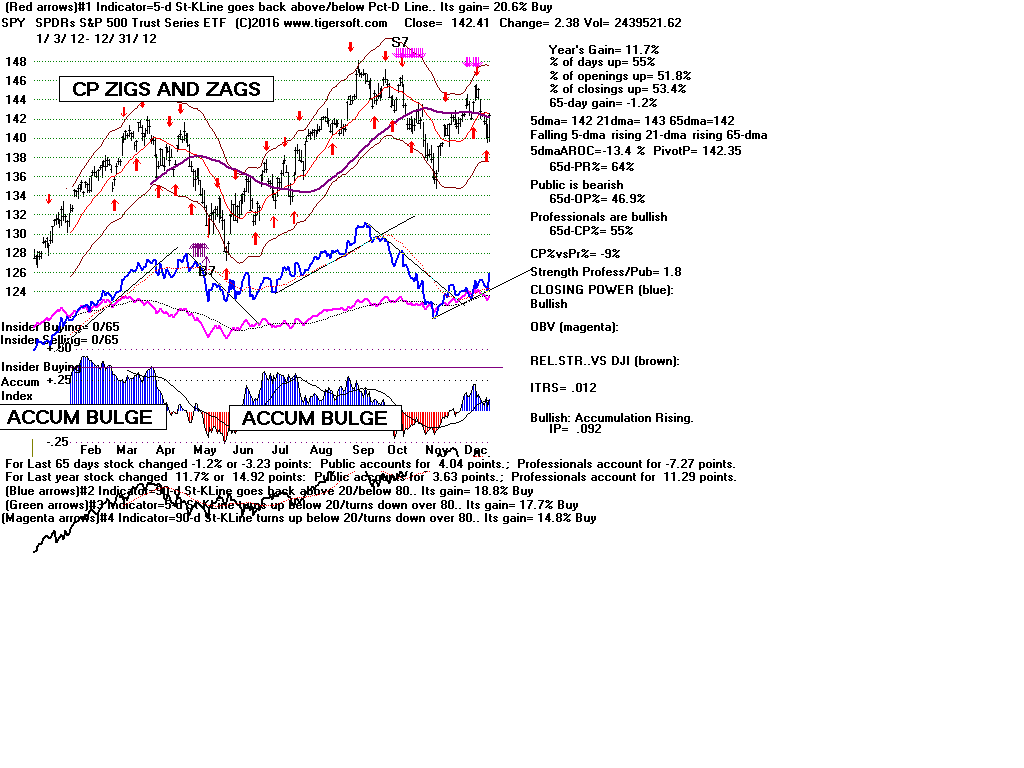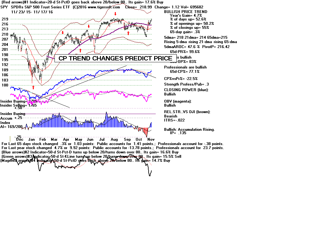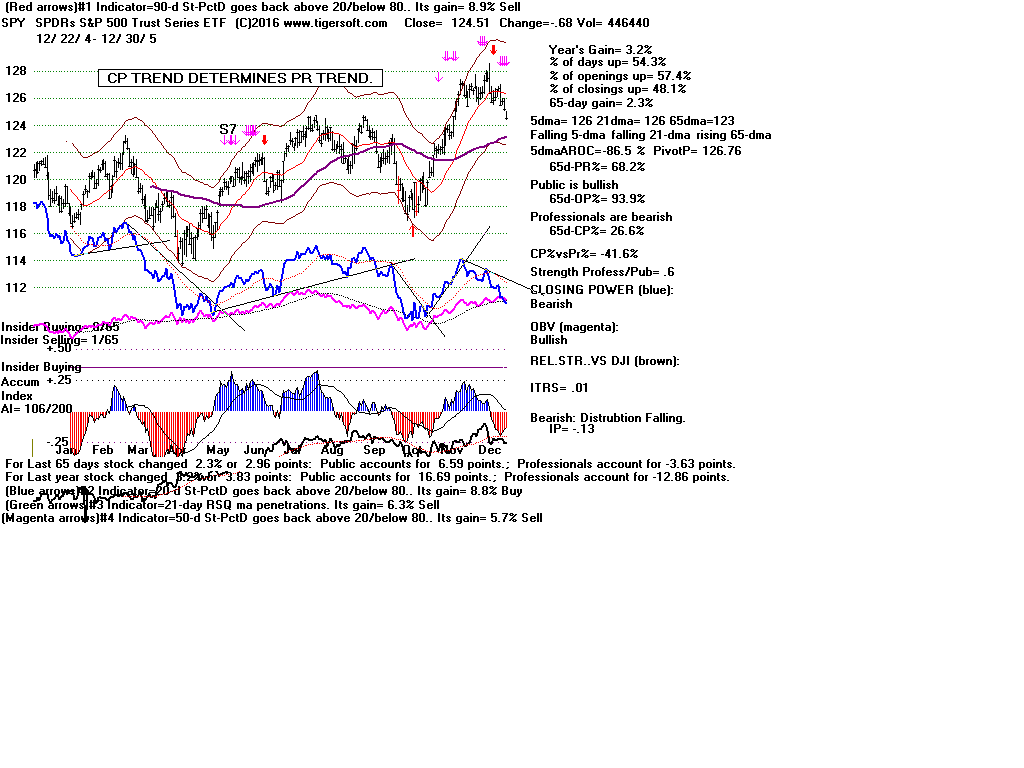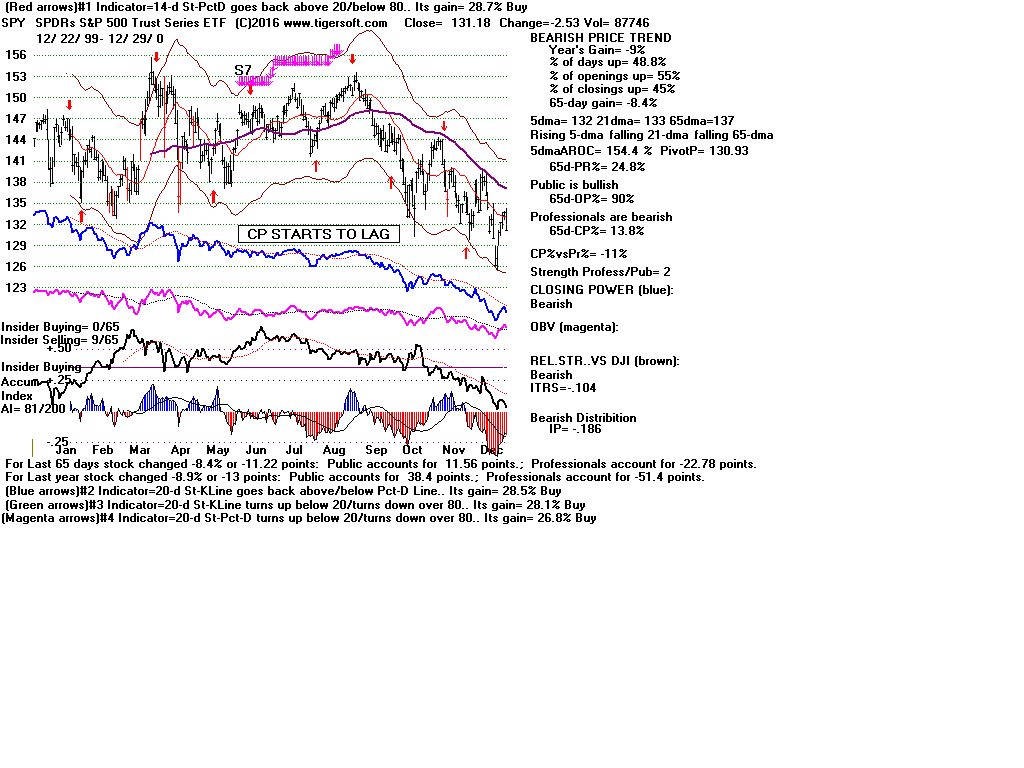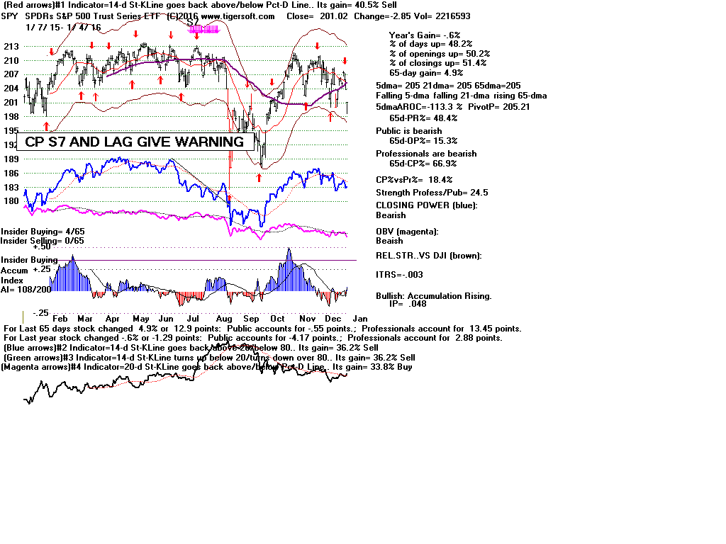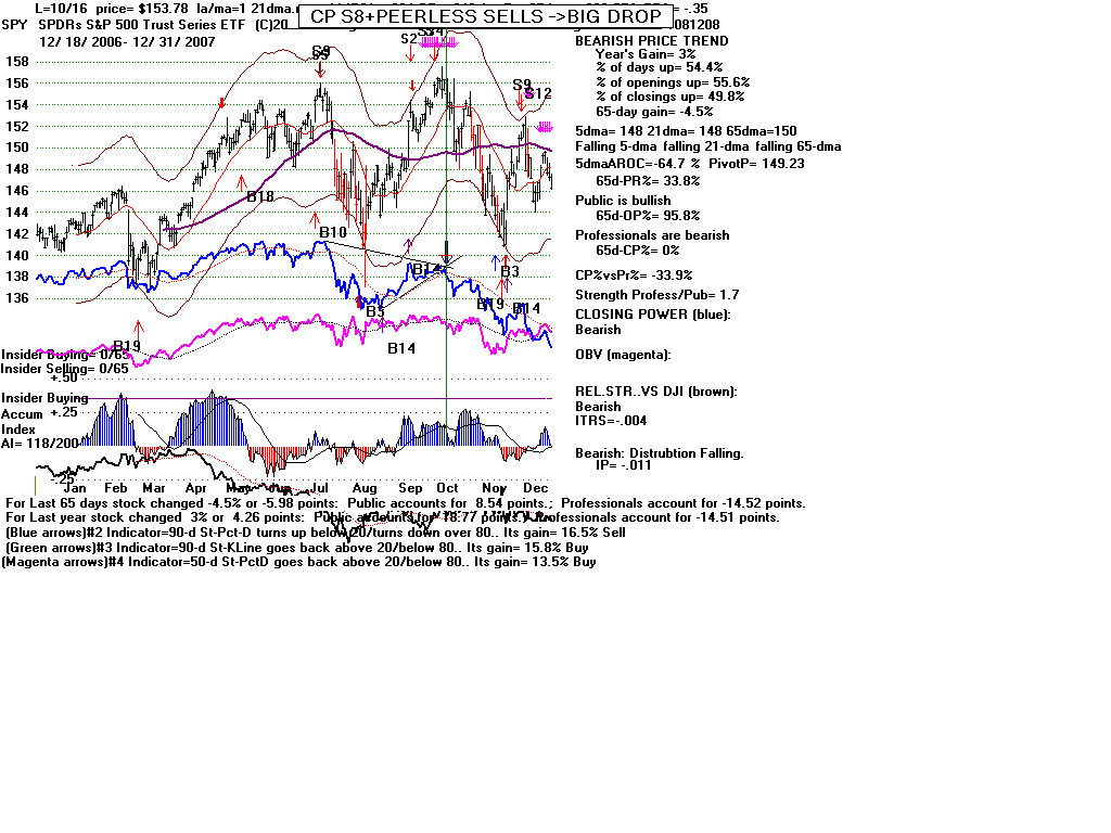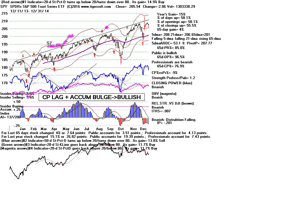 | CLOSING POWER TRENDS AND ACCUMULATION BULGES PREDICT SPY PRICES: 1995 - UNUSUALLY STEADY POSITIVE ACCUMULATION 1996 - CP TEMPORARILY LAGS PRICES AFTER VALID FLAT-TOPPED BREAKOUT. 1997-2002 SPY FALLS AFTER CP LAGS AND CP UPTREND BROKEN 2003 - BULGE OF HIGH ACCUMULATION STARTS BULL MARKET 2004-2005 CP TRENDS GOVERN PRICES TRENDS. 2006 - BULGE OF ACCUM OVERPOWERS LAGGING ACCUM. 2007 - MULTIPLE PEERLESS SELLS and CP S7S ARE DEADLY. 2008-2012 SIMPLY FOLLOW CP TRENDS, ZIGS/ZAGS TO MAKE MONEY 2013-2014 BULGE OF ACCUM OVERPOWERS LAGGING ACCUM. 2015 - CP LAGGED AT TOP. 2016 - SIMPLY FOLLOW CP TRENDS, ZIGS/ZAGS TO MAKE MONEY |