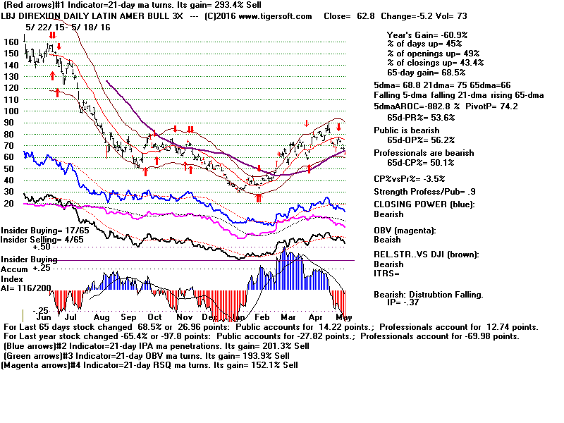 1045.3 DGAZ 17.95 16.39 14.72 1.3 -.07 103 Rising ? .534 bullish --------------------------------------------------------------------------------------------- 795.1 BZQ 36.43 33.87 31.25 1.95 .03 54 Rising Rising .534 bullish --------------------------------------------------------------------------------------------- 743.2 DUST 15.38 13.72 14.1 2.88 .06 68 Falling ? .47 bullish --------------------------------------------------------------------------------------------- 587.9 DYY 2.25 2.18 2.16 .06 -.27 46 Rising ? .301 bullish --------------------------------------------------------------------------------------------- 491 DSLV 33.8 32.39 32.44 2.27 .25 142 Falling Rising .486 bullish --------------------------------------------------------------------------------------------- 454 UWTI 35.07 34.53 32.85 -1.89 .07 82 Rising Rising .418 bearish --------------------------------------------------------------------------------------------- 409.5 DRV 15.7 14.77 14.22 .67 -.14 50 Rising Falling .454 bullish --------------------------------------------------------------------------------------------- 330.2 EDZ 40.5 39.42 38.24 1.21 .27 65 Rising Rising .554 bullish --------------------------------------------------------------------------------------------- 329.8 SBND 3.83 3.69 3.71 .19 .04 84 Rising Falling .45 vol.fell on up-day --------------------------------------------------------------------------------------------- 317.6 UCO 12.58 12.43 12.02 -.43 .07 82 Rising Rising .422 bearish --------------------------------------------------------------------------------------------- 317.1 ZSL 40.38 39.27 39.28 1.8 .21 121 Falling Rising .494 bullish --------------------------------------------------------------------------------------------- 242.9 BIB 40.9 39.48 37.71 1.05 .01 139 Falling Falling .482 bullish --------------------------------------------------------------------------------------------- 233.6 SRS 39.89 38.44 37.62 1.07 -.15 63 Rising Falling .458 bullish --------------------------------------------------------------------------------------------- 232.5 TMV 21.1 20.4 20.43 .81 -.02 78 Rising Falling .43 bullish --------------------------------------------------------------------------------------------- 219.2 EEV 22.02 21.62 21.17 .43 .51 71 Rising Rising .554 bullish --------------------------------------------------------------------------------------------- 210.2 MIDZ 37.93 37.17 36.62 .3 .02 82 Rising Falling .506 vol.fell on up-day --------------------------------------------------------------------------------------------- 195.7 DAG 4.19 4.12 4.04 -.03 .12 58 Rising Rising .438 bearish --------------------------------------------------------------------------------------------- 195.2 DRR 55.5 54.71 53.92 .88 .03 88 ? Rising .506 vol.fell on up-day --------------------------------------------------------------------------------------------- 186.6 EUO 23.86 23.47 23.21 .43 .43 60 ? Rising .514 bullish --------------------------------------------------------------------------------------------- 174.4 TYO 14.53 14.14 14.12 .47 .41 119 Falling Rising .414 bullish --------------------------------------------------------------------------------------------- 170.9 YANG 28.96 28.56 28.14 .66 .29 69 Rising Rising .55 bullish --------------------------------------------------------------------------------------------- 161.2 GLL 78.73 77.07 77.43 2.77 .04 116 Falling Rising .514 bullish --------------------------------------------------------------------------------------------- 158.7 SOXL 23.56 22.5 21.64 1.09 -.09 134 Falling Rising .514 bullish --------------------------------------------------------------------------------------------- 156.2 TBT 36.89 36.06 36.08 .96 -.01 85 Rising Falling .434 bullish --------------------------------------------------------------------------------------------- 156.8 YCS 72.86 71.54 71.39 1.44 .11 111 ? Rising .518 bullish --------------------------------------------------------------------------------------------- 155 DZZ 5.96 5.84 5.86 .19 .07 112 Falling Rising .498 bullish --------------------------------------------------------------------------------------------- 136.2 SMN 28.77 28.05 27.91 1.13 .28 90 ? Rising .518 bullish --------------------------------------------------------------------------------------------- 133.9 PST 21.37 21.02 20.94 .34 .13 111 Rising Rising .446 bullish --------------------------------------------------------------------------------------------- 133.9 TZA 42.94 42.78 42.45 -.64 .01 64 Rising Rising .502 bearish --------------------------------------------------------------------------------------------- 130.3 SDOW 15.96 15.81 15.54 -.03 -.08 39 Rising Falling .458 bearish --------------------------------------------------------------------------------------------- 130.7 SRTY 28.15 28.07 27.85 -.48 .02 75 Rising Rising .51 bearish --------------------------------------------------------------------------------------------- 129.2 MZZ 36.58 36.16 35.69 .03 -.08 48 Rising Falling .494 bullish --------------------------------------------------------------------------------------------- 113.5 SPXU 29.03 28.76 28.37 .02 -.1 31 Rising Falling .494 bullish --------------------------------------------------------------------------------------------- 109 FXP 47.87 47.44 46.94 .68 .31 66 Rising Rising .546 vol.fell on up-day --------------------------------------------------------------------------------------------- 106.8 SDD 34.75 34.29 33.53 -.35 .72 109 ? Rising .345 vol.fell on down-day --------------------------------------------------------------------------------------------- 101.7 SPXS 15.41 15.29 15.07 -.02 -.1 29 Rising Falling .478 bearish --------------------------------------------------------------------------------------------- 90.5 DXD 18.98 18.85 18.61 -.03 -.09 35 Rising Falling .47 bearish --------------------------------------------------------------------------------------------- 90.6 TWM 38.86 38.76 38.55