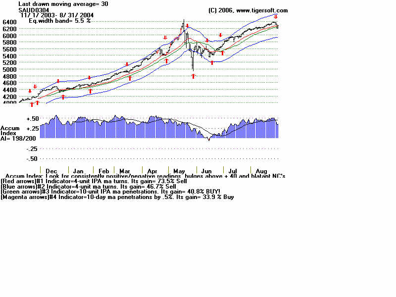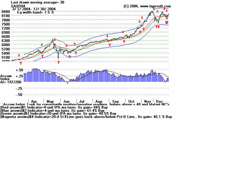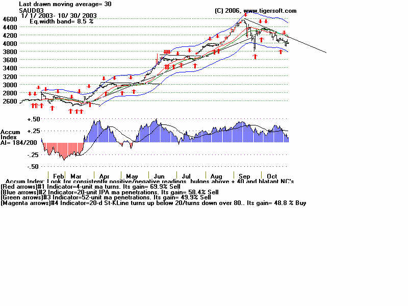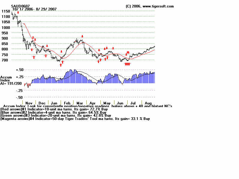 SAUDI STOCKS VIEWED WITH TIGER SOFTWARE (C) 2008 William Schmidt, Ph.D. - www.tigersoft.com All Saudi Index: 2003, 2003-4, 2004, 2004-5, 2005, 2005-6, 2006, 2006-7, 2007-8 Some of Saudi charts have had their values divided by 10 for better graphing. Sample: Top line shows best trading system for Stock. Red Buys and Sells. 110.3% Gain buying and selling short on signals. ![]() |