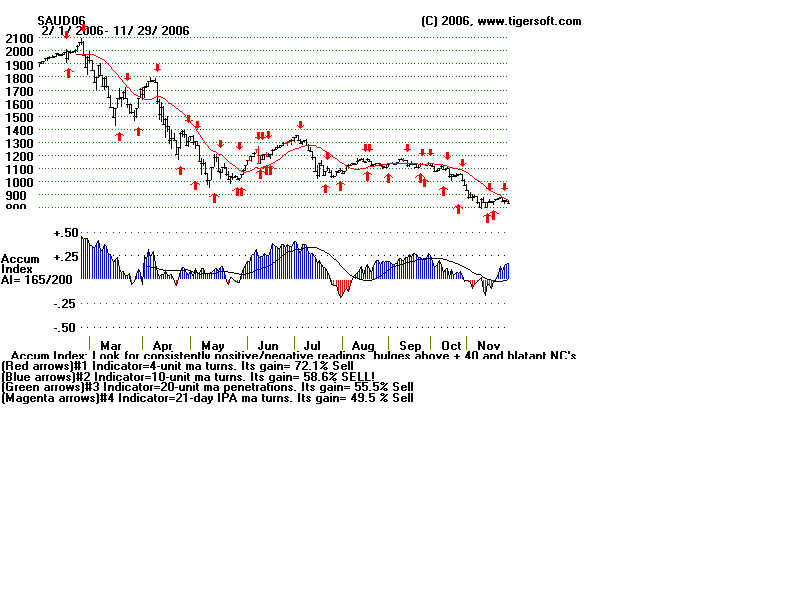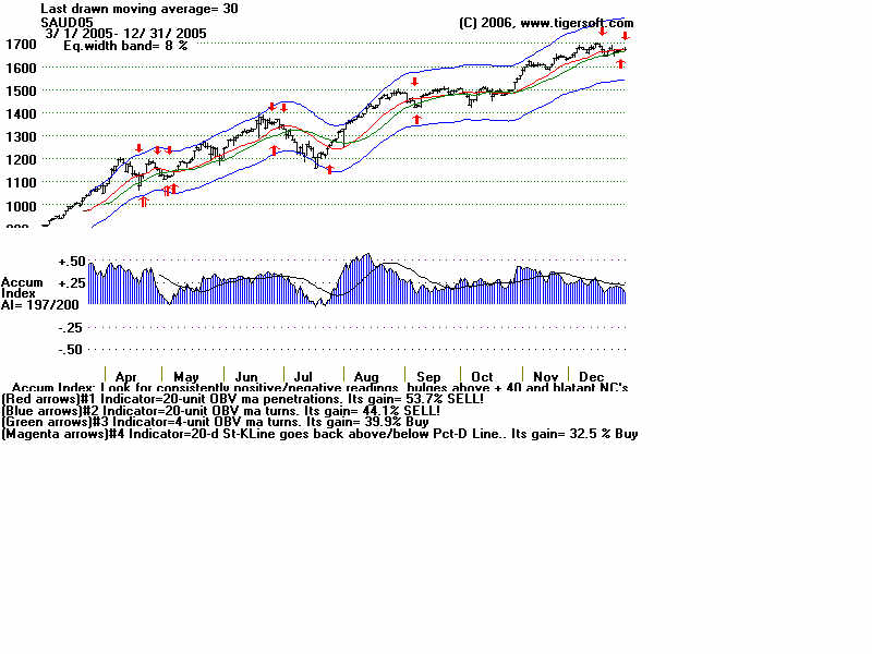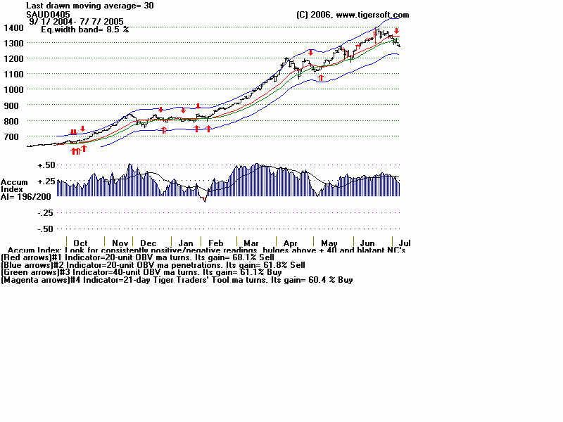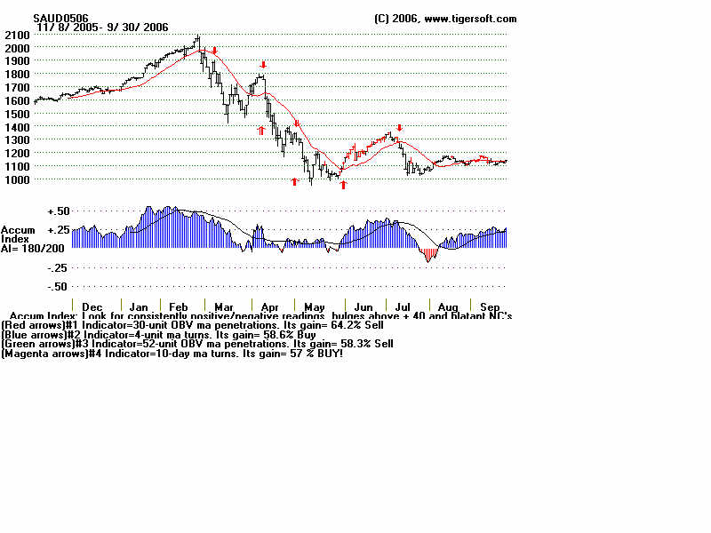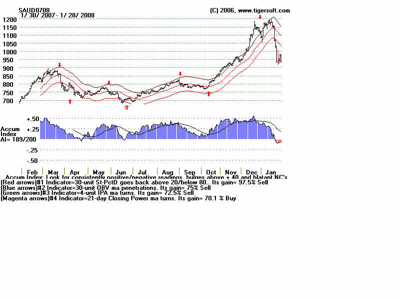Stock TigerSoft worked well Optimum Trading Returns TigerSoft did not predict a big move. (11-12 months) ---------------------------------------------------------------------------------------------------------------------------- Riyad Bank insider buying at bottom. 121.1% No warning at top. ![]() Al-Jazira Bank Heavy Accum. at bottom. 124.6% Saudi Bank 130.2% Dec-Jan decline despite high AI. Hollandi Bank insider selling at top. 183.5% Fransi Bank 116.5% Dec-Jan decline despite high AI British Bank Timely high Accumulation 94.6% now head/shoulders top. ![]() Arab Bank Bulge of accum. at move's start. 127.2% Dec-Jan decline despite high AI Samba Bank Bullish high AI at start 107% Dec-Jan decline despite high AI Al Rajhi Bank Turned called in August 149.3% Albilad Bank February top showed distrib. 68.1% BANKING Shares Index Good at August take-off 122.5% Dec-Jan decline despite high AI. ![]() Sabic classic inverted head and shoulders 66.6% Safco Good OBV on breakout 66.9% Classic breakout in October (SARCO) Steady distribution and weak 163.6% Ceramic high relative strength 78.2% SAVOLA Bullish accum at bottom 103.5% ![]() Altsnea 104.7% MedicalCorp 180.1% National Gas 43.2% Gypsum 87.6% ![]() Food steady distribution and weak 126.3% Cables Strong OBV predicted nice breakout 87.8% Saudi Advanced 93.7% Saudi Industrial Easy to trade profitably 159.1% ![]() Al Ahsa weak Accum. and price weakness 73.4% Glass 137.7% Amiantit Bulge of Accum in early Sept. 142.3% Alujain Big Bulge of Accum at bottom 140.9% ![]() Fipco steady distribution and weak 72.5% SISCO 192% Pipes Easy to Trade Profitably! 161.8% ![]() NAMA Bulge of Accum at bottom 89.9% ![]() Metal Steady distribution last 4 months 159.0% ![]() Chemical Based with good Accumulation 131.7% ![]() Zamil Heavy distribution since November peak 110.3% ![]() Saudi Group Accumulatin and then advance 132.1% Sahara Intense buying at bottom 140.9% Big Jan. drop without distribution. Sadafco Heavy Distribution since October 251.5% ![]() Almarai Breakout bulge of Accum. in Oct. 134.6% YENSAB- Bulge of Accum at bottom 144.3% ![]() Paper Manufacturing heavy distribution 95.5% ![]() Sipchem 142.6% Al-Babta 158.8% APPC Bulge of Accum at bottom 132.8% ![]() =================================================================================== Unexpected Data Priblems after this. AlAbdullatif -- SVCP MESC Industrial Shares Index Arabian Cement Yamama Cement Saudi Cement Qassim Cement Southern Cement Yanbu Cement Eastern Cement Tabuk Cement Cement Shares Hotels Saudi Real Estate Shipping Public Transport Cars ANAAM HOLDING Tihama Aseer Taibah Makkah Mubarrad Al Baha Saudi Export Arriyadh Develop Thimar Shams Fitaihi Jarir Aldrees Research Emaar Red Sea AlHokair Budget Saudi Kingdom Services Shares Index Electricity Electrical Shares Index Nadec Al Gassim Agricultural Hail Agricultural Tabuk Agricultural Fisheries Ash-Sharqiyah Agricultural Al Jouf Agricultural Bisha Agricultural Gazan Agricultural Agricultural Shares Index Saudi Telecom Etihad Etisalat Telecom Index Insurance Malath Insuranc SALAMA Arabian Shield SABB Takaful SANAD SAICO Saudi Indian Gulf Union ATC Al-Ahlia ACIG Insurance Shares Index All Shares Index |