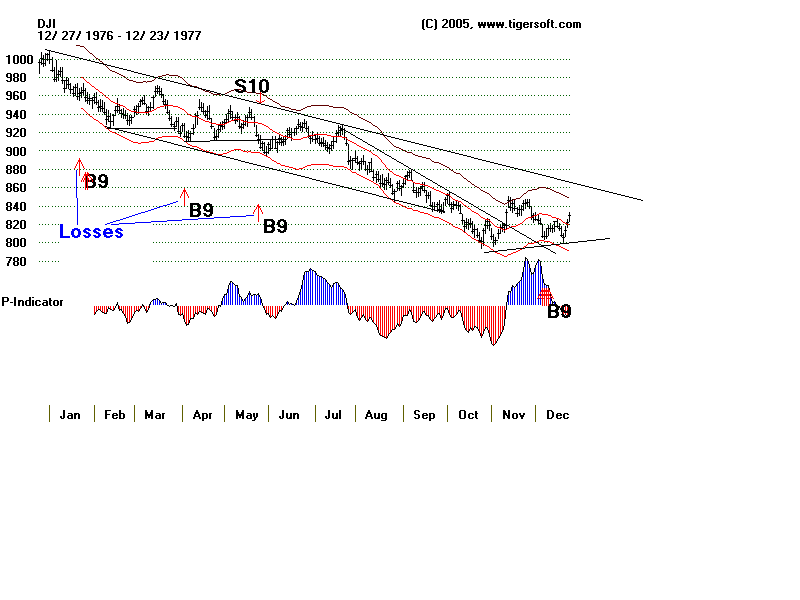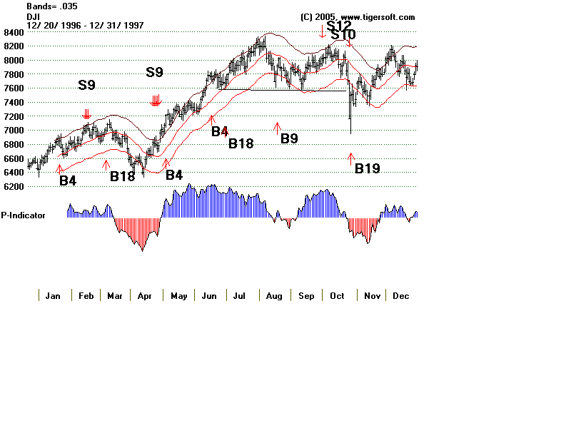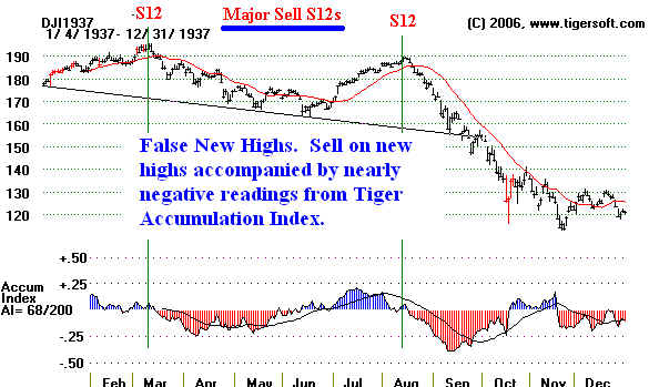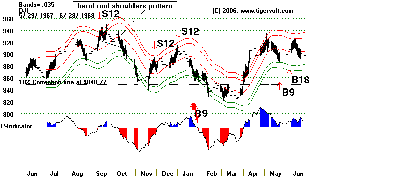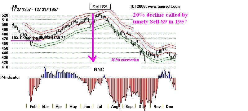 ..................................................................................................................................................... 1947 Peak was at 184 on 2/11... Fell to 163.60 on May 20. ...10.9% decline On going- bear market which was started with major "Sell S12" on October 14, 1946 ...................................................................................................................................................... 1957 Peak was at 521 on 7/12... Fell to 419.80 on October 22. ...19.4% decline Classic "Sell S9" at upper 3.0% band. "Sell 12": Tip off was Accum.Index was <+.05 at upper 3% band. Credit crunch. Sputnik ![]() ..................................................................................................................................................... 1967 Peak was at 943 on 9/25... Fell to 826 on March 22. ...12.4% decline Timely Major Sell ![]() ..................................................................................................................................................... 1977 On-going bear market which did not bottom until March 1978... ...19.0% decline ...................................................................................................................................................... 1987 Peak was at 2702 on 8/26... Fell to 1739 on October 19. ...35.6% decline 10/1 at 2639 "Sell 12": 10/2 at 2640 Classic "Sell S9" 34.1% decline ![]() ...................................................................................................................................................... 1997 Peak was at 8015.5 on 10/1... Fell to7498 on 10/28 6.5% decline "Sell 12": ...................................................................................................................................................... 2007 ???? DJI |