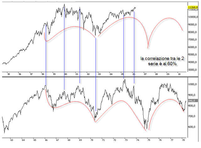 a chart to show that today's Dow is following the 1970's Dow's pattern with an eerie