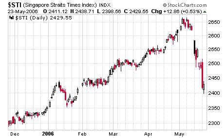 Straits Times Index, down 250 points, or 9.4 percent: