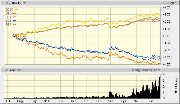 DIA, SDS, SPY, QID, QQQQ 1-yr chart: