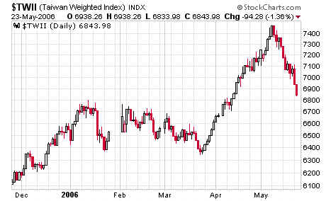 Taiwan's Weighted Index, fell 700 points, or 9.3 percent: