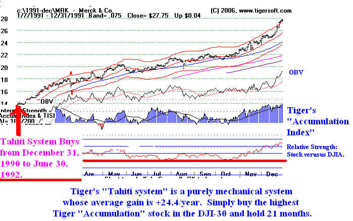 We have run our tests on the 30 DJI stocks partly because of their added safety. Investors should not underestimate the importance of safety in a market that has risen so far since 1982. We also chose the DJI stocks for our studys sample because we wanted no one to believe we had chosen our sample simply to prove our theory. Now you can readily reap the benefits of this new discovery. Simply subscribe to my Nightly E-Mail Service ($80/month) or subscribe to my nightly Peerless Hotline or run our Power-Stock-Ranker Software on a regular basis. Then buy the highest ranked stock and sell it, say, 21 months later. The Tiger Power-Stock-Ranker package includes a 6 months subscription to the bi-weekly newsletter, a Nightly Hotline and a Weekly Screening of 11,000+ stocks for those with the highest Accumulation Index score as ranked by the TIGER system. The performance of our top TIGER Accumulation Index picks is now proven. My new 225 page book, Twenty Six Percent a Year Can Make You Rich documents and discusses each trade from 1970 to 1994.