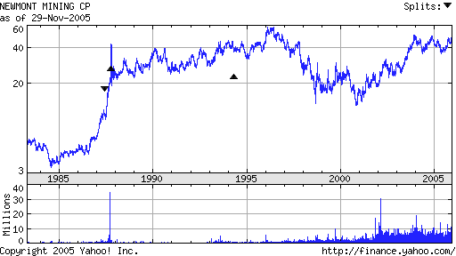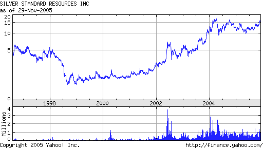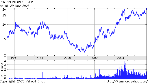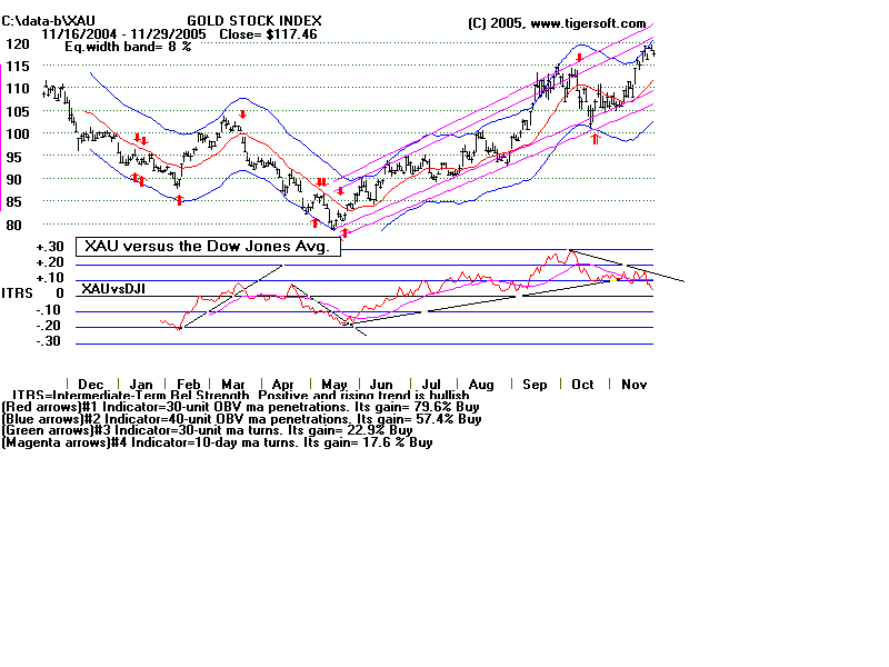 GOLD Is GLEAMING, SILVER is SHINING (C) 2005 - William Schmidt, Ph.D. 11/29/2005 Gold has just risen over $500 an ounce. This is considered an important psychological breakout. The Gold Stock Index (XAU) is one way investors can play their sense of international uncertainty and the long-term double whammy on the US dollar from the record high US Treasury deficit and the massive US Trade Imbalance that grows month after month. Silver has just surpassed $8.00 for the first time in more than 20 years. Some comments elsewhere. Tiger Users should look at the longest term charts available. These are easily found on YAHOO. Linked here are the Yahoo charts of NEM, PAAS and SSRI. They show that significant price breakouts are at hand. They are quite bullish. Here are some others' comments on these stocks. Investors should also use the TigerSoft weekly and daily charts. These show price trends, price breakouts, Big Money Accumulation (This is a Tiger invention dating back to 1981.) and Relative Strength. Here we compare three stocks, NEM (Newmont Mining - the world's largest gold producer, PAAS (Pan American Silver) and SSRI (Silver Stand Res. ) with the XAU (Gold Stock Index). Look also for the automatically produced red Buys and Sells arrows. These show you Buys and Sells using a process that finds the best trading system from over 60 for the period shown. These should help investors better time their purchases and sales, whether it be stocks, mutual funds, options, futures, currencies or commodities. We are especially interested in silver because it ran to more than $40 an ounce in 1980 as a result of a short squeeze promoted by Bunker Hunt from Texas. Silver has just broken above $8.00 an ounce. Compare its action now with what happened in the 1978-1980 period. ![]() |